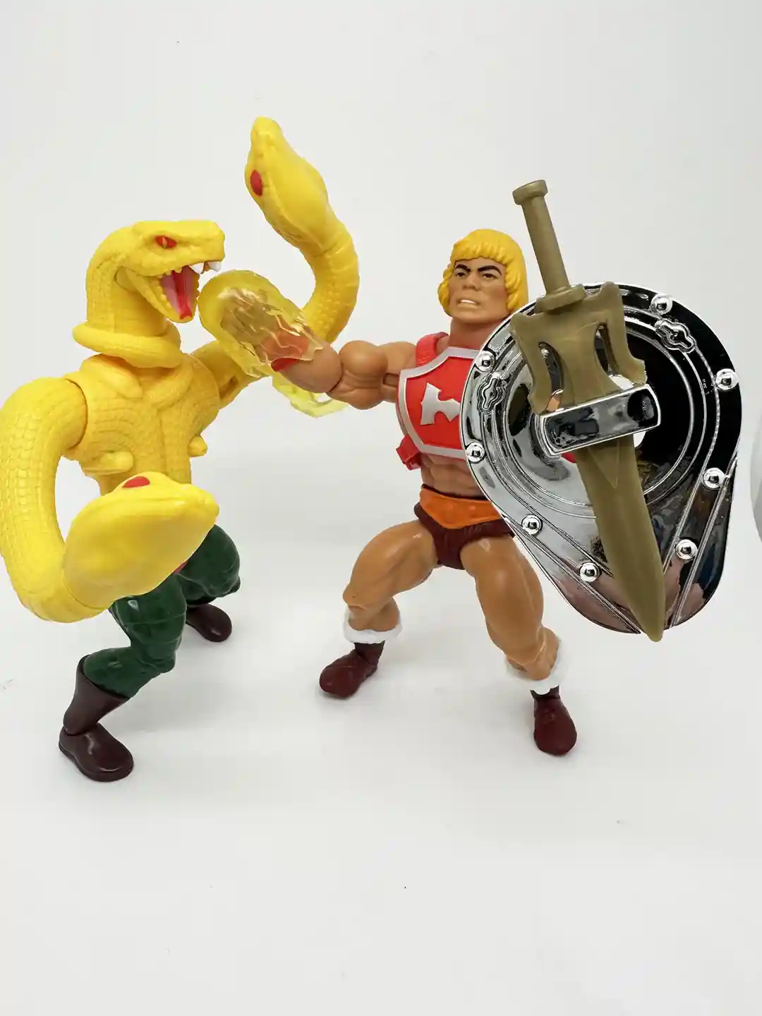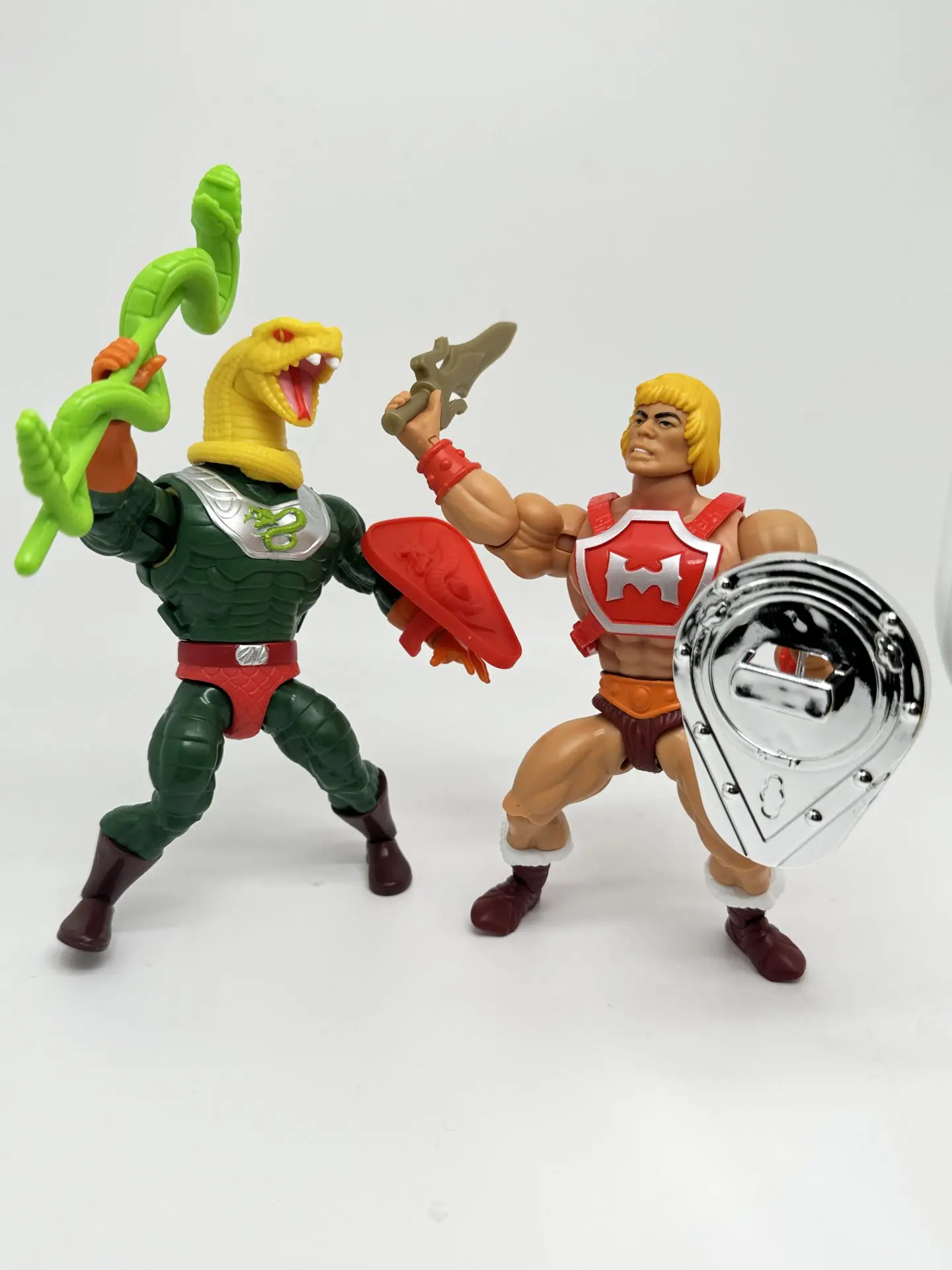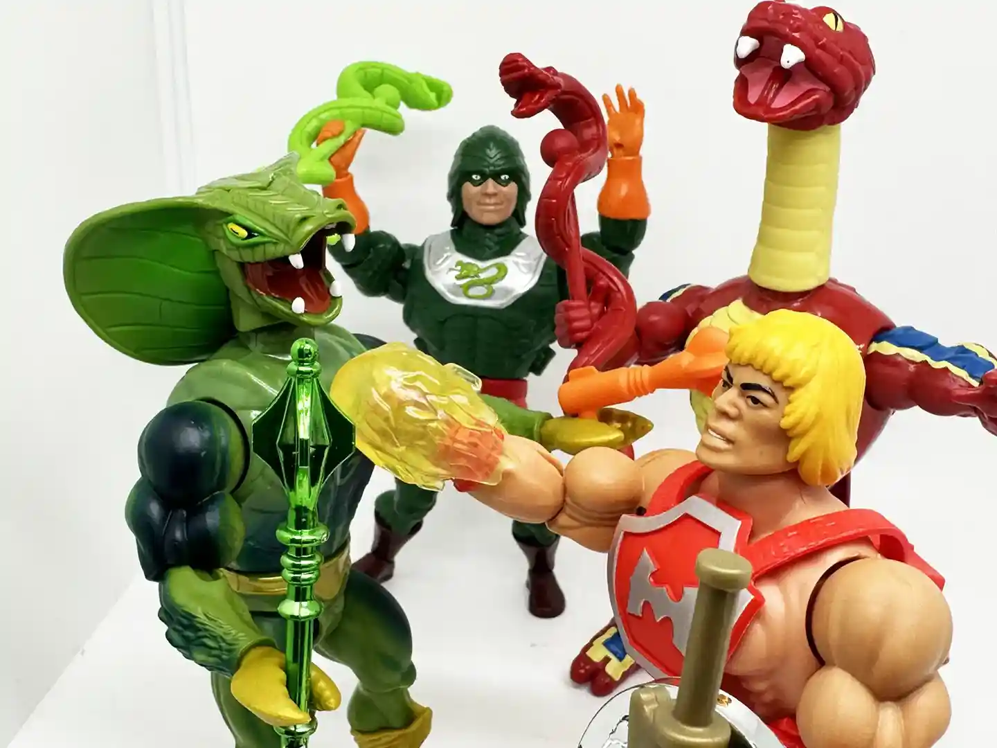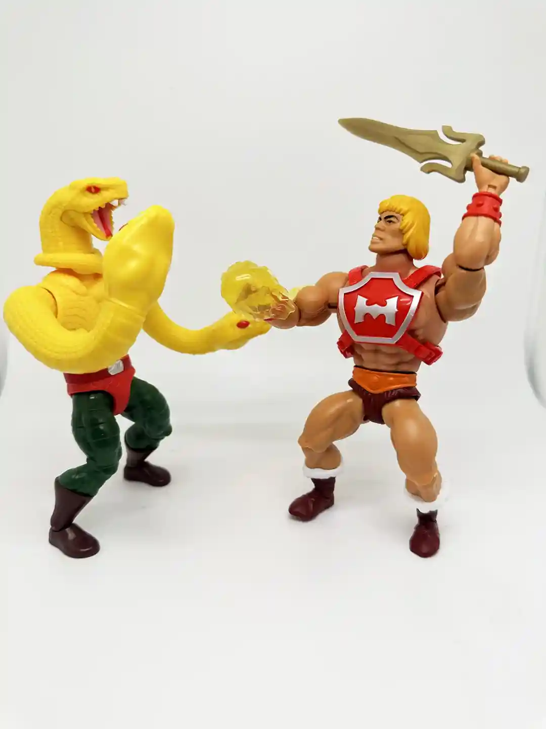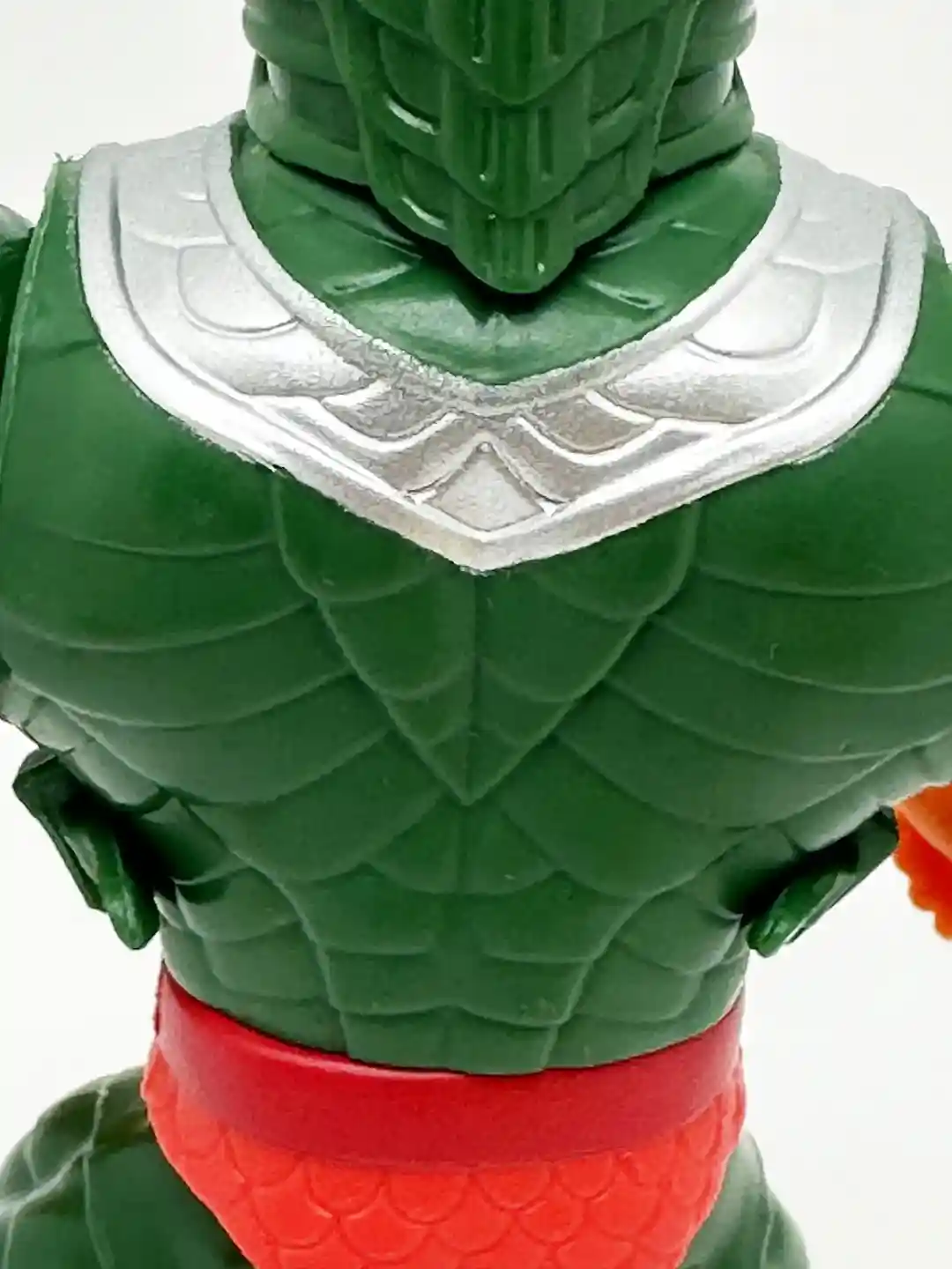 King Hiss has all new sculpt for his arms. Just like the vintage figure, his arms are the color of his green armor, and have scaled horizontal snake design that lead down to his orange gloves. His arms are removeable and can be swapped out for his yellow snake arms!