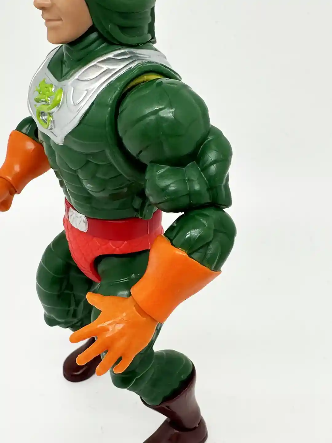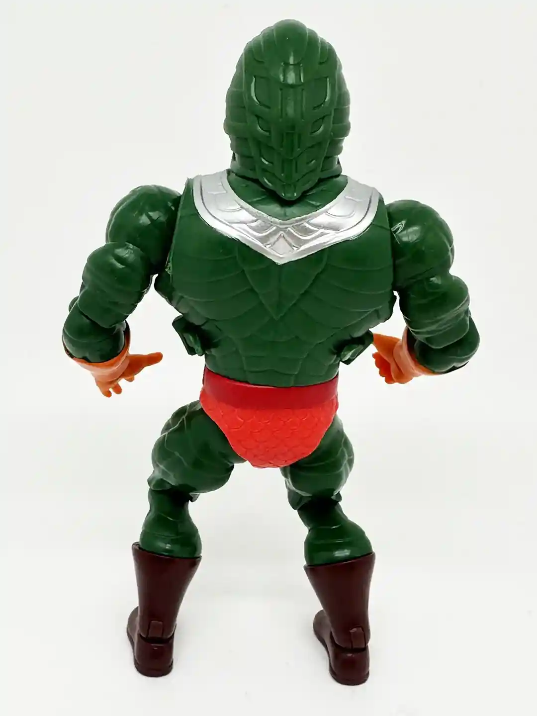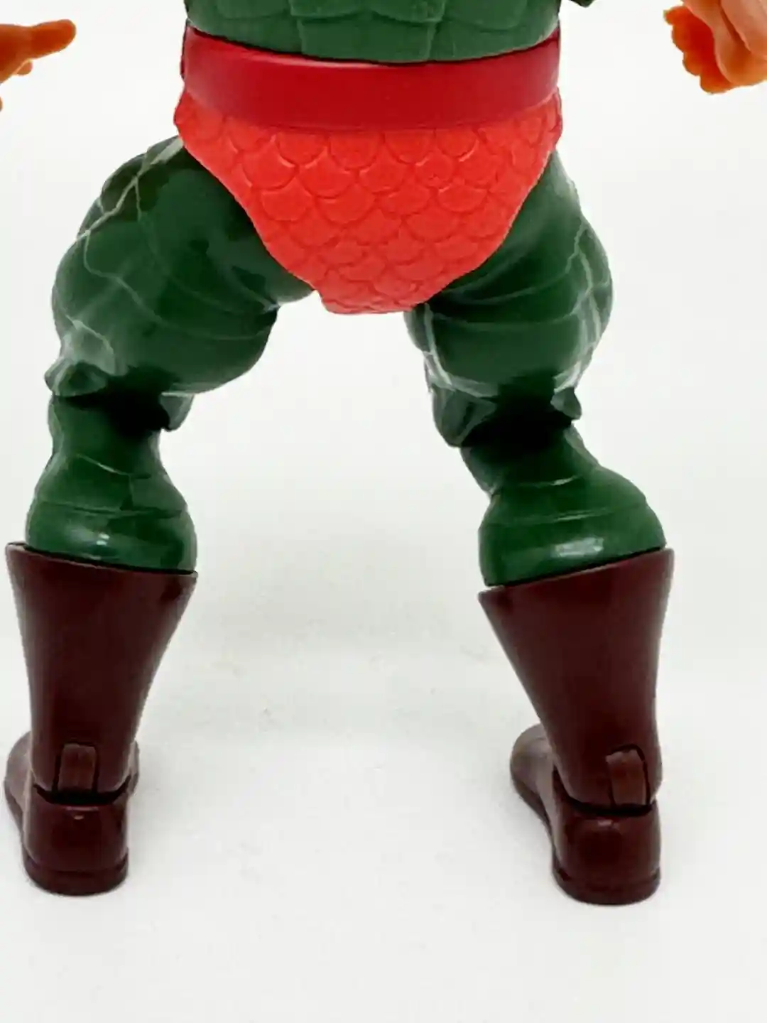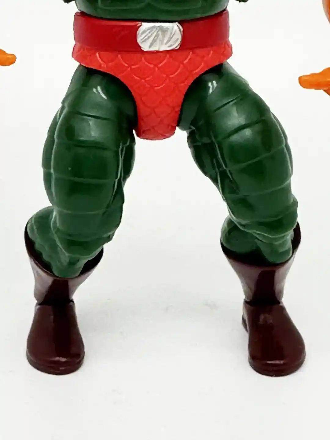 Just like the vintage figure, King Hiss is wearing a red belt, with a silver belt bunckle. He has on bright red scaly shorts and is wearing horizontaly scaled green pants with brown boots.