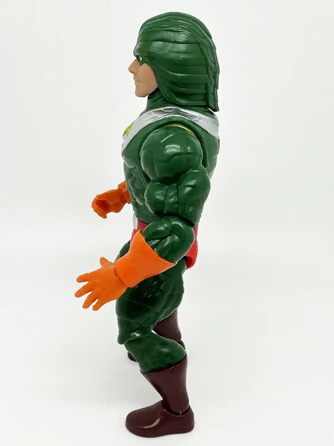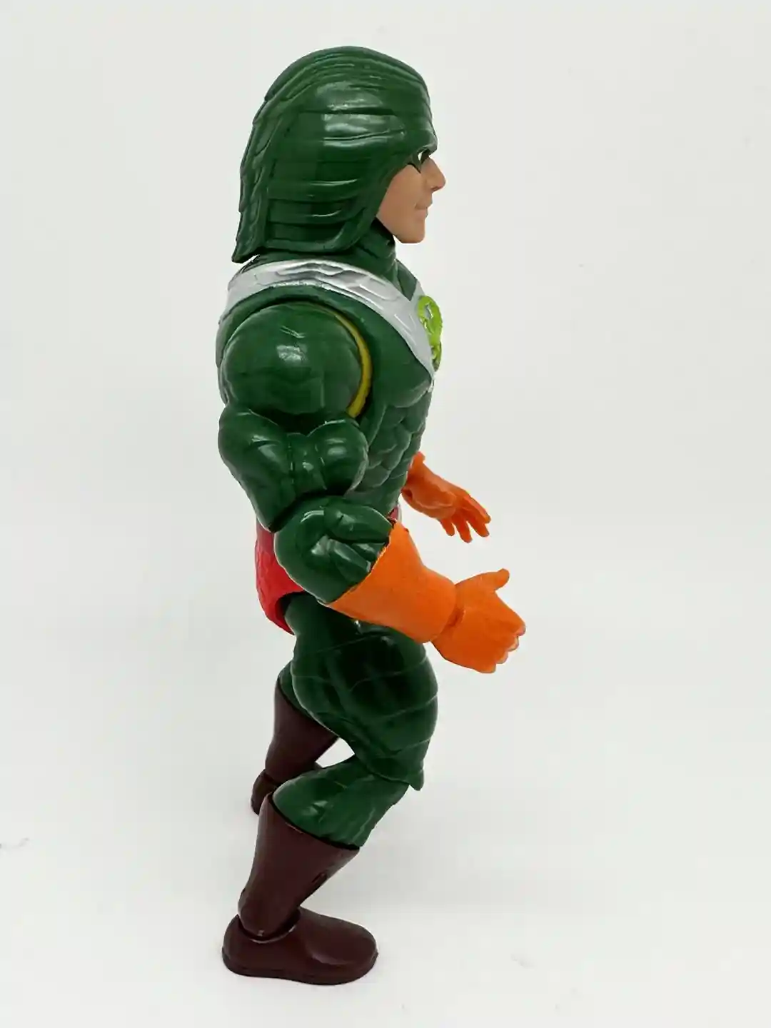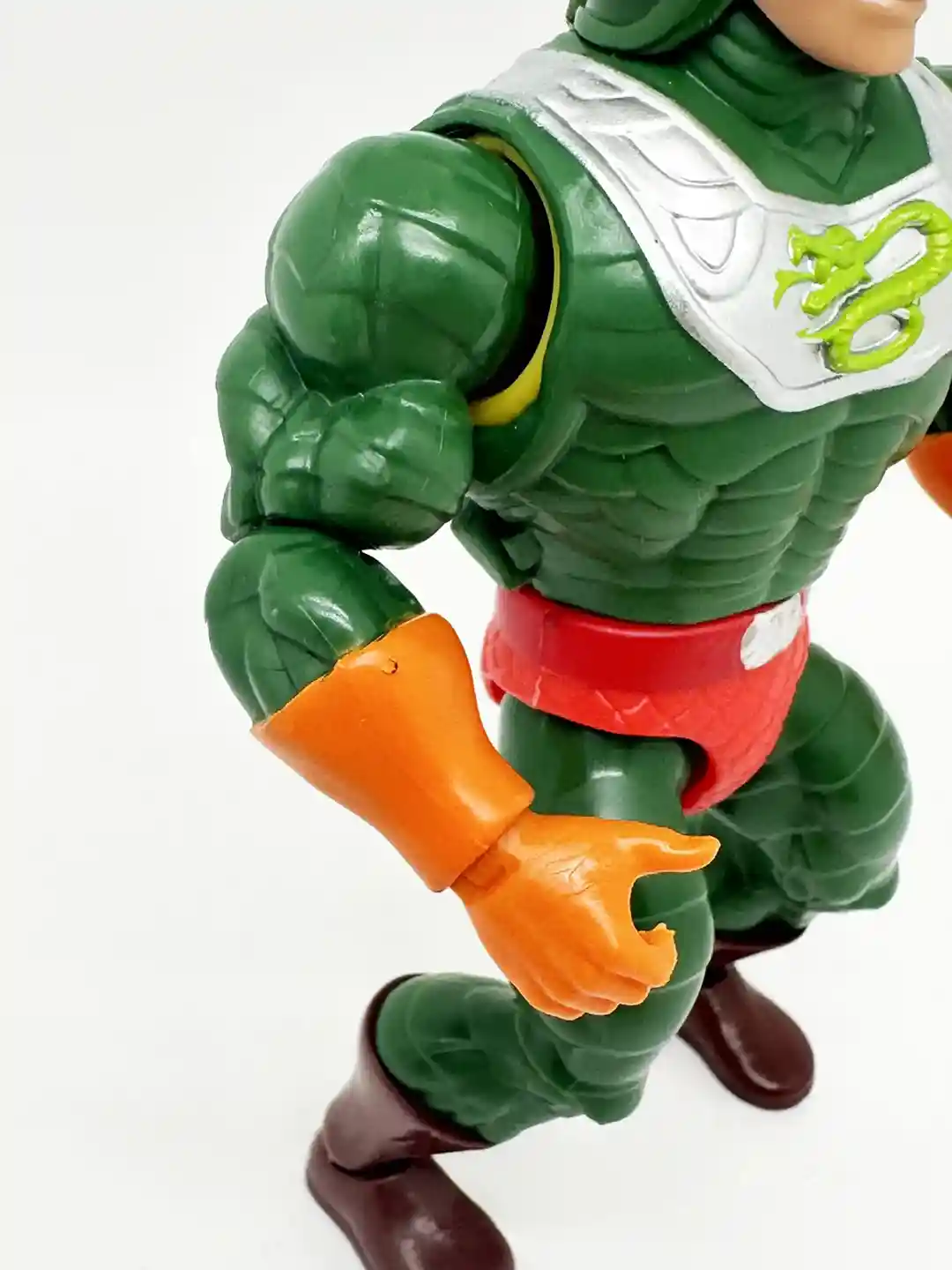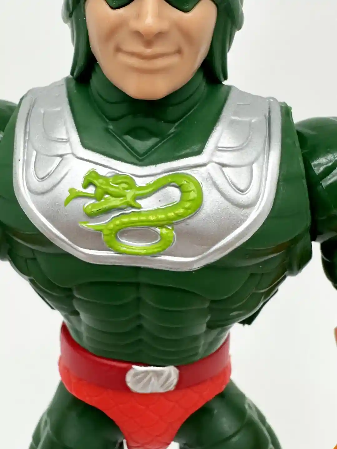 Just like the vintage figure, King Hiss is wearing a red belt, with a silver belt bunckle. He has on bright red scaly shorts and is wearing horizontaly scaled green pants with brown boots.