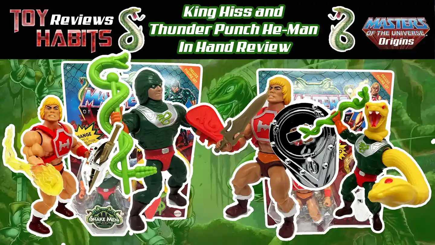 Mattel is hitting all cylinders with their latest MOTU Origins King Hiss and Thunder Punch He-Man Deluxe figures! As Mattel exclaimed at the 2022 San Diego Comic Con, 2023 will be the Rise of the Snake Men featuring brand new figures and brand-new packaging. The Deluxe card backs looks amazing! Continuing with the Rise of the Snake Men theme, both Thunder Punch He-Man and King Hiss come packaged on Snake Men themed card backs complete with the Snake over the MOTU logo, Snake Men logo sticker and unique front and rear card art! The King Hiss features all new tooling and Thunder Punch He-Man includes his Thunder Punch action feature, but in Origins style. So join us now for this MOTU Origins King Hiss and Thunder Punch He-Man Deluxe Figures in hand review!