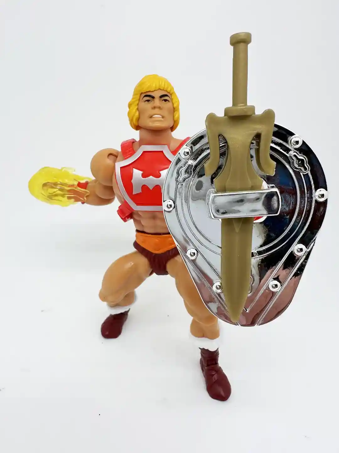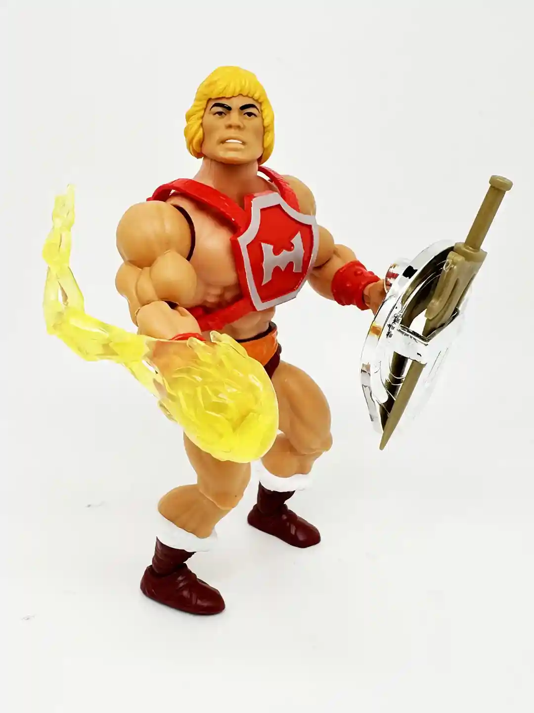 Thunder Punch He-Man was quietly revealed at this year’s San Diego Comic Con, sitting in the MOTU Origins ginormous Eternia display. Later to be followed up by quite preorders dropping on Entertainment Earth and Walmart for preorder! Well, we finally have him in hand and this version of He-Man is spectacular and packs a huge “punch”! Thunder Punch He-Man looks absolutely stunning in his classic Thunder Punch gear! He comes with his classic red armor, silver H on his chest, brown shorts, and the same brown and white boots as Flying Fist He-Man. He also comes with a flaming yellow blast effect to put on his fist, gold colored power sword and vac metal shield! By twisting He-Man’s waist, he then throws a “Thunder Punch” blast and a sound comes from his back to simulate his vintage cap ring blast! The only other thing that would have made this He-Man complete would have been some faux red cap rings, like the one packaged with the Mondo He-Man! By the way, if you haven’t checked out our in hand review of Mondo He-Man, you can read it HERE.