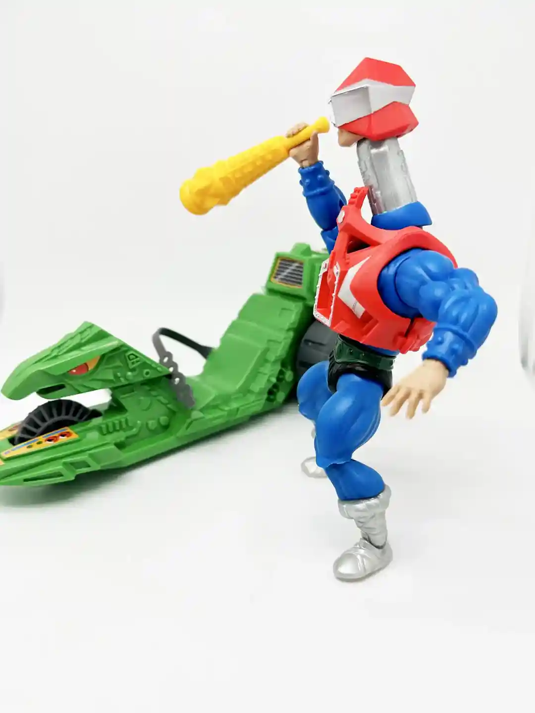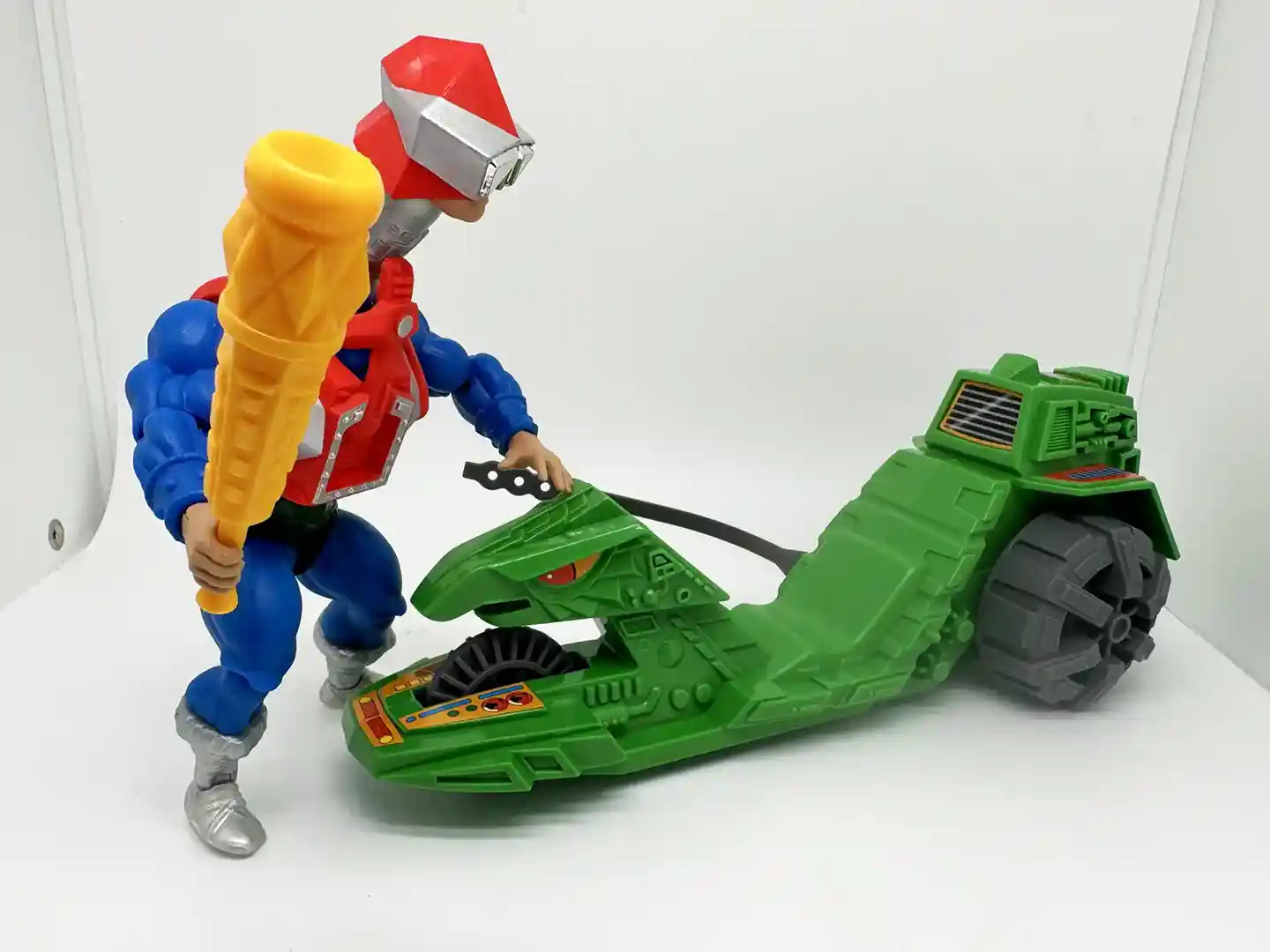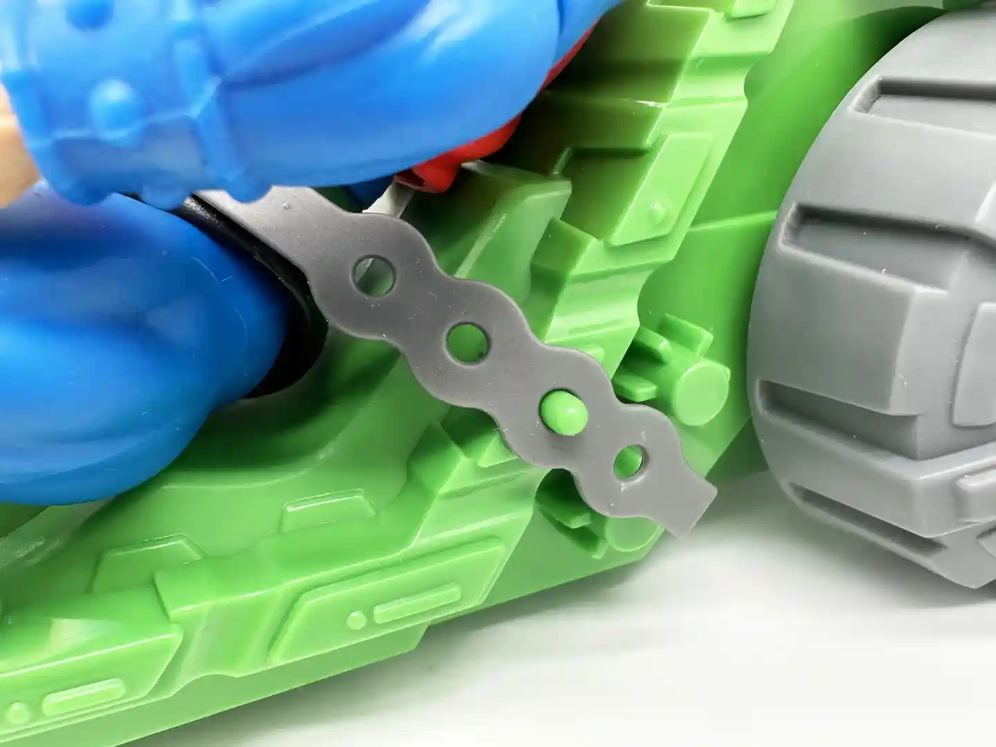 The Road Ripper too looks fantastic as a perfect tribute to the vintage serpentine looking vehicle! Again, Mattel has been true to the vintage vehicle’s history in recreating the green speed machine! With the Dragon inspired head, grey front wheel and large back wheel, plus all those great stickers! They even included the “seat belt” to strap Mekaneck in, because of course SAFETY FIRST! We wouldn’t want Mekaneck to go flying off as he zips across your living room floor! It is a bummer that this Origins version does not retain its action feature of the zip cord used to power this green speed demon, but it is still a blast to play with!