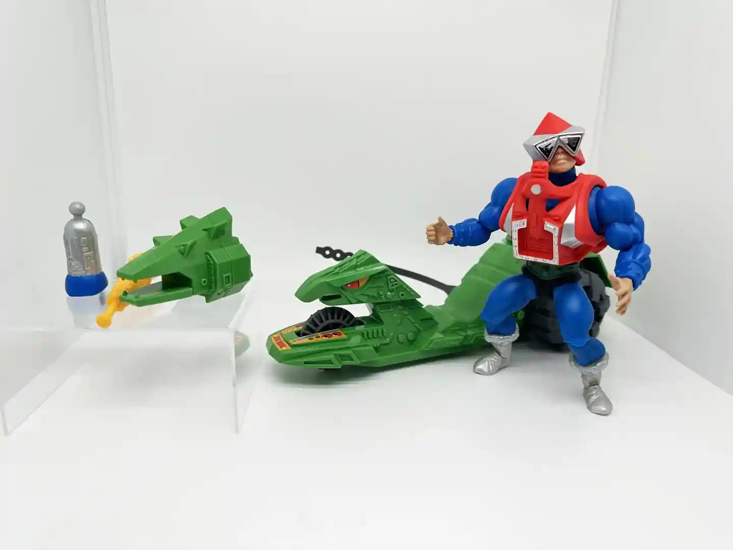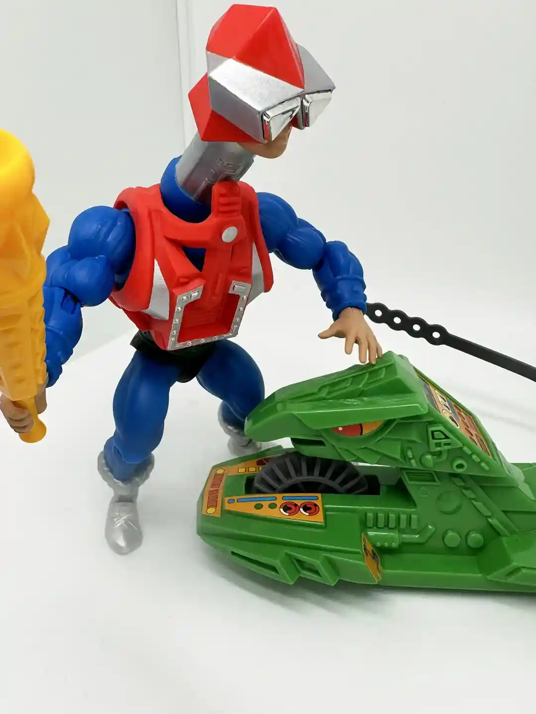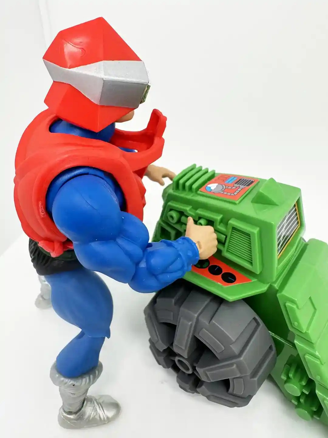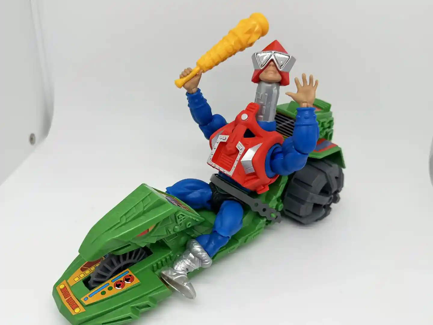The Road Ripper too looks fantastic as a perfect tribute to the vintage serpentine looking vehicle! Again, Mattel has been true to the vintage vehicle’s history in recreating the green speed machine! With the Dragon inspired head, grey front wheel and large back wheel, plus all those great stickers! They even included the “seat belt” to strap Mekaneck in, because of course SAFETY FIRST! We wouldn’t want Mekaneck to go flying off as he zips across your living room floor! It is a bummer that this Origins version does not retain its action feature of the zip cord used to power this green speed demon, but it is still a blast to play with!