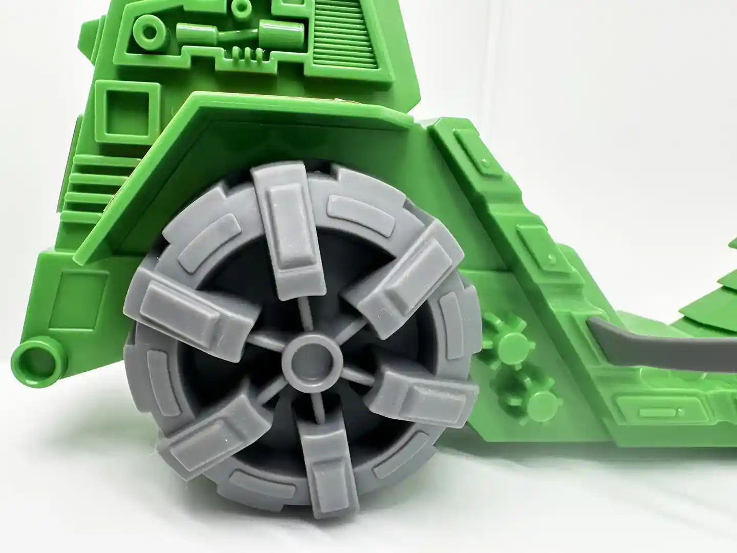 The back end of the Ground Ripper is a perfect homage to the vintage Road Ripper. The sculpted details are amazing, and the stickers all very nicely applied. The back wheels are large and made of a hard plastic. But boy do they roll well!