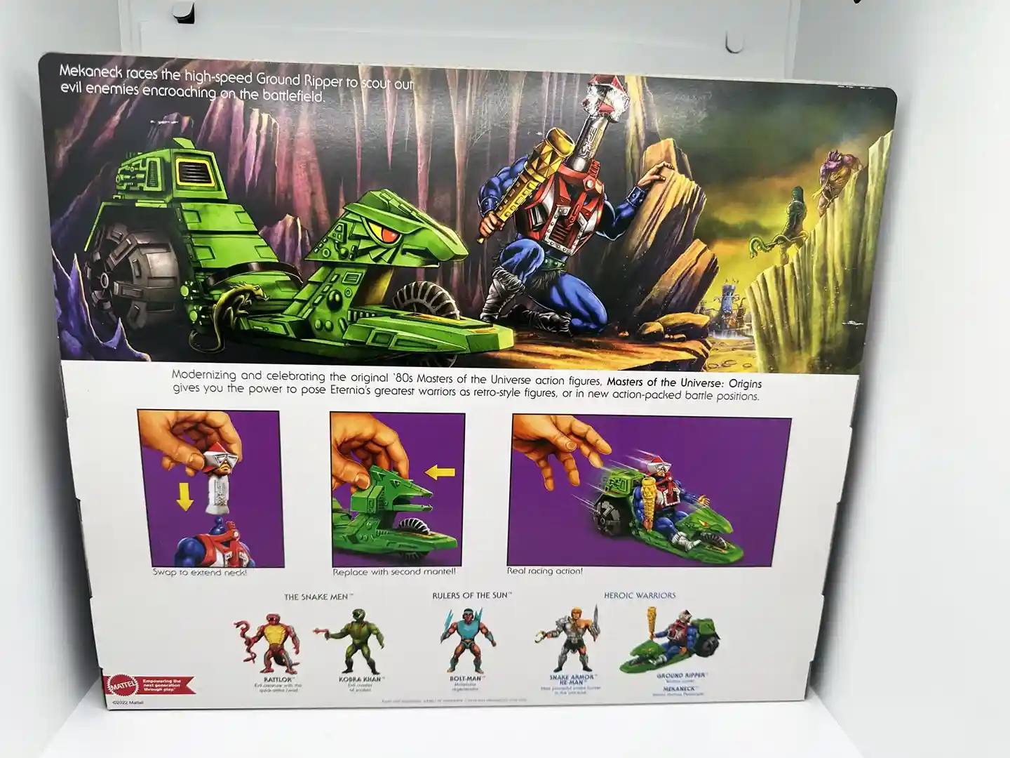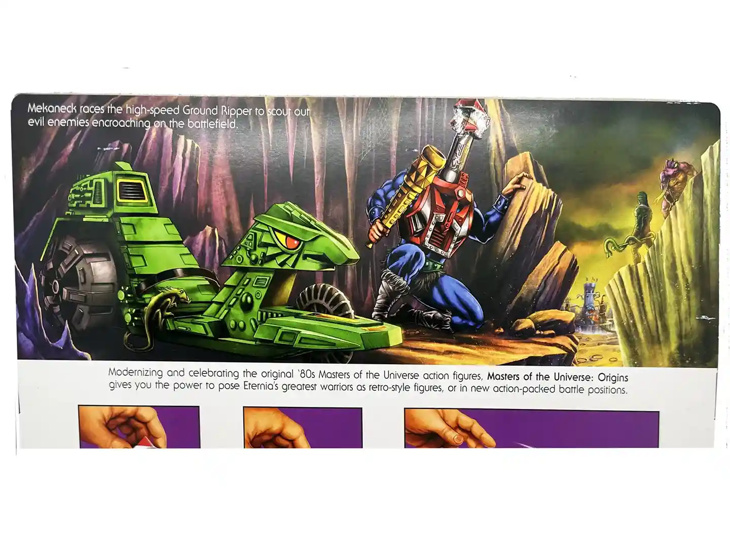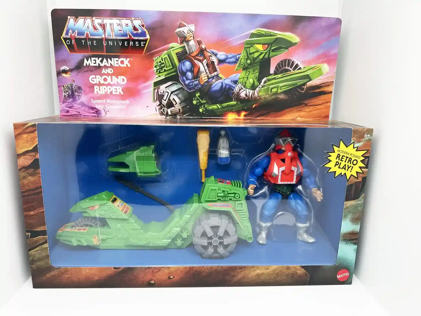 The box features an homage to the vintage design with Mekaneck (instead of He-Man) tearing away from Castle Grayskull! This set comes with the Ground Ripper (back in the day it was called the Road Ripper) with an alternate head for the vehicle and Mekaneck with a neck extension piece and his famous yellow mace. This version of Mekaneck does not have his twisting, telescoping action feature so think of this figure as an homage to the MOTU Classics design where they gave him two neck pieces.