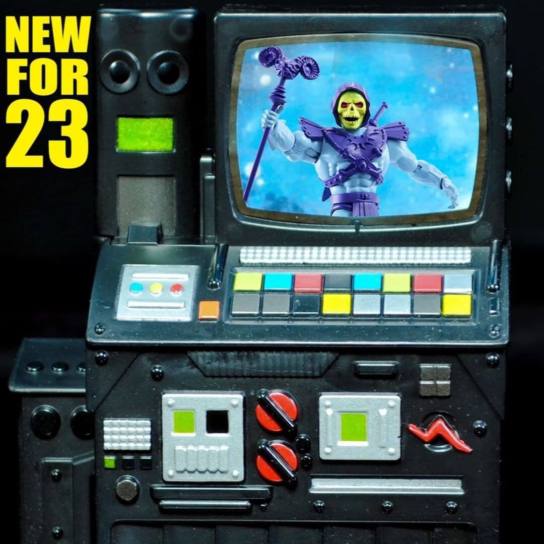 Now let’s examine this posted image closer, you see Skeletor appearing on a computer screen, that looks familiarly like an old style CRT TV. And it is being displayed on a computer console that looks like it came outta the Filmation cartoon. Also if you look closely, that is an Origins version of Skeletor we have not gotten before. Let’s take a closer look at the head sculpt, it looks remarkably similar to the new Skeletor Screeech 2 Pack Head sculpt with articulated jaw, but he is wearing his standard purple armor. The paint color is a little different, but it is the same sculpt! So our theory is that they will use this new head sculpt with the articulated jaw to create a Skeletor Through the Years animated Series 4 Pack! So that Skelly in the CRT TV could be the Filmation version from the 4 Pack! We predicted this set in our 2023 Skelebration Speculation article, and now this is another hint! Let’s looks at the 4 versions of Skeletor that might be included!