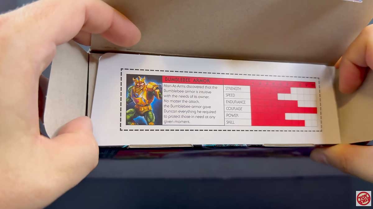 Inside the flap, the packaging features a vintage G1 Transformers-inspired tech spec for Bumblebee Armor Man-At-Arms. It includes character artwork of Man-At-Arms wearing the yellow and blue Bumblebee-themed armor, alongside a short bio explaining that the armor is intuitive to its wearer’s needs, providing Duncan with whatever he requires to protect others at any moment. The stat chart uses the classic red bar graph style from the original Transformers packaging, rating attributes like Strength, Speed, Endurance, Courage, Power, and Skill in a nostalgic nod to 80s Transformers toy design.