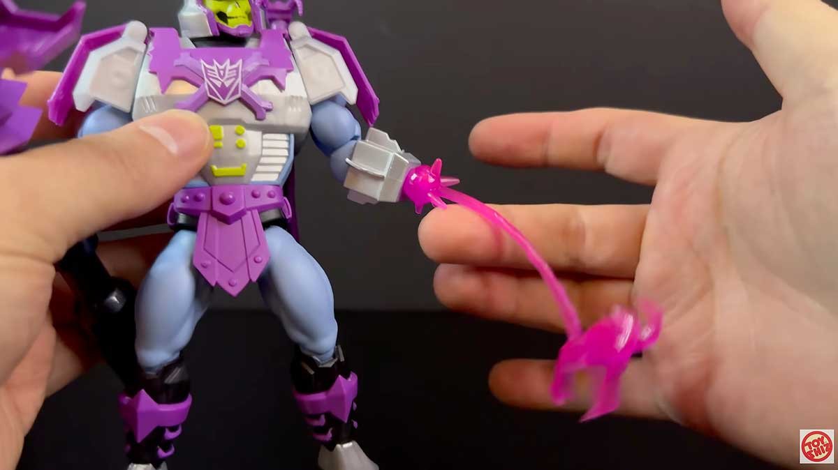 These new images of Megatron Armor Skeletor showcase the fusion of two iconic villains like never before. Skeletor’s classic blue skin and sinister grin are fully intact, but now enhanced with Megatron’s distinctive silver and purple armor, featuring the Decepticon insignia boldly across his chest. The figure comes armed to the teeth, wielding a blaster cannon styled after Megatron’s classic weapon, along with a translucent pink Havoc Staff adorned with a dynamic energy effect. The second image shows the figure in an aggressive stance, ready to fire the oversized fusion cannon mounted to his arm, highlighting the mechanical enhancements and sculpted detail in the crossover design.