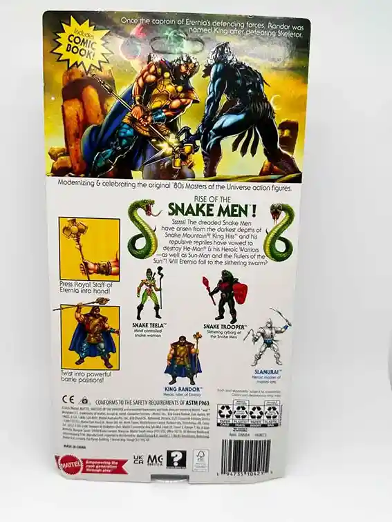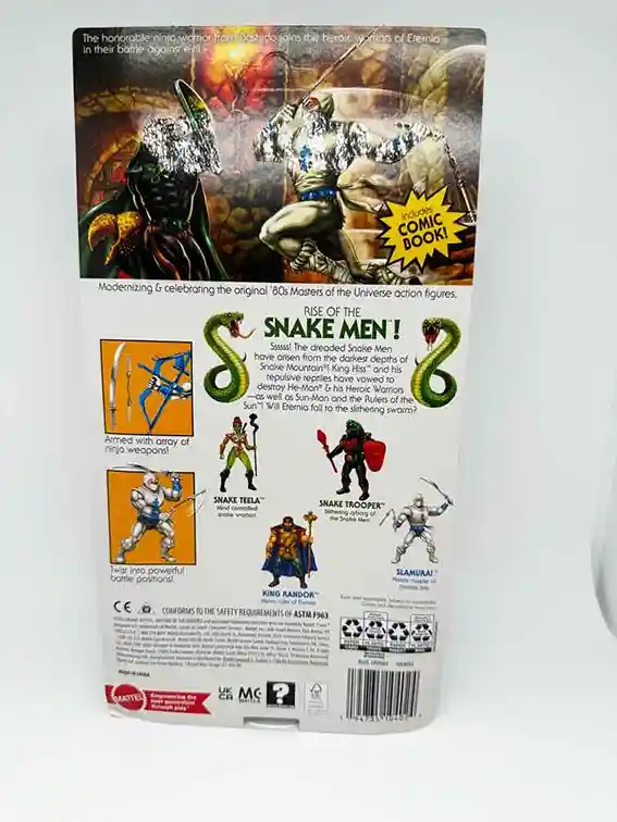 Slamurai, which is a cool white ninja repaint version of Ninjor! It’s amazing to see another heroic warrior in the mix to fend off the Snake Men. He has a new Ninja heroic logo on his chest which is different than the Evil Warriors ninja logo of Ninjor! This looks like it is going to be the fan favorite of the wave! This figure now comes with a blue bow and arrow, white nunchucks and a silver sword. He also has human boots for his feet, unlike Ninjor who has the monster feet.