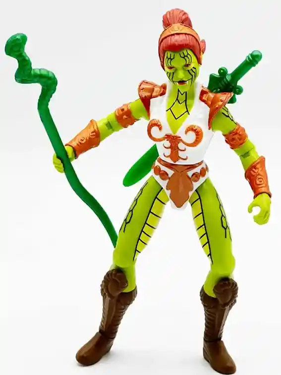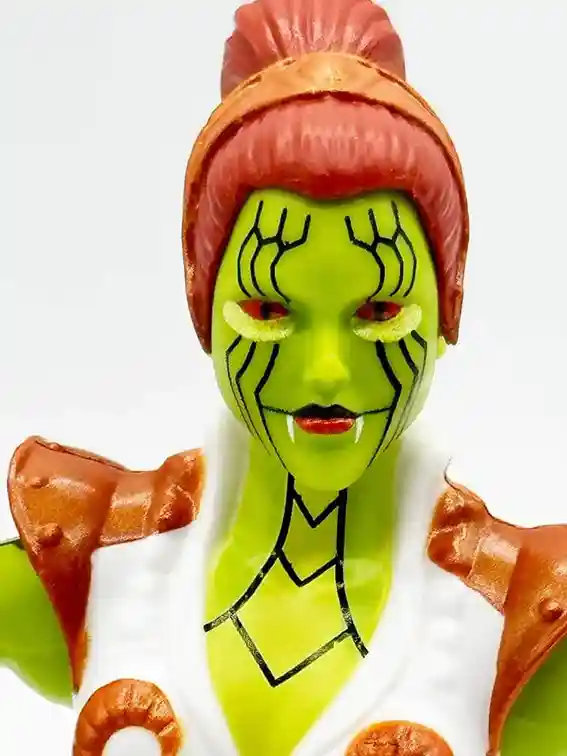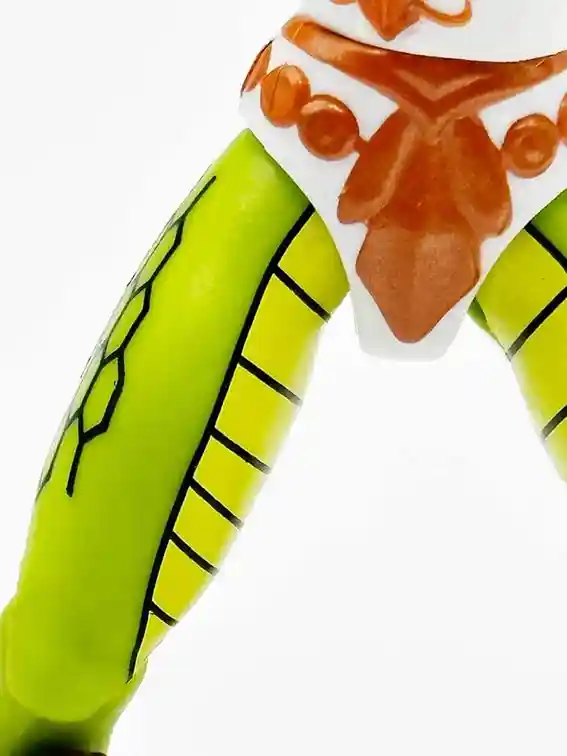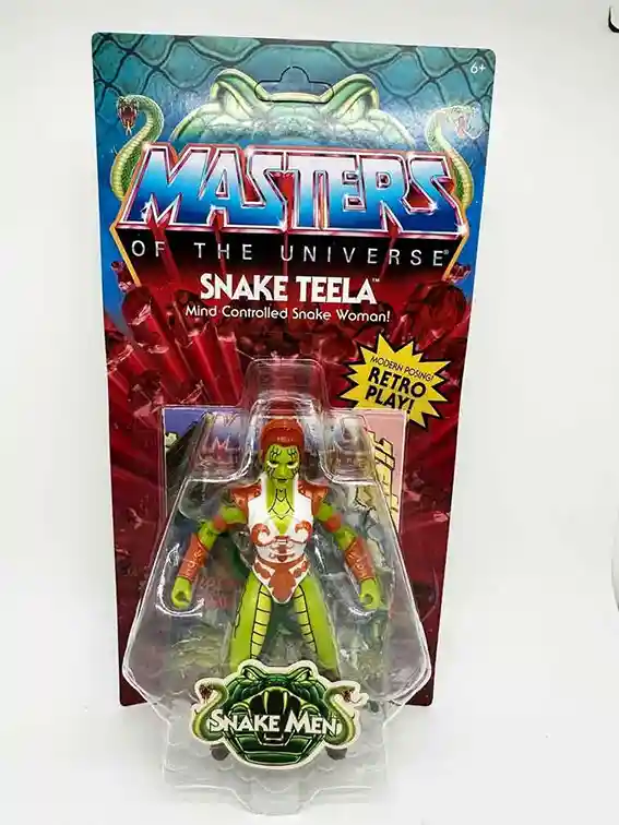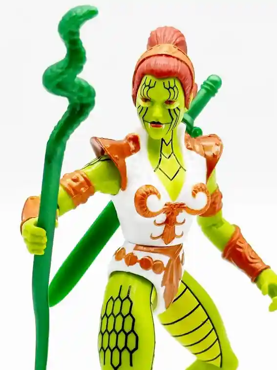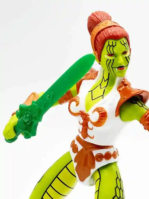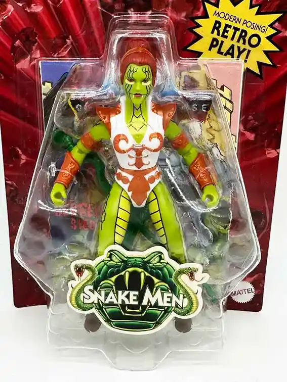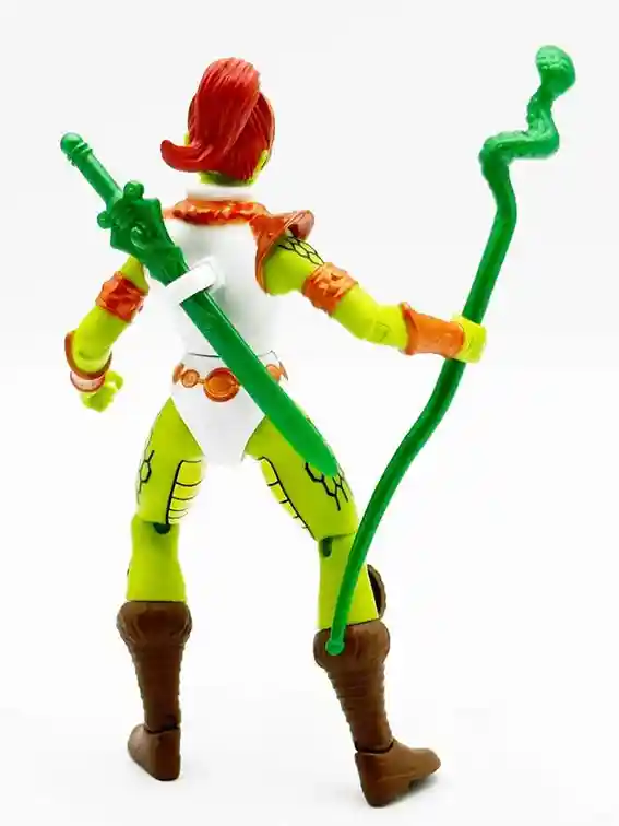 Snake Teela looks to be a reuse of the original Teela figure, but as you can see they added some additional details to her shoulders with the flared shoulder armor. Also the colors of here outfit are all new. The face sculpt looks incredible in hand, and you can see that they even included snake fangs on her face! She comes with a green snake staff and green version of the sword that came with the Teela and Zoar Two Pack. You can see they also added a sword sheath on her back, which is all new to the Teela figure. Her boots are also reminiscent of the Teela 200X character, so perhaps that is what Mattel has in store for us in the future!