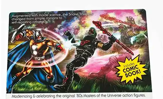 The Snake Trooper looks amazing in hand! You can see how good the Snake head looks in the Horde Trooper armor and how well it sits! Mattel has reused the Horde Trooper body and looks like is using the Rattlor Snake Head in green. There are some nice gold accents on his shoulders as well. He comes with a red Horde Trooper staff and a red snake man shield like the one that came with King Hiss. They also changed his lower legs, and boots, as he now has the horde logo on his boots, a reuse of Mantenna’s boots! This will definitely be one of the more sought-after army builders! Compared to the official image, having this Snake Trooper in hand is amazing!