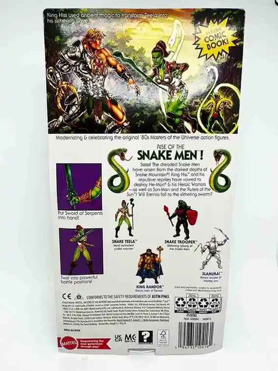 The card back art shows Snake Teela battling with Snake Armor He-Man, and the Snake version of King Hiss lurking in the background!