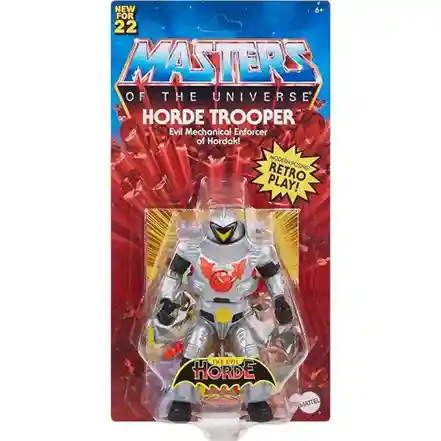 Previously released in both Red and Black versions as part of the 2021 Power-Con Exclusive Horde 4 Pack, this classic Silver version of the Horde Trooper is a straight translation of the vinatge Horder Trooper you all remember! By pressing the red Horde logo on his chest, the Trooper falls open like he just got blasted as he often did on the Princess of Power Filmation cartoon! The Horde Trooper comes complete with his red staff and white crossbow.