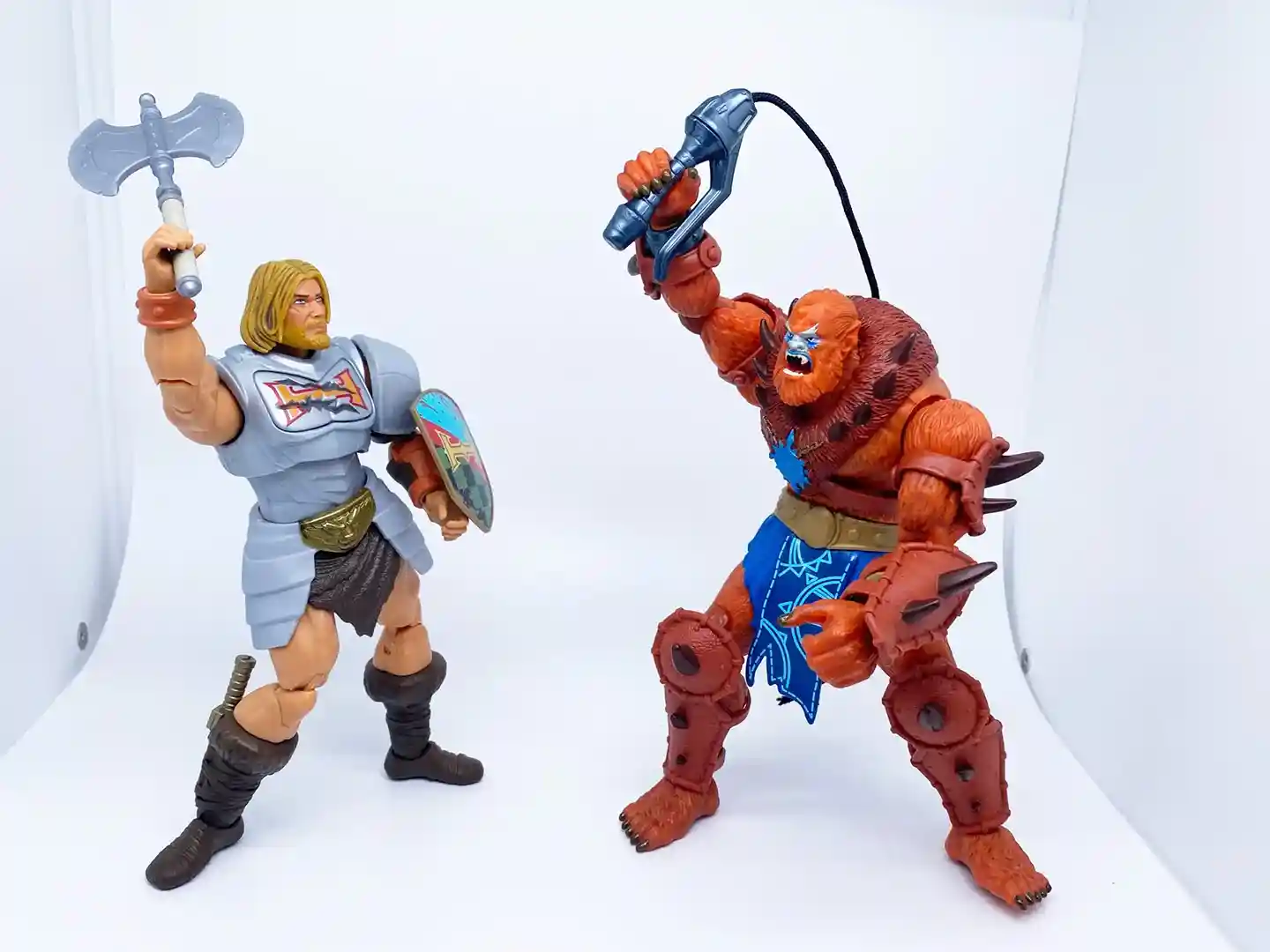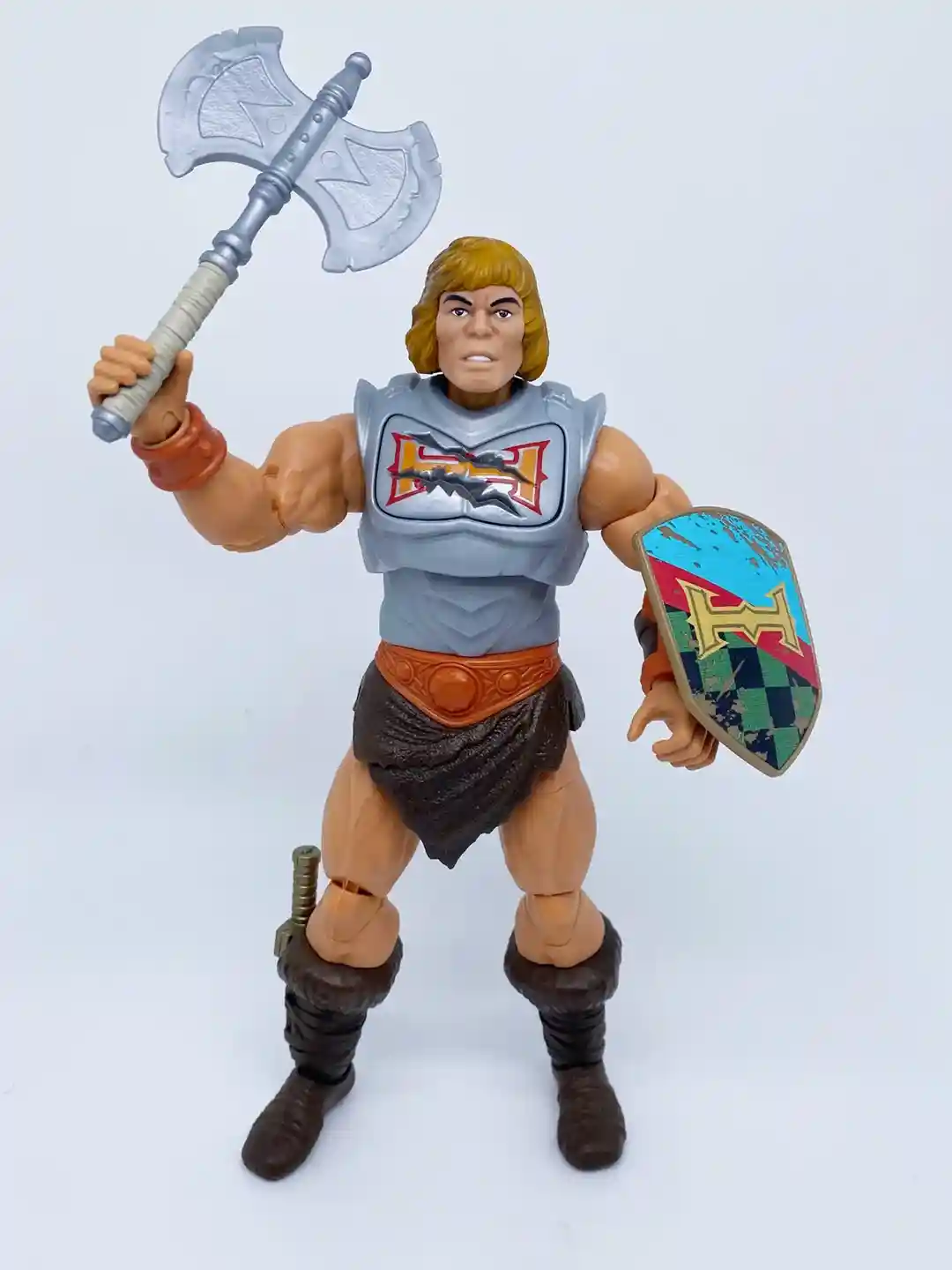 He-Man’s Power Sword, dagger, and axe are a reuse of the New Eternia Viking He-Man weapons but in a different color scheme. The gold handle on the dagger matches the lion belt buckle in color, tying the two together. The axe handle has been given an upgraded wrap, which give it a more finished look.