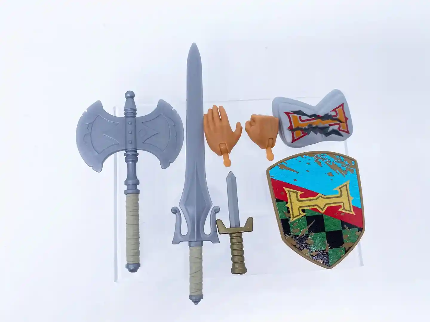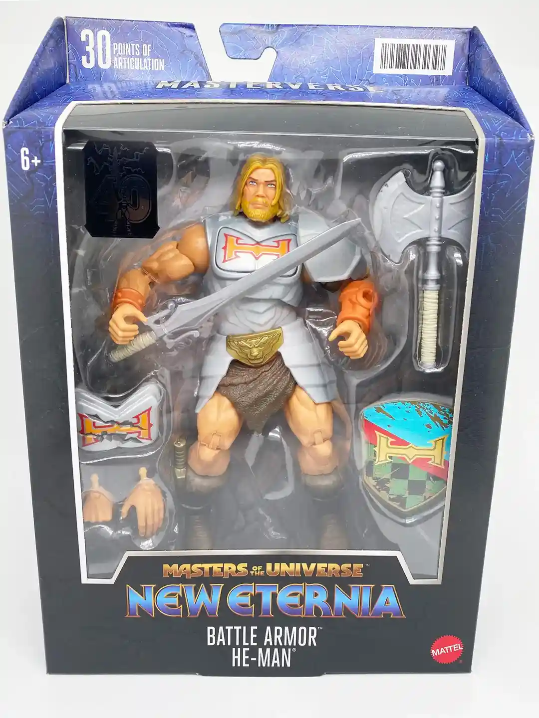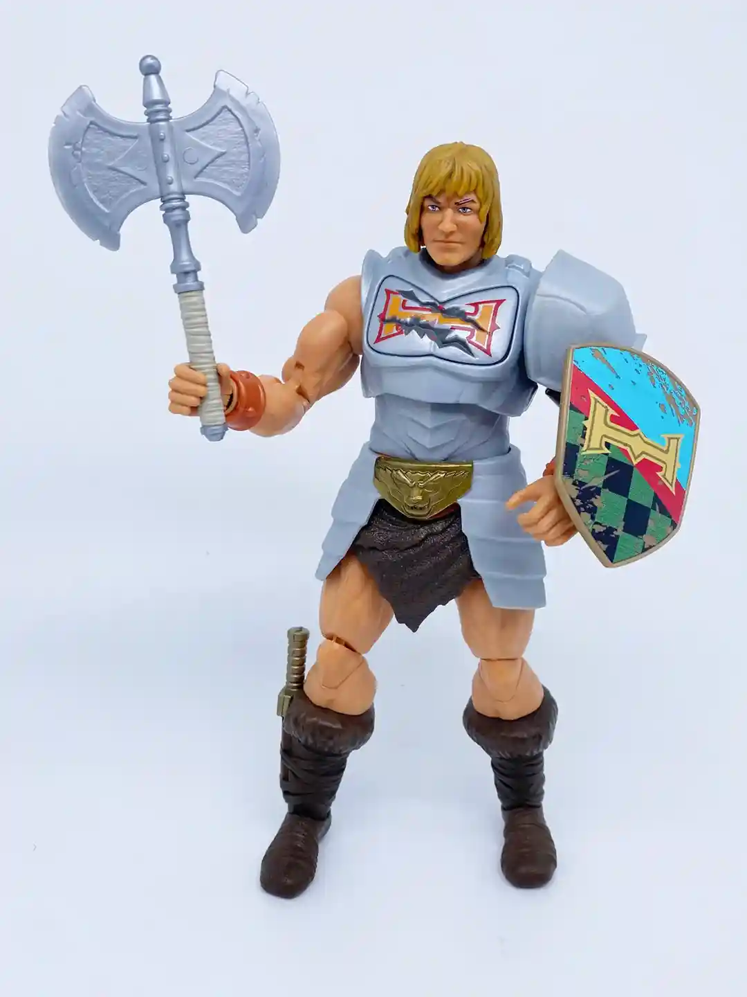 He includes his power sword, axe, shield with vintage sticker art that was on the Dragon Walker, removable armor pieces, boot knife, battle damages chest plate and 2 swappable hands.