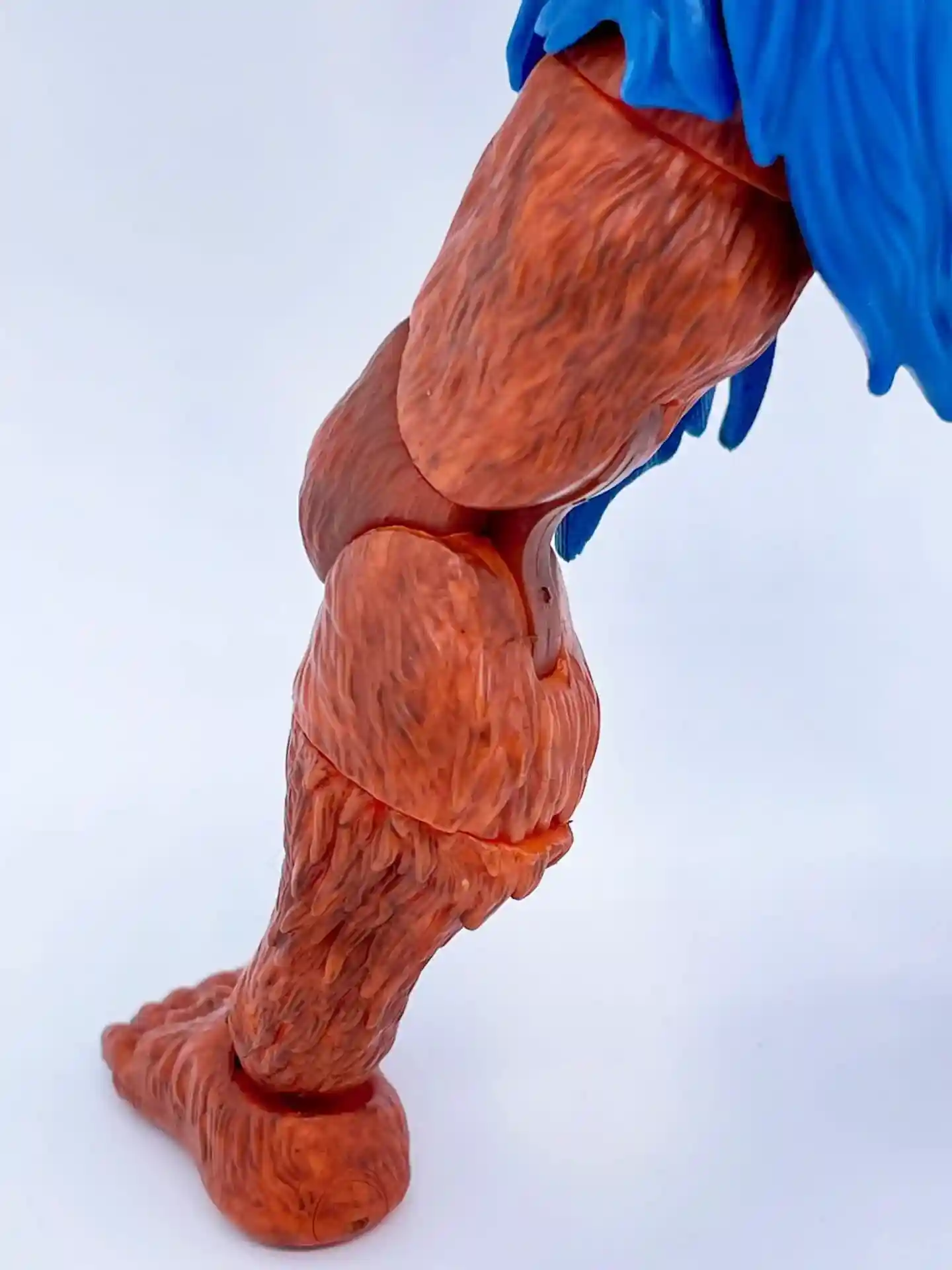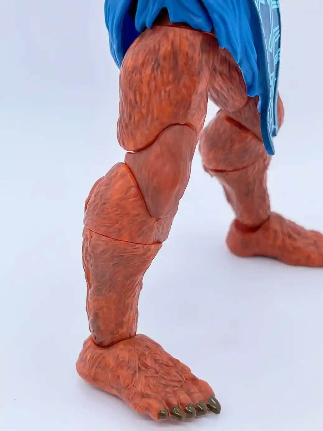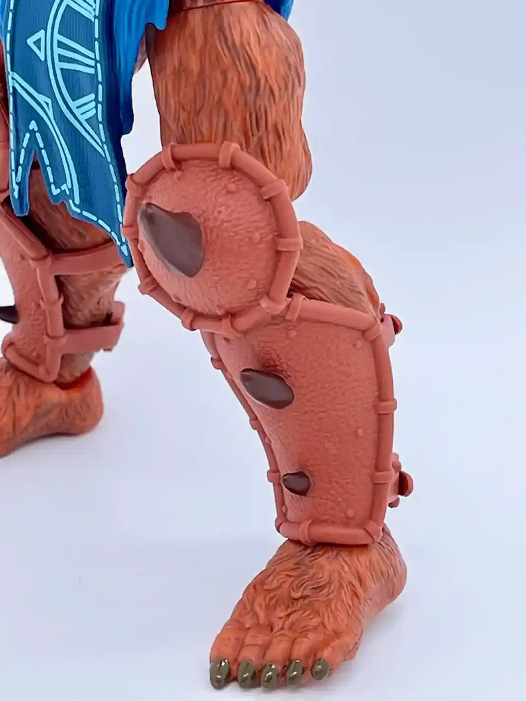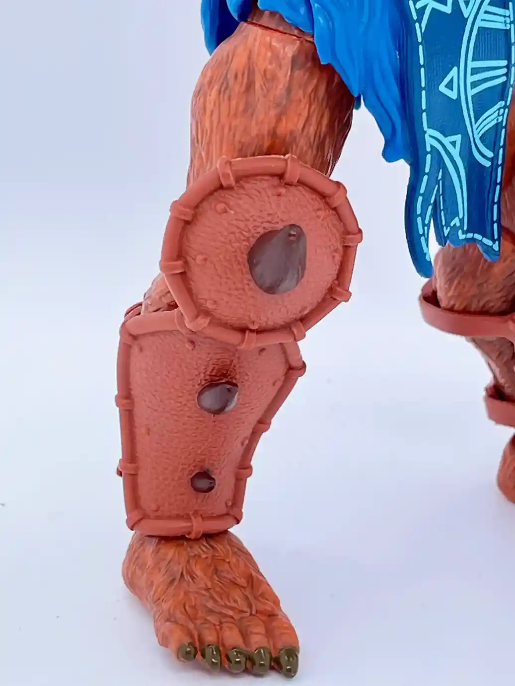 His right and left legs are symmetrical pieces and have the same design and armor but are just mirrors of each other. Beast Man’s hairy legs are covered by a single piece of shin and knee armor that goes well above his thigh. The knee armor has one larger spike coming from the middle and the shin armor has two smaller brown spikes that resemble the shape of his left forearm armor. Because the armor is so large, it connects in the back of his leg around his calf and his ankle.