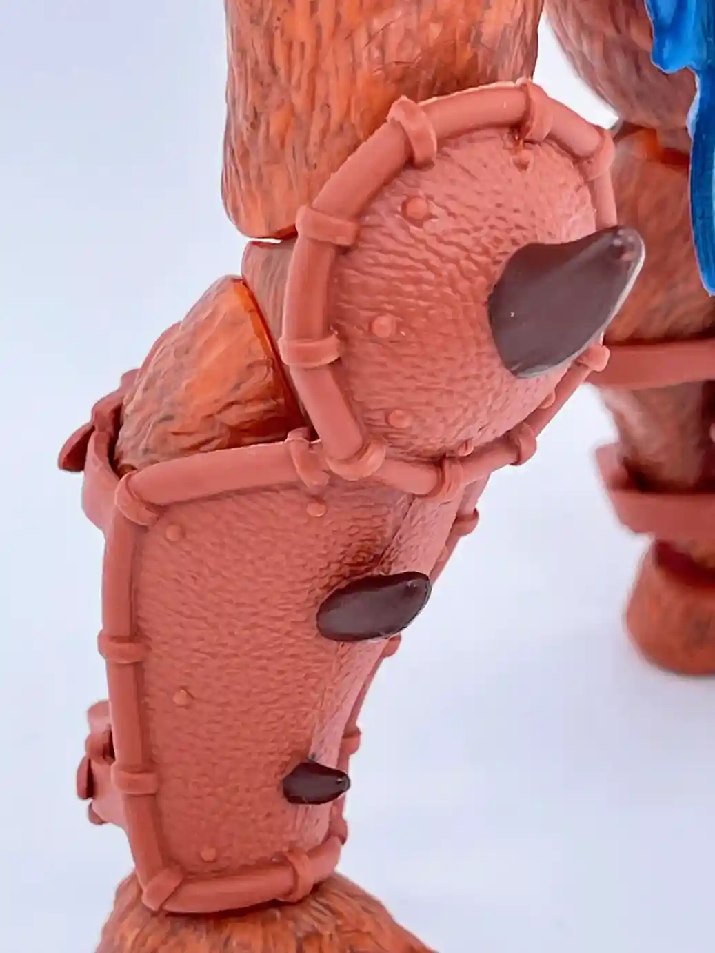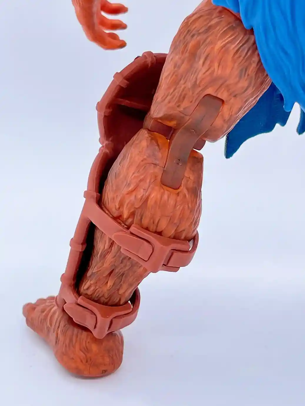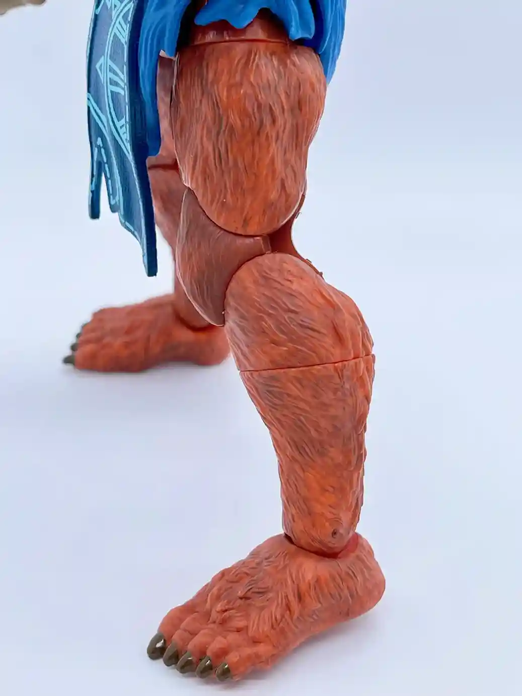 His right and left legs are symmetrical pieces and have the same design and armor but are just mirrors of each other. Beast Man’s hairy legs are covered by a single piece of shin and knee armor that goes well above his thigh. The knee armor has one larger spike coming from the middle and the shin armor has two smaller brown spikes that resemble the shape of his left forearm armor. Because the armor is so large, it connects in the back of his leg around his calf and his ankle.