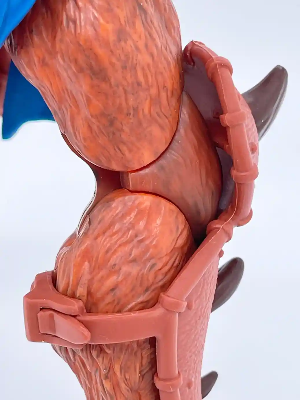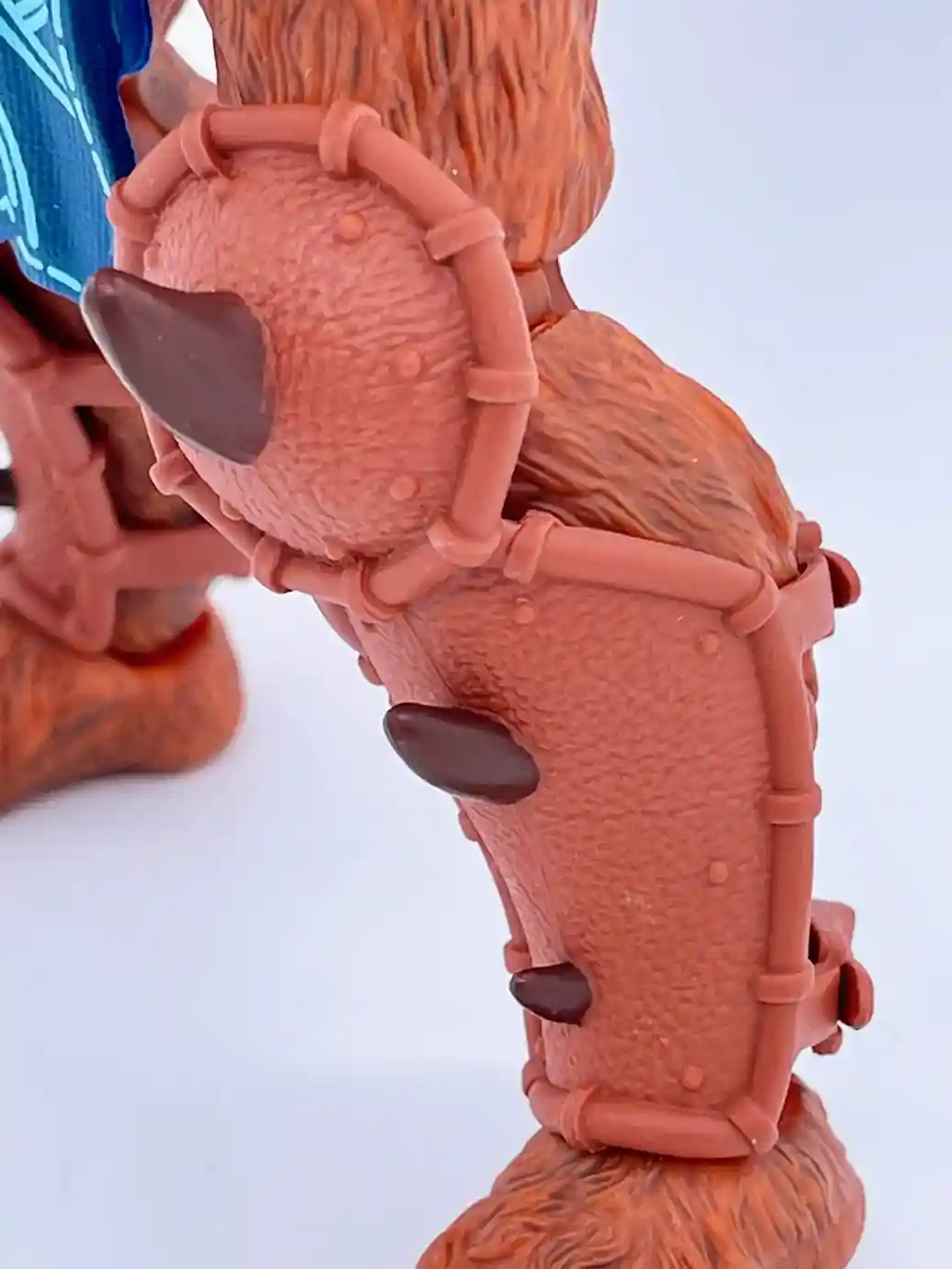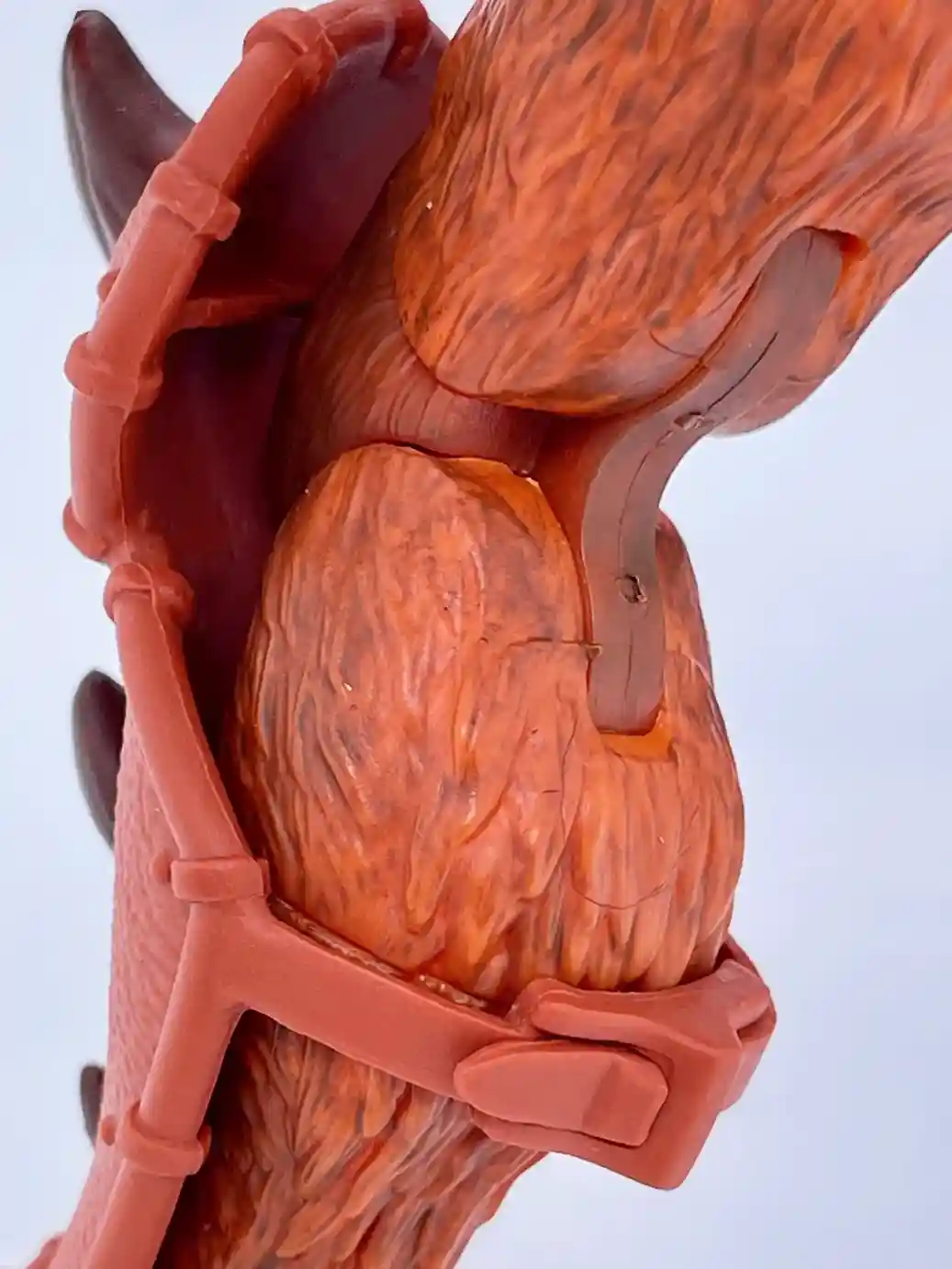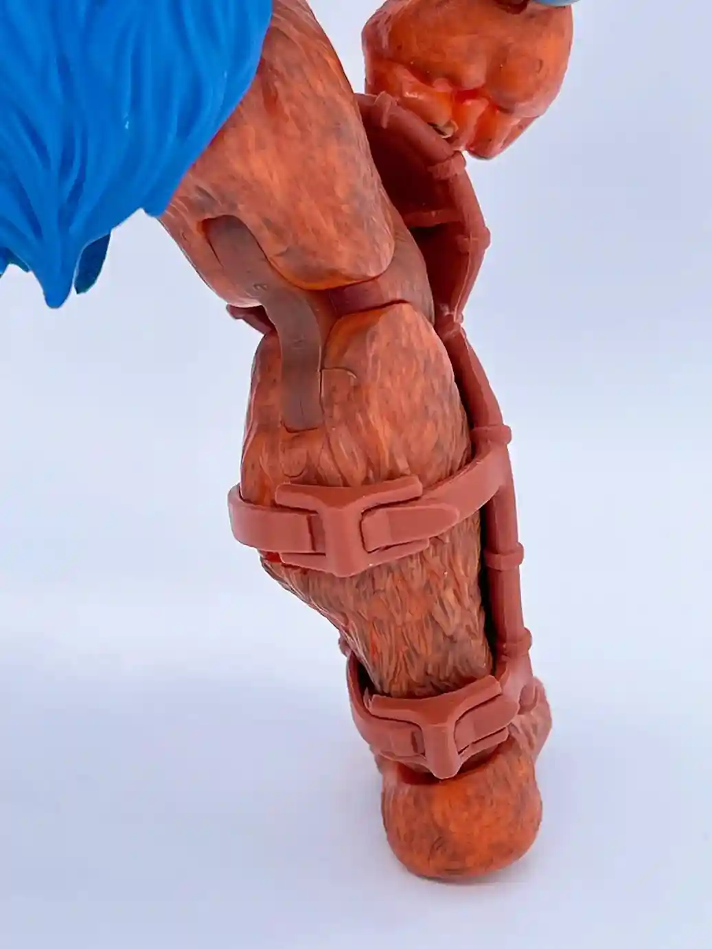 His right and left legs are symmetrical pieces and have the same design and armor but are just mirrors of each other. Beast Man’s hairy legs are covered by a single piece of shin and knee armor that goes well above his thigh. The knee armor has one larger spike coming from the middle and the shin armor has two smaller brown spikes that resemble the shape of his left forearm armor. Because the armor is so large, it connects in the back of his leg around his calf and his ankle.