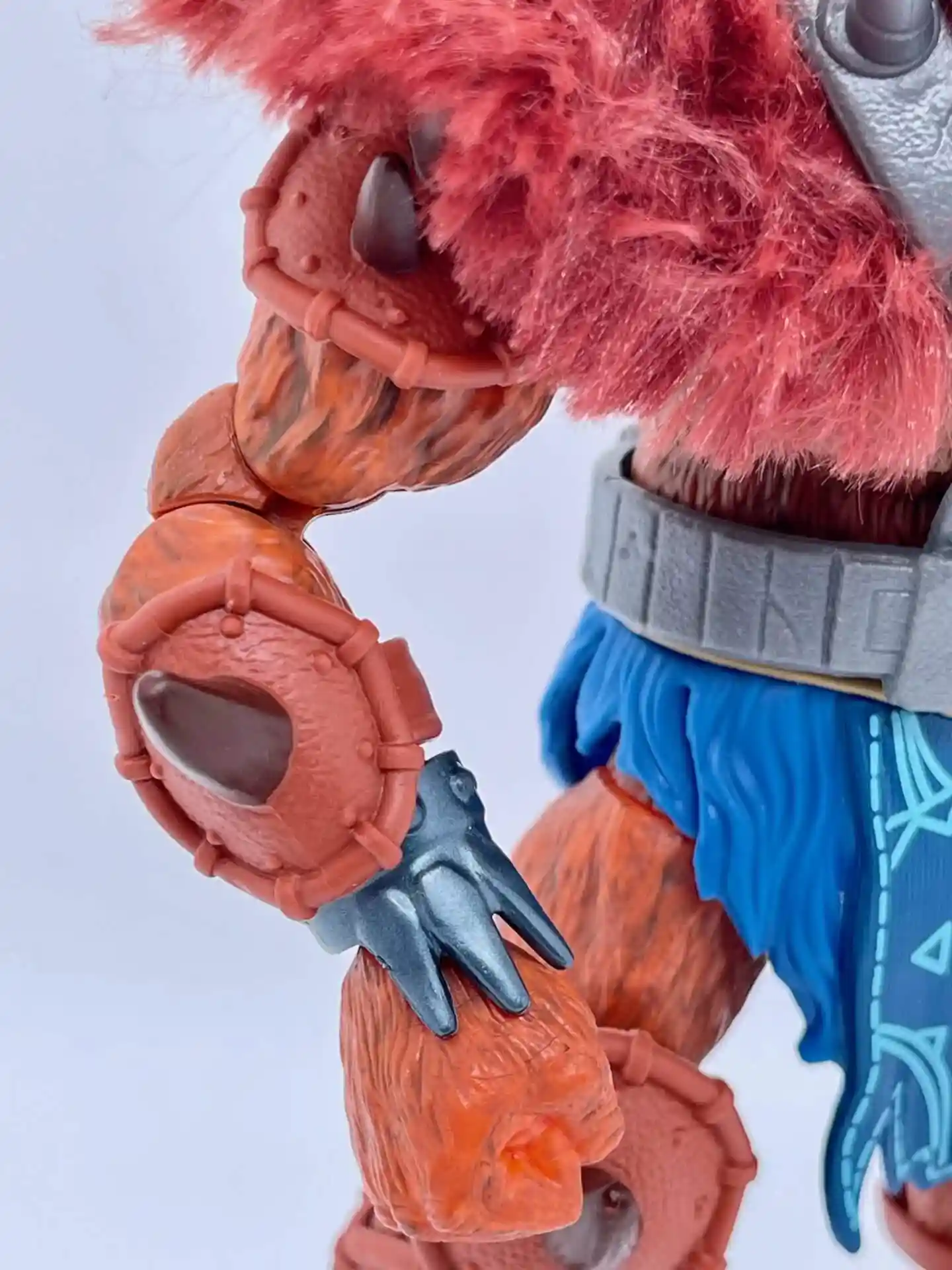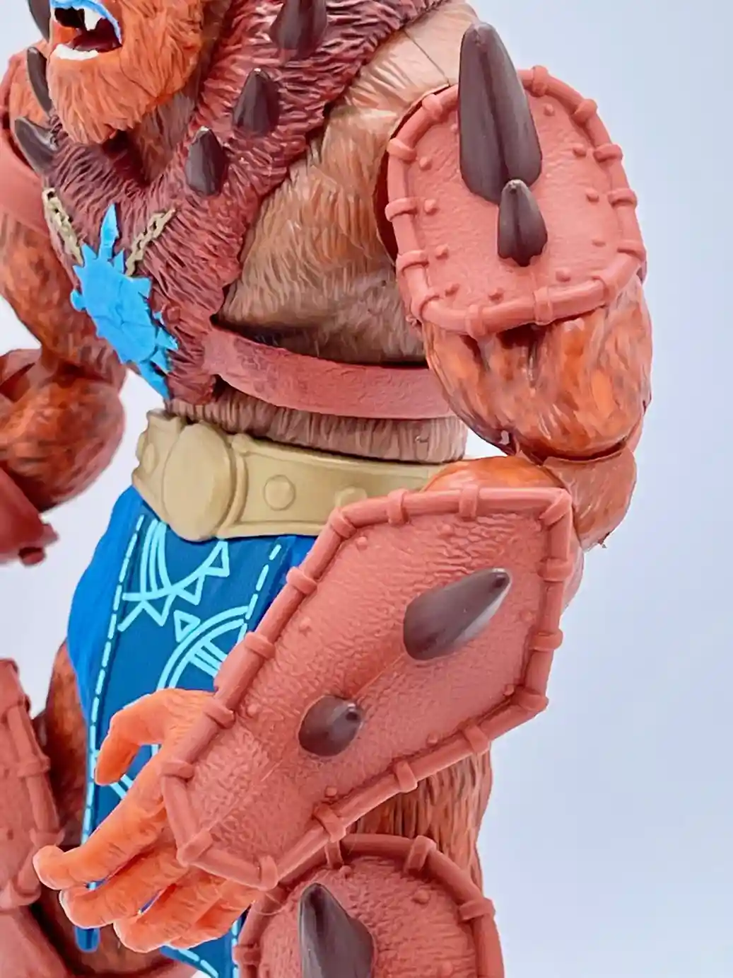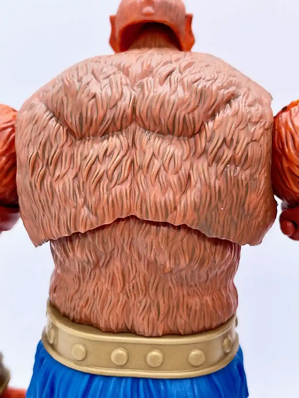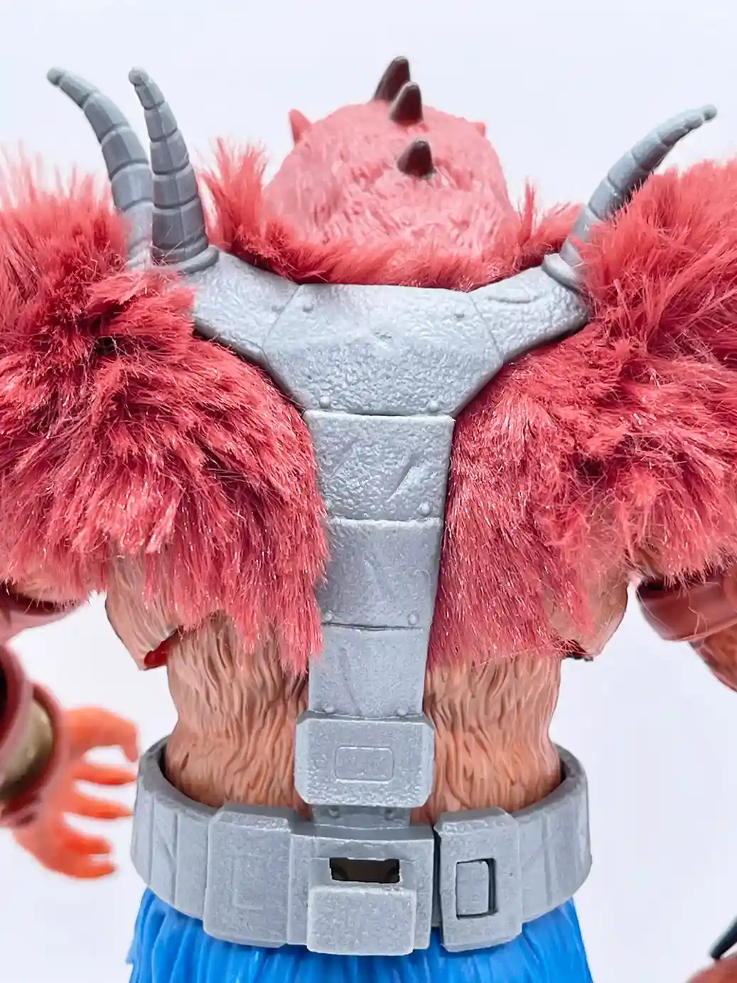 Talk about a blast from the past as the vintage chest armor really leans into the vintage and Classics style! The armor goes around his head and the fur texturing and brown washing give it a different color as not compete with all of the reds, browns, and oranges. It has 4 brown spikes around the left and right side where his shoulders are and two deep orange straps that go under his arms that secure with one single point in the back above his belt. Looking at Beast Man from behind, his armor goes down to his upper back and you can see some of the spikes.