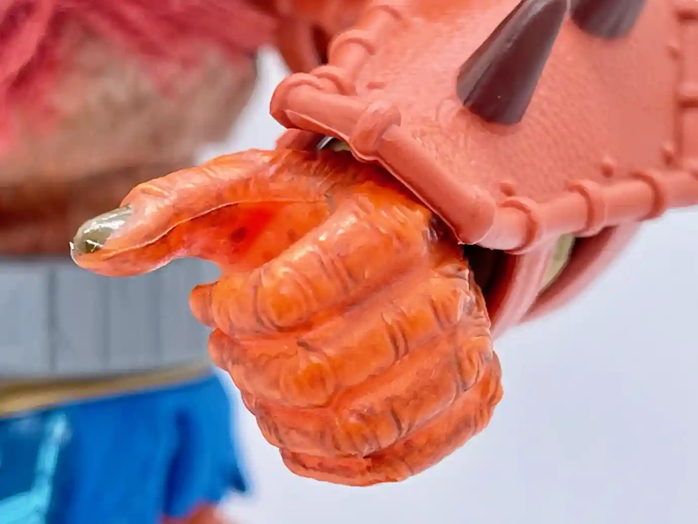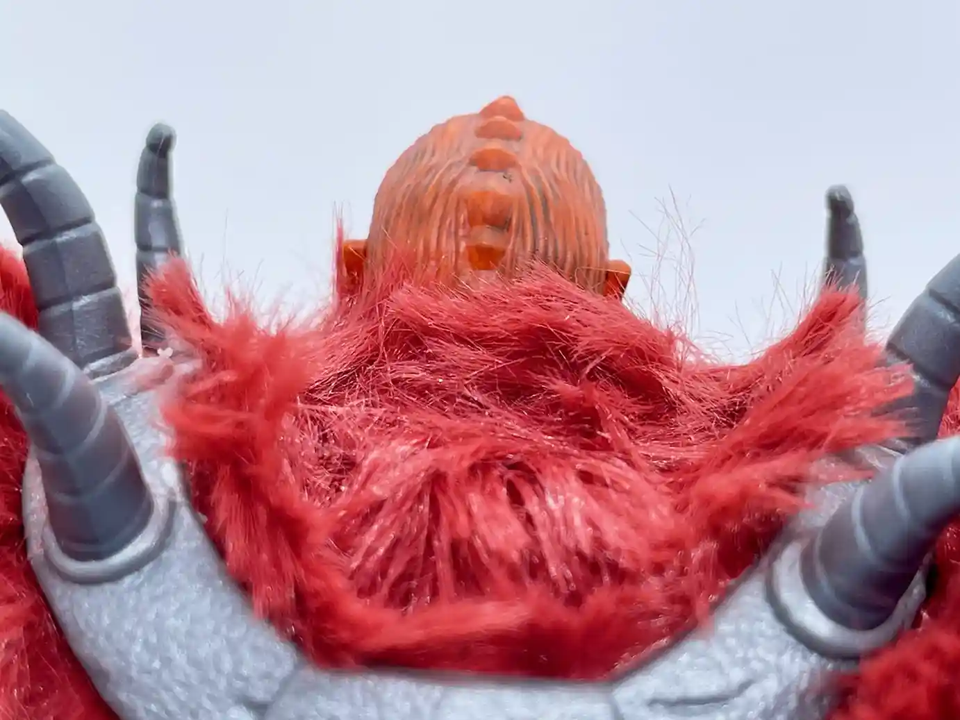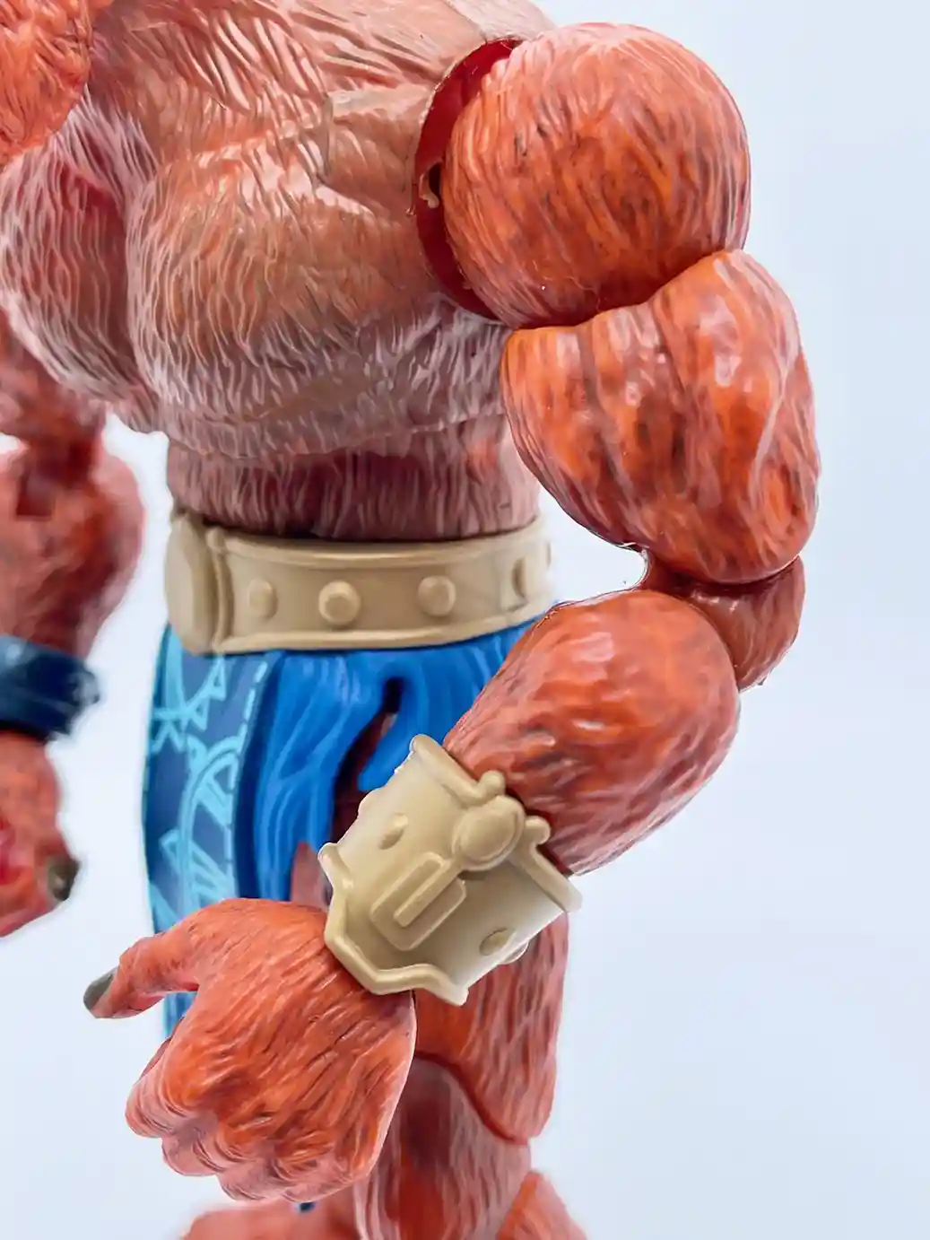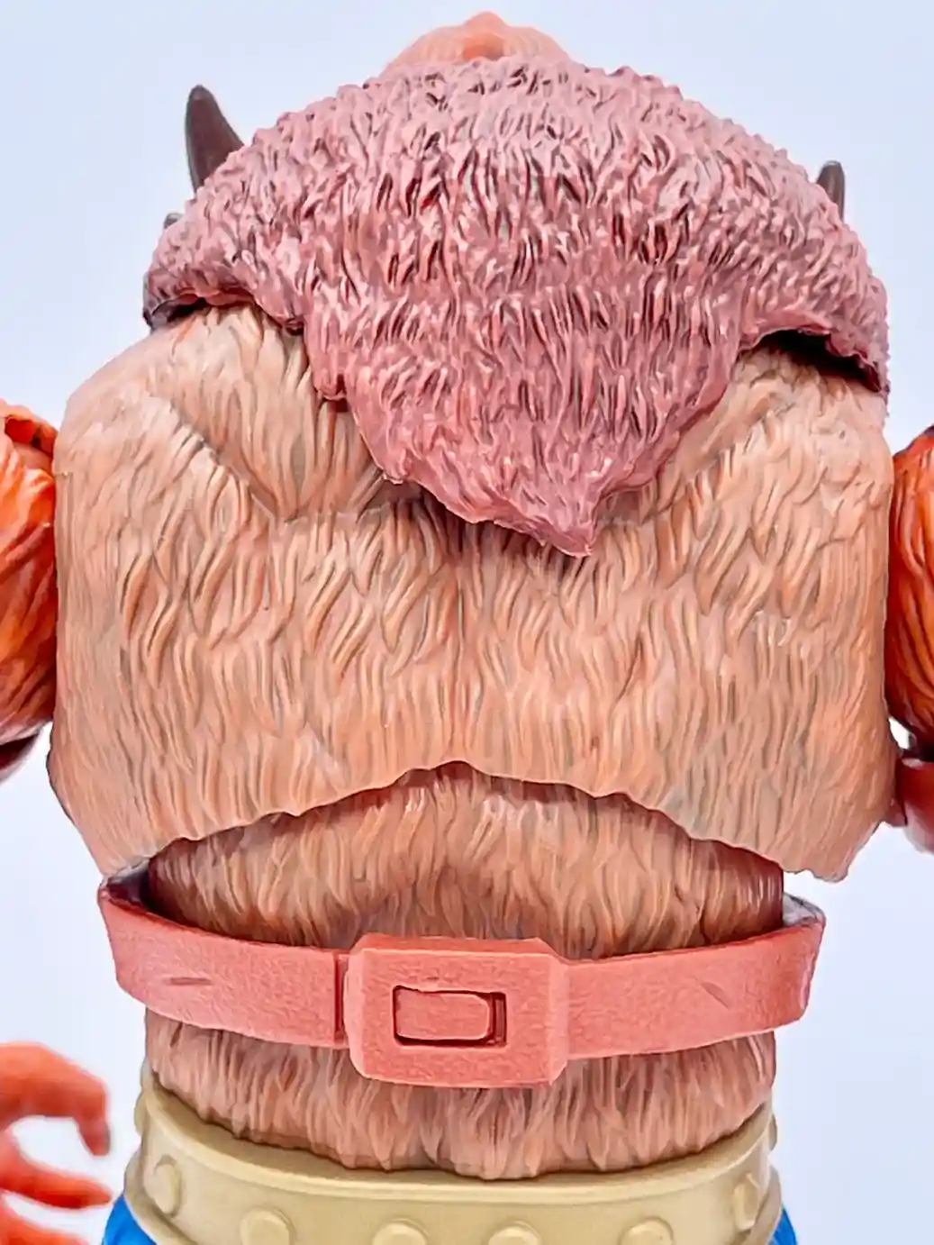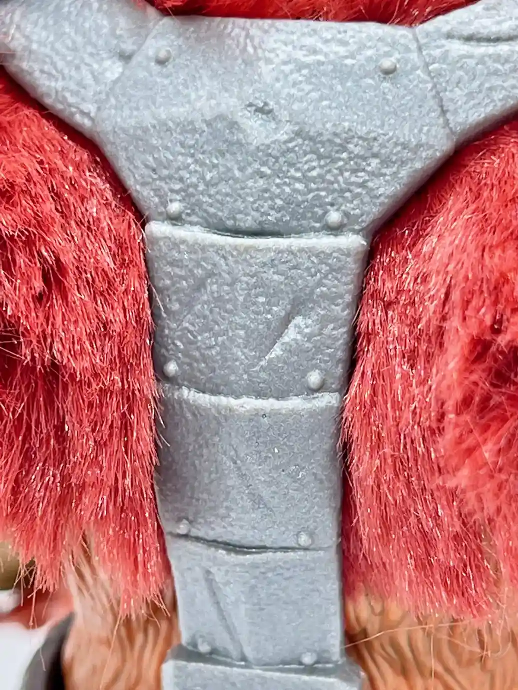 Talk about a blast from the past as the vintage chest armor really leans into the vintage and Classics style! The armor goes around his head and the fur texturing and brown washing give it a different color as not compete with all of the reds, browns, and oranges. It has 4 brown spikes around the left and right side where his shoulders are and two deep orange straps that go under his arms that secure with one single point in the back above his belt. Looking at Beast Man from behind, his armor goes down to his upper back and you can see some of the spikes.