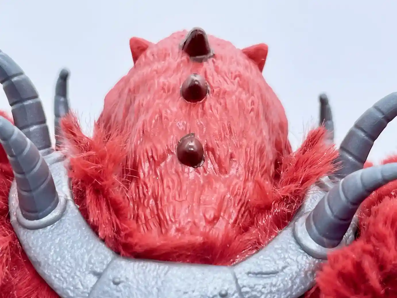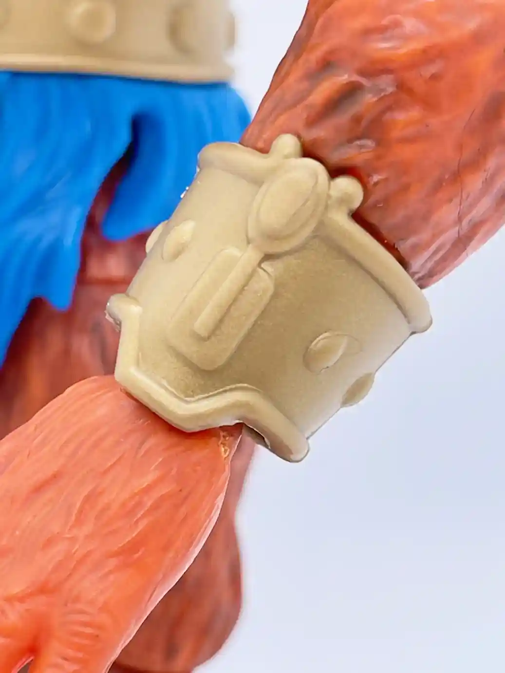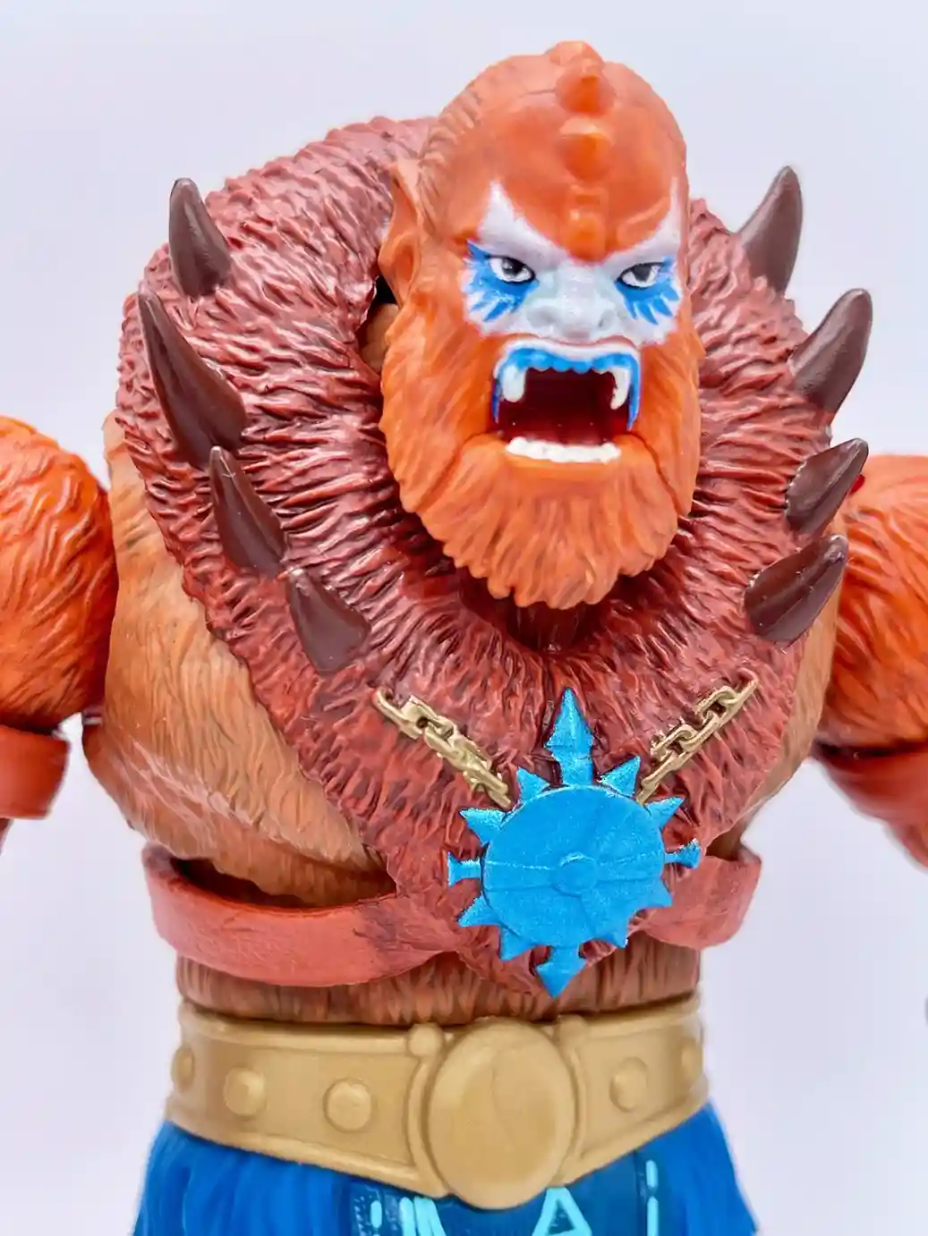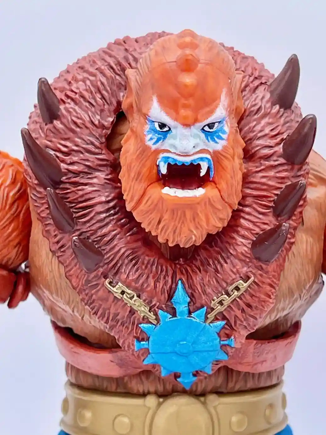 Talk about a blast from the past as the vintage chest armor really leans into the vintage and Classics style! The armor goes around his head and the fur texturing and brown washing give it a different color as not compete with all of the reds, browns, and oranges. It has 4 brown spikes around the left and right side where his shoulders are and two deep orange straps that go under his arms that secure with one single point in the back above his belt. Looking at Beast Man from behind, his armor goes down to his upper back and you can see some of the spikes.