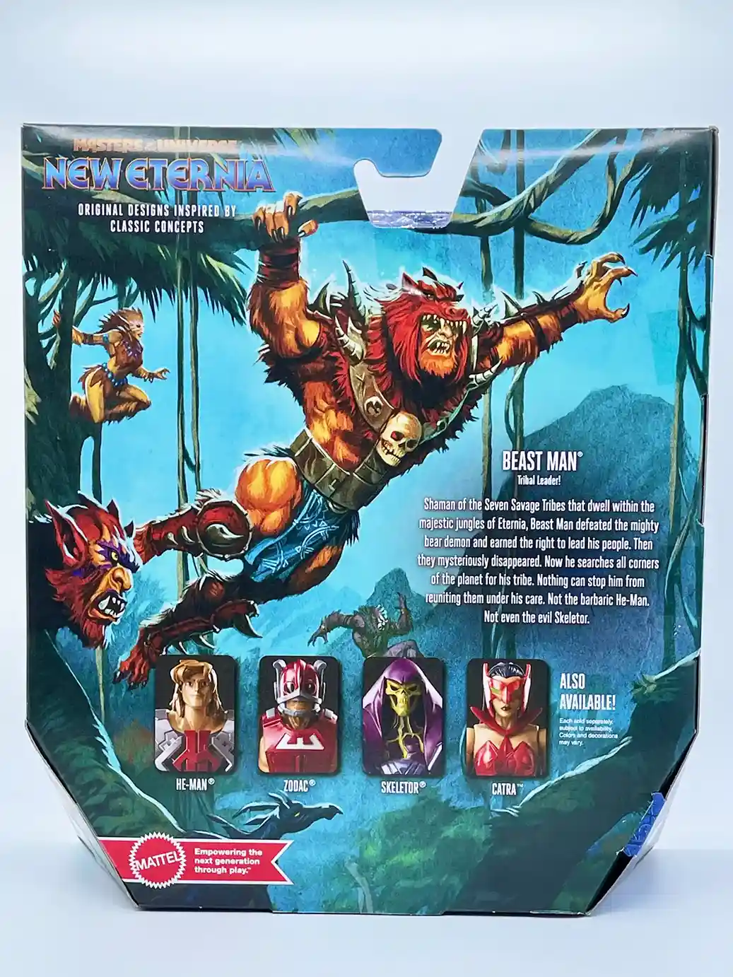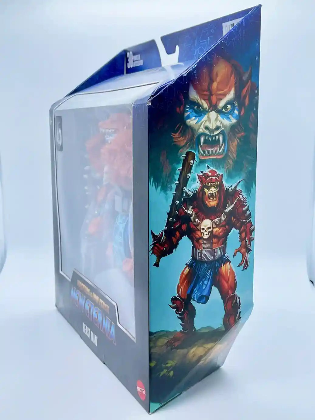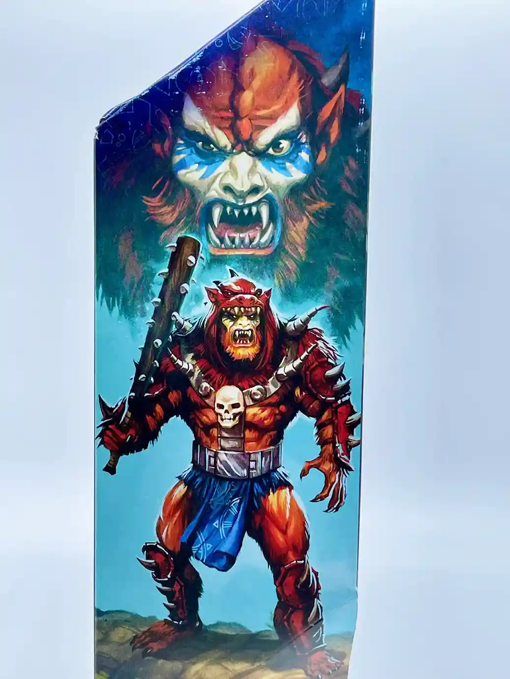 Beast Man comes in the deluxe single figure box and the last figure to be packed this was Skelegod! The vintage style image on the side of the box is amazing as it really brings back the feels of the 80’s figure we grew up with but with a more updated look! The fierce look on Beast Man’s face is the only way to give this creature the honor he deserves. You can see the baby blue outline of the war paint around the eyes and around the mouth, which looks great! We also get a sneak peak into the other Beast’like creatures he pals around with as there is a female and another male at appear to be of the same species. Interesting to note that in the original box art illustrations from yo_tengo_el_poder, the floating Barbarian Skeletor head is not present as I am sure Skelly’s mellon had to get nixed because it competed with the writing on the back of the box.