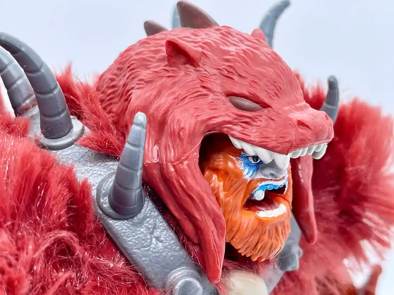Once the headdress is removed, the vintage inspired head sculpt shines through as the classic white with blue paint is the Beast Man we all know and love from the 1980’s. With an open mouth bearing his teeth, this is the look we were hoping to see out of the Masterverse line. The fur looks very realistic around the cheeks and chin and we love that the spiked bones in the middle of the head blend in and are not painted a different color.