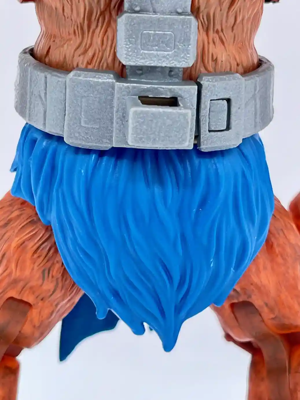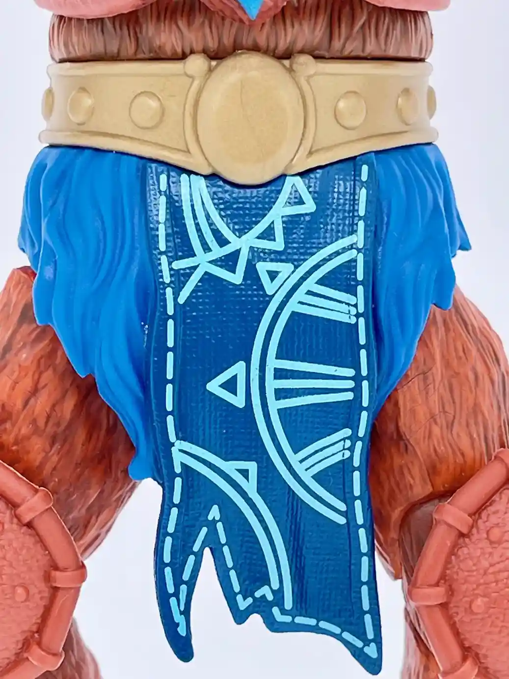 His belt is a unique piece and was made special for this version of Beast Man as Mattel created a brand new style. There are the usual circular shapes going around the belt but in the middle their is more of an ornate shape that is on both sides of the larger jewel. In a departure from the vintage look, and keeping with his New Eternia styling, he has a Hawaiian looking loin cloth that has some cool shapes to it. It is tattered and gives Beast Man that unique styling that we’ve never seen before. The furry loin covering (or shorts) are more of a darker blue than we’ve seen on Beast Man but the color ties in nicely with his face paint. From the back, you just see his dark blue furry shorts and his gold belt. For those who don’t like the secondary loin cloth, try carefully cutting it off with an X-Acto knife if it bothers you.