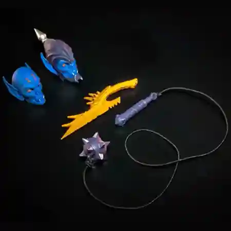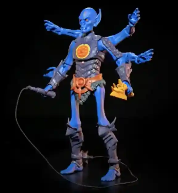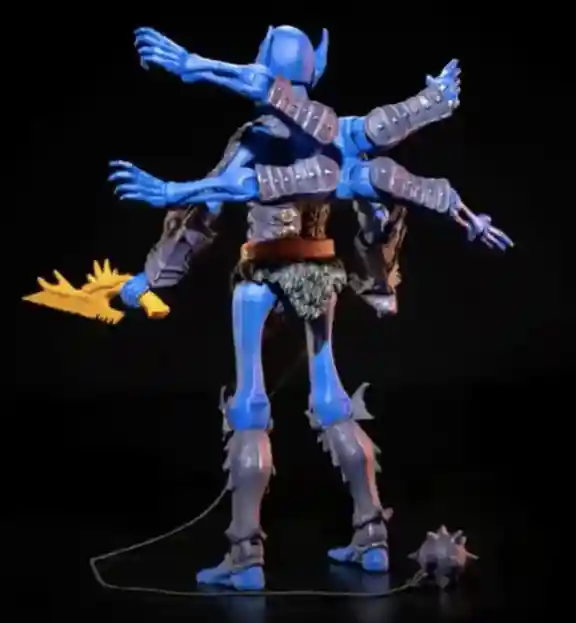 We are calling Okeaetos a MOTU tribute figure as the Four Horsemen have paid homage to MOTU characters in the past. This figure is a nod to Webstor from the Masters of the Universe line with its arachnid appearance, coloring, and limb design. There are strong ties with the string that connects to the into the handle and the mace head and the string has the vintage type feel to it as Webstor came with a string attached to his hook. Like with past Power-Con debuts, the used really bright colors that we don’t see outside of Power-Con but the figure fits in nicely with the line.