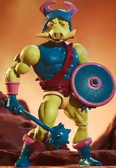 Pig-Head is the nemesis of the Rulers of the Sun gang. Where Skeletor is He-Man’s counter-part, so is Pig-Head to Sun-Man. So, I find it odd that Digitino is the next Rulers of the Sun figure to be named as part of Wave 9. You would think Mattel would pair these two up so that kids had their evil nemesis to play against. Pig Head has an interesting green skin color, boar like tusks protruding from his mouth and a big pig-like snout for a nose. He wears a teal-colored helmet with pink horns, pink wrist bracers, teal colored chest, burgundy chest strap and matching burgundy belt with red accents. His shorts are interesting as they are of a light-yellow color but look like they have a scaly texture, unlike the loin cloths of the rest of the MOTU gang. He wears teal colored boots with pink furry tops. Pig-Head is wheedling a teal spiked mace and pink and teal colored shield. Pig-Head is a very interesting character in the Rulers of the Sun, as he is the only non-humanoid beast-like creature in the group. I think this is great to bring variety to the group, as MOTU fans as fond of creature like characters, so he fits in nicely! Again, he too matches his vintage counter-part in classic origins fashion.