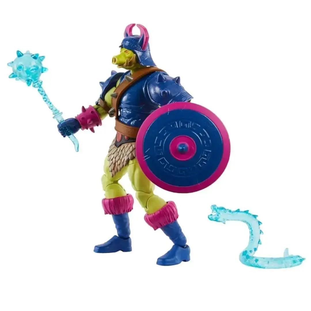 Pig Head was revealed at this year’s SDCC and he was the stand out of the bunch with his bright pops of color and his pack out! Also, later this year, Pig-Head appeared on a leaked list of Amazon Exclusives back in Sepetember so let’s take a close look at the arch nemesis of Sun-Man from the Rulers of the Sun Masterverse sub-line.
