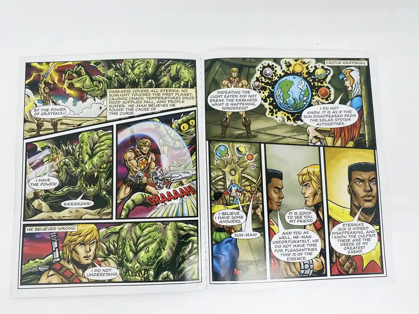 In this issue, 200X He-Man battles an evil green monster, when suddenly darkness falls onto Eternia. He-Man confers with the Sorceress at Castle Grayskull to see what is going on, and she says that the sun has disappeared from the Solar System all together. She calls on Sun-Man to help answer what has happened to the sun. Sun-Man tells He-Man and the Sorceress that his greatest enemy is behind the disappearance of the sun.