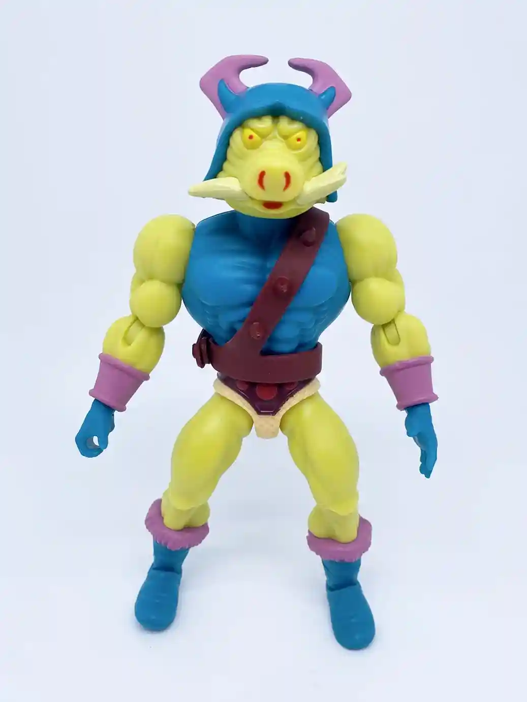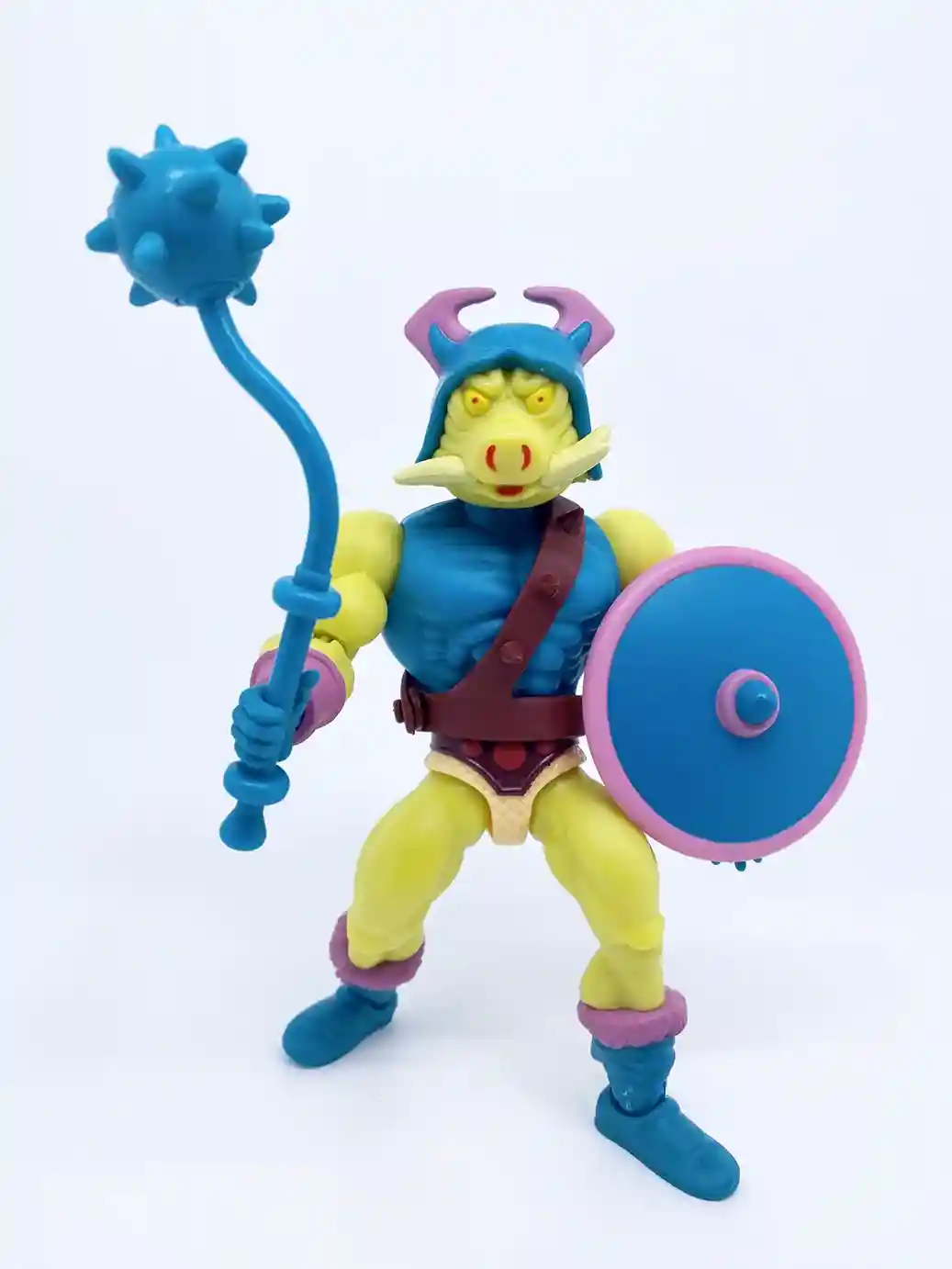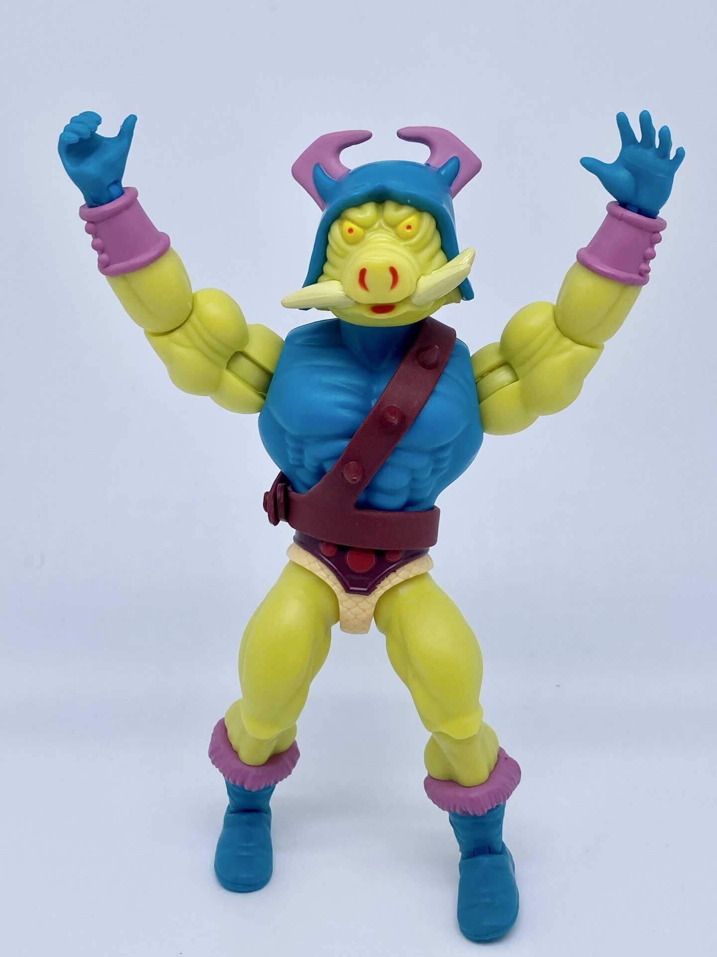 Pig Head, the Wicked Enemy of Sun Man is more or less a direct translation of the vintage figure but with much brighter colors. The pinks, greens, and blues definitely pop more on this figure and more more loud, which goes along with the other MOTU Origins figures.