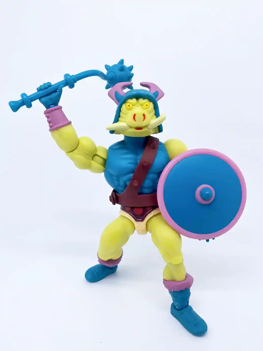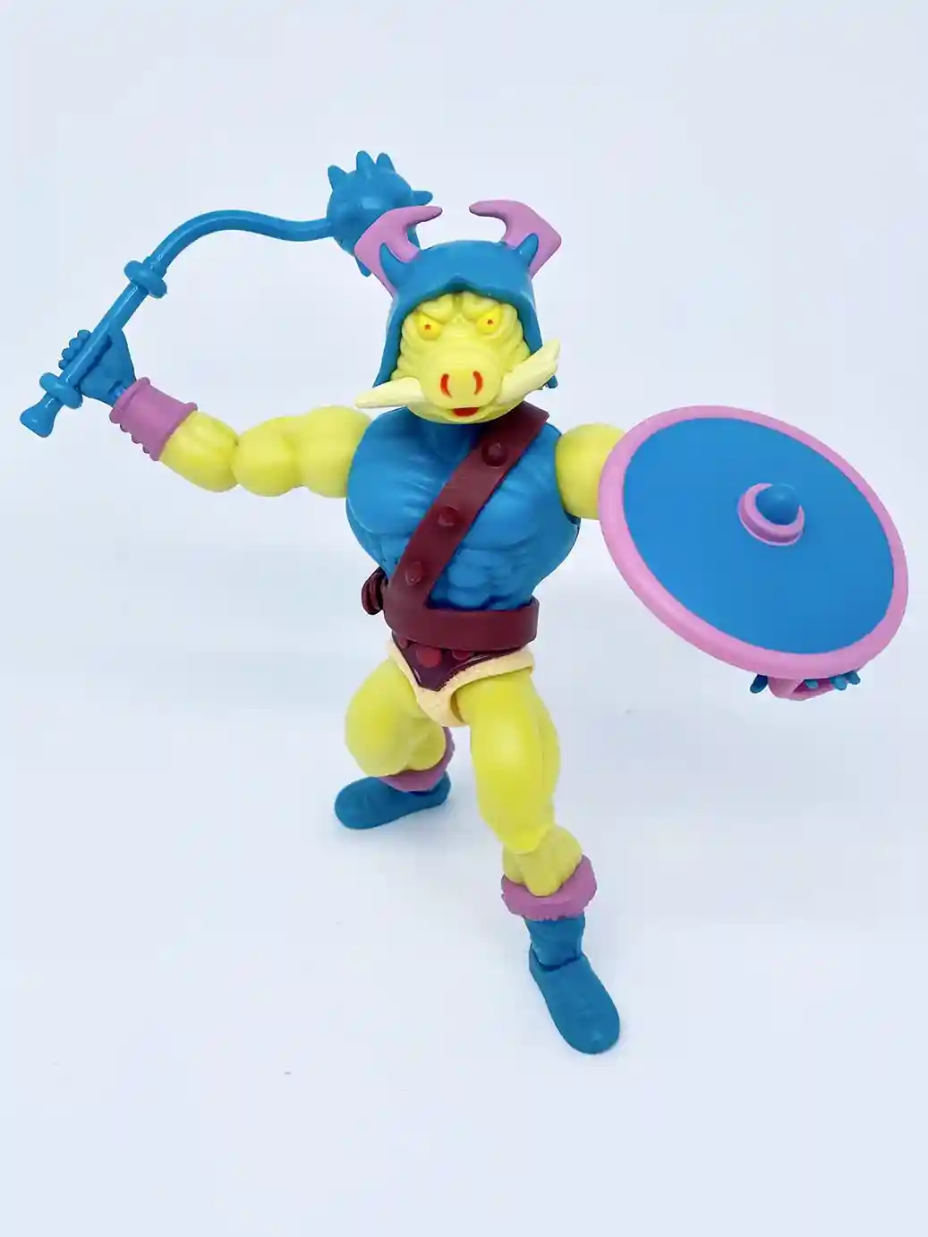 Pig-Head is the nemesis of the Rulers of the Sun gang. Where Skeletor is He-Man’s counter-part, so is Pig-Head to Sun-Man. Pig Head has an interesting green skin color, boar like tusks protruding from his mouth and a big pig-like snout for a nose. He wears a teal-colored helmet with pink horns, pink wrist bracers, teal colored chest, burgundy chest strap and matching burgundy belt with red accents. His shorts are interesting as they are of a light-yellow color but look like they have a scaly texture, unlike the loin cloths of the rest of the MOTU gang. He wears teal colored boots with pink furry tops. Pig-Head is wheedling a teal spiked mace and pink and teal colored shield. Pig-Head is a very interesting character in the Rulers of the Sun, as he is the only non-humanoid beast-like creature in the group. I think this is great to bring variety to the group, as MOTU fans as fond of creature like characters, so he fits in nicely! Again, he too matches his vintage counter-part in classic origins fashion.
