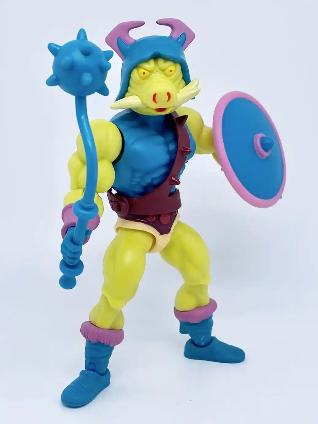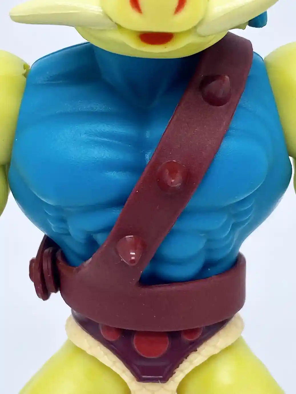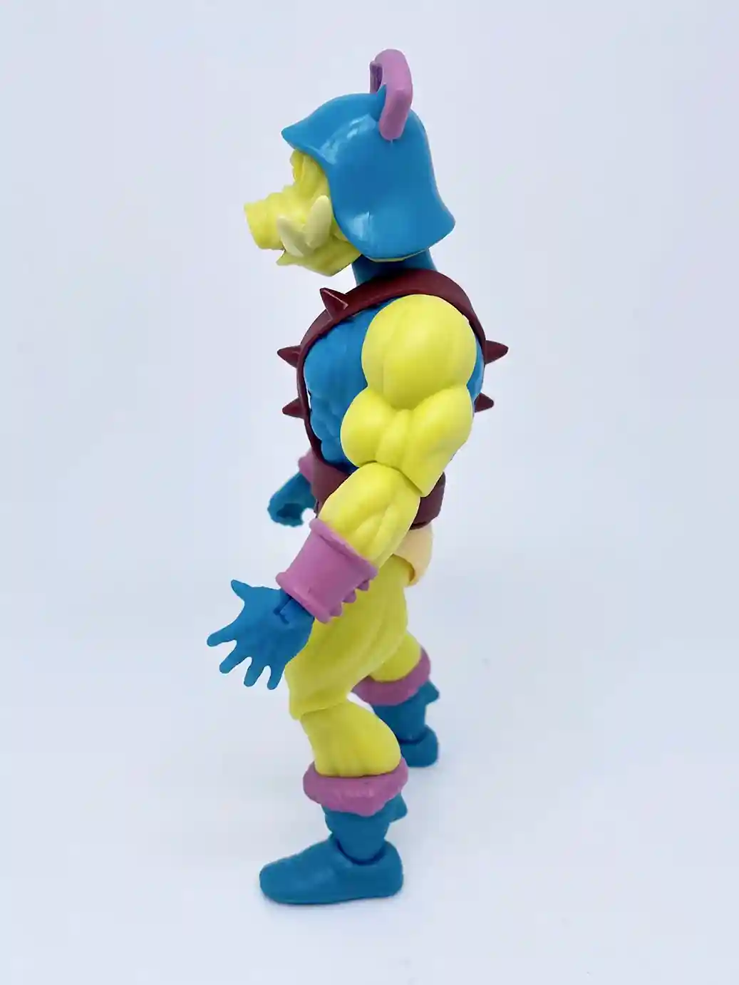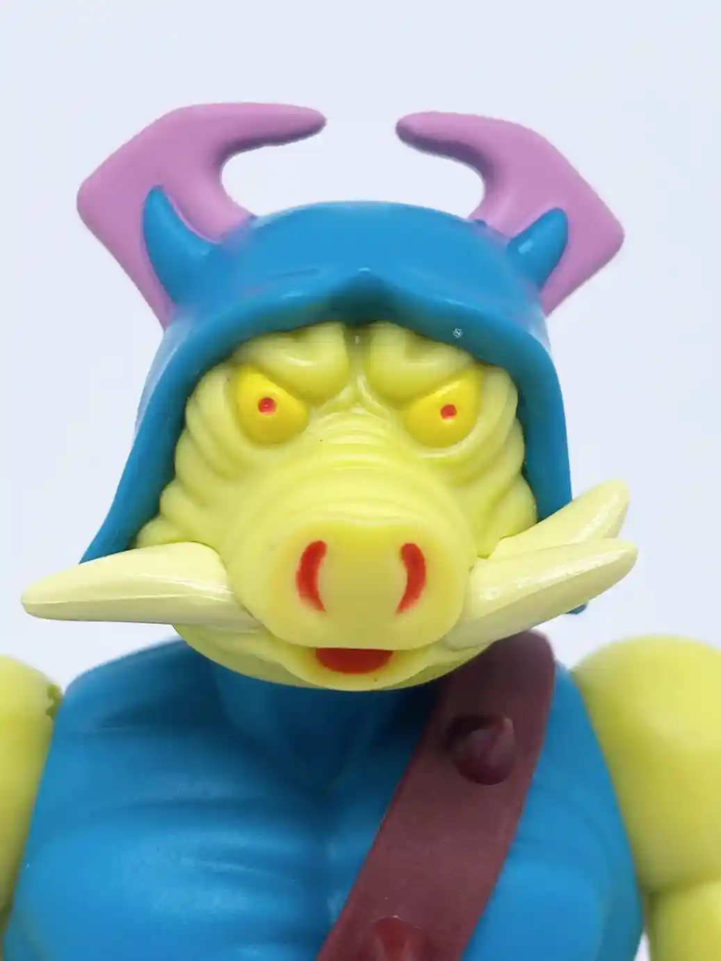 Pig Head’s head sculpt looks fabulous and matches almost exactly to the vintage figure. He is wearing a teal helmet with light purple-colored horns. He has a very pig like face in a lime green color with a huge snout and tusk coming out of either side of his face. On the right side he has one tusk and on the let there are two. His face has some nice detailed sculpted into it which help bring out the pig-like features in his face. He has piercing yellow eyes with beady little red pupils, and I just love how it makes him look!