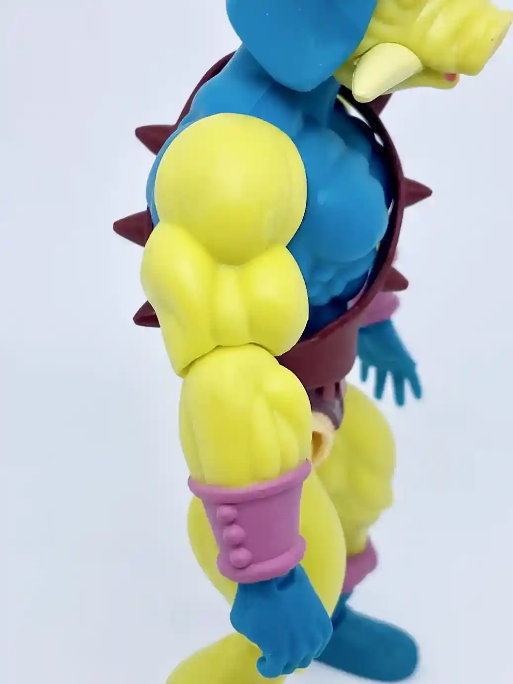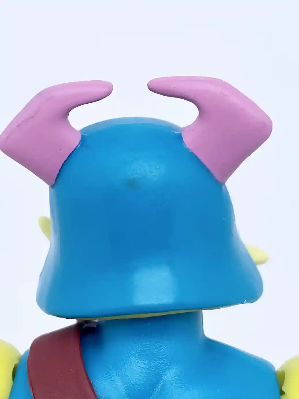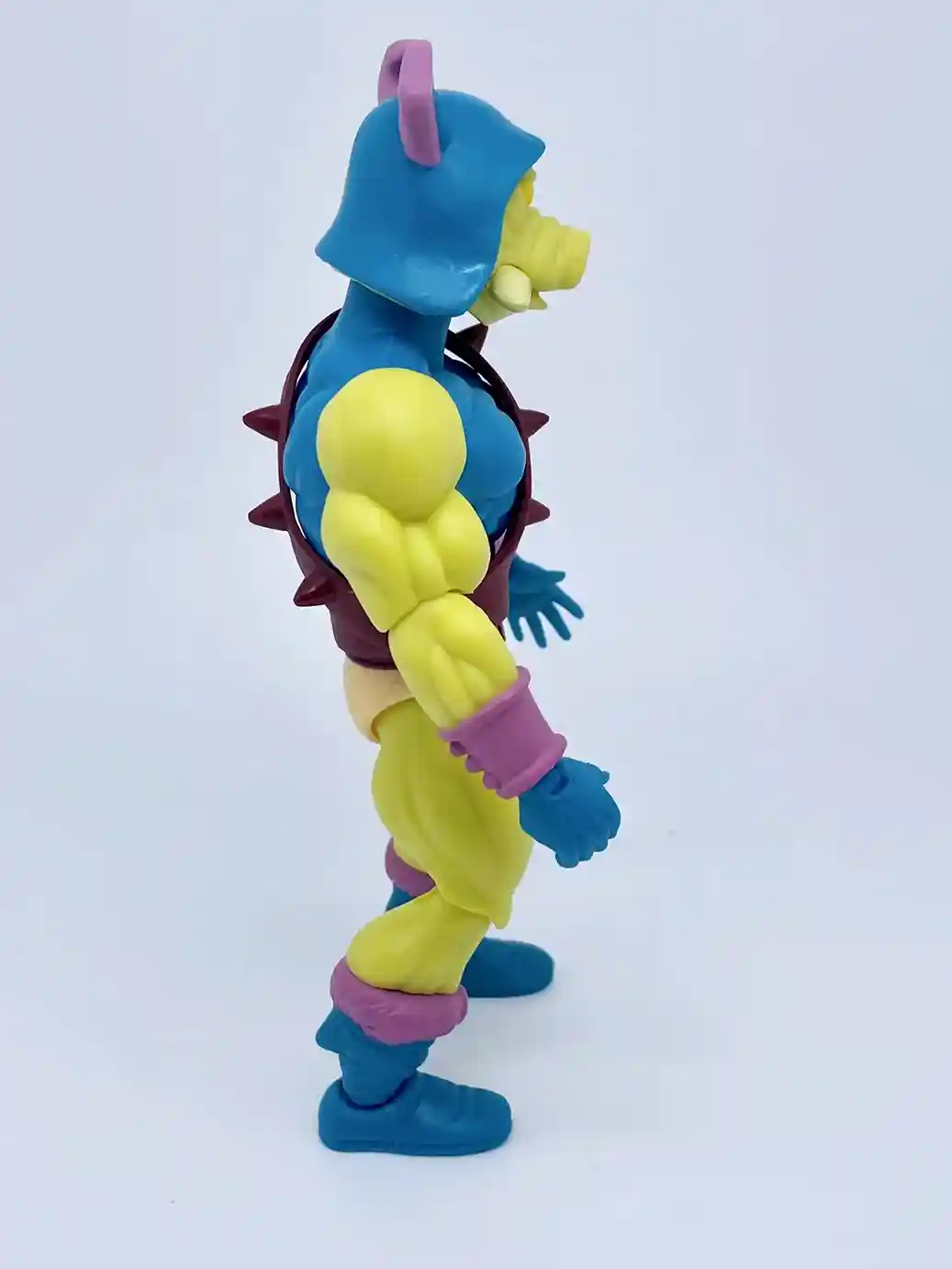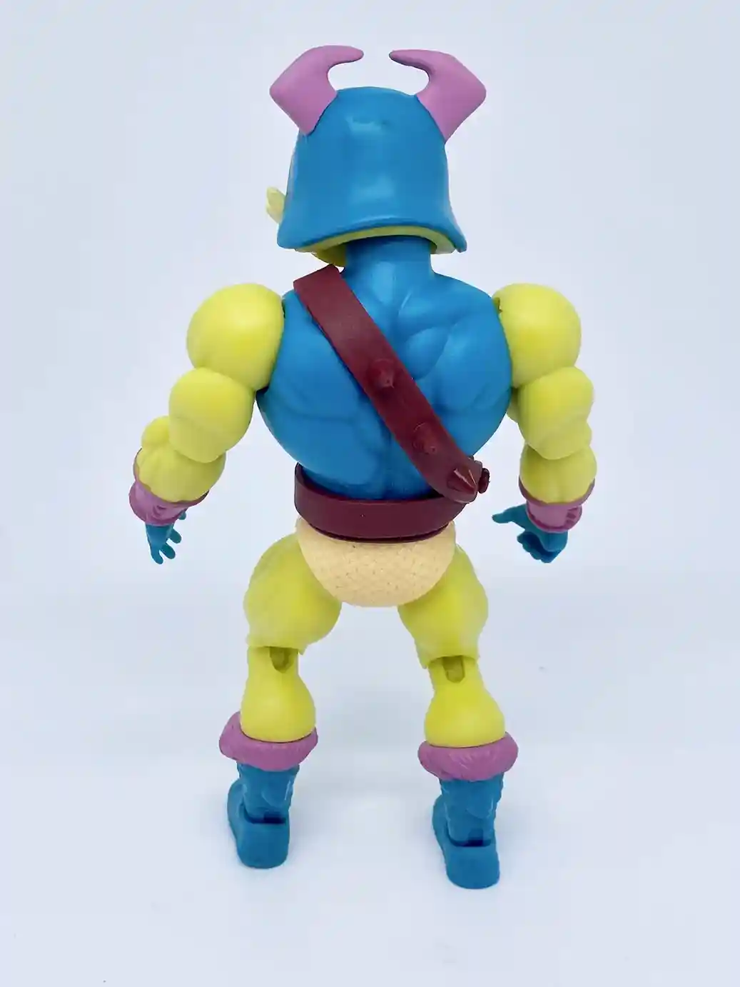 Pig Head’s head sculpt looks fabulous and matches almost exactly to the vintage figure. He is wearing a teal helmet with light purple-colored horns. He has a very pig like face in a lime green color with a huge snout and tusk coming out of either side of his face. On the right side he has one tusk and on the let there are two. His face has some nice detailed sculpted into it which help bring out the pig-like features in his face. He has piercing yellow eyes with beady little red pupils, and I just love how it makes him look!