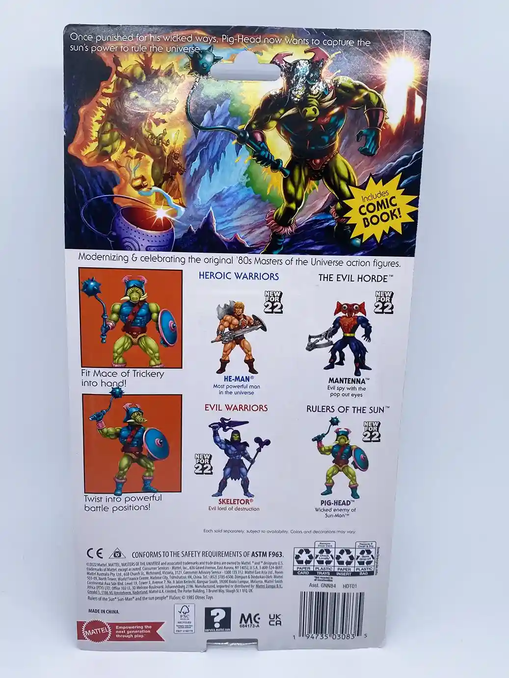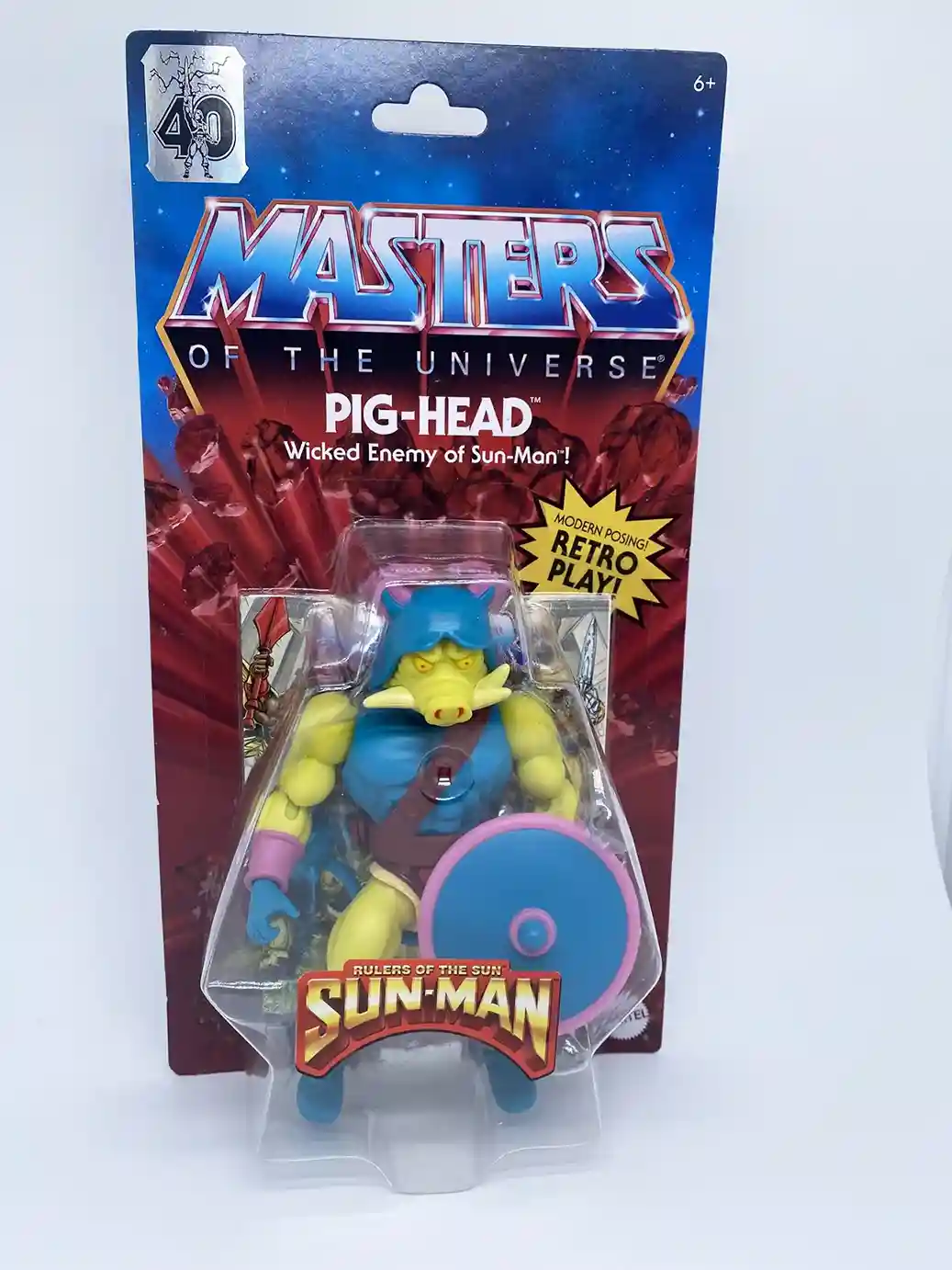 Pig-Head Masters of the Universe Origins style card has the 40th Anniversary sticker in the upper left, which looks like it will be the standard moving forward this year. Also, the figure has the Rulers of the Sun logo, like the single carded standard release of Sun-Man!