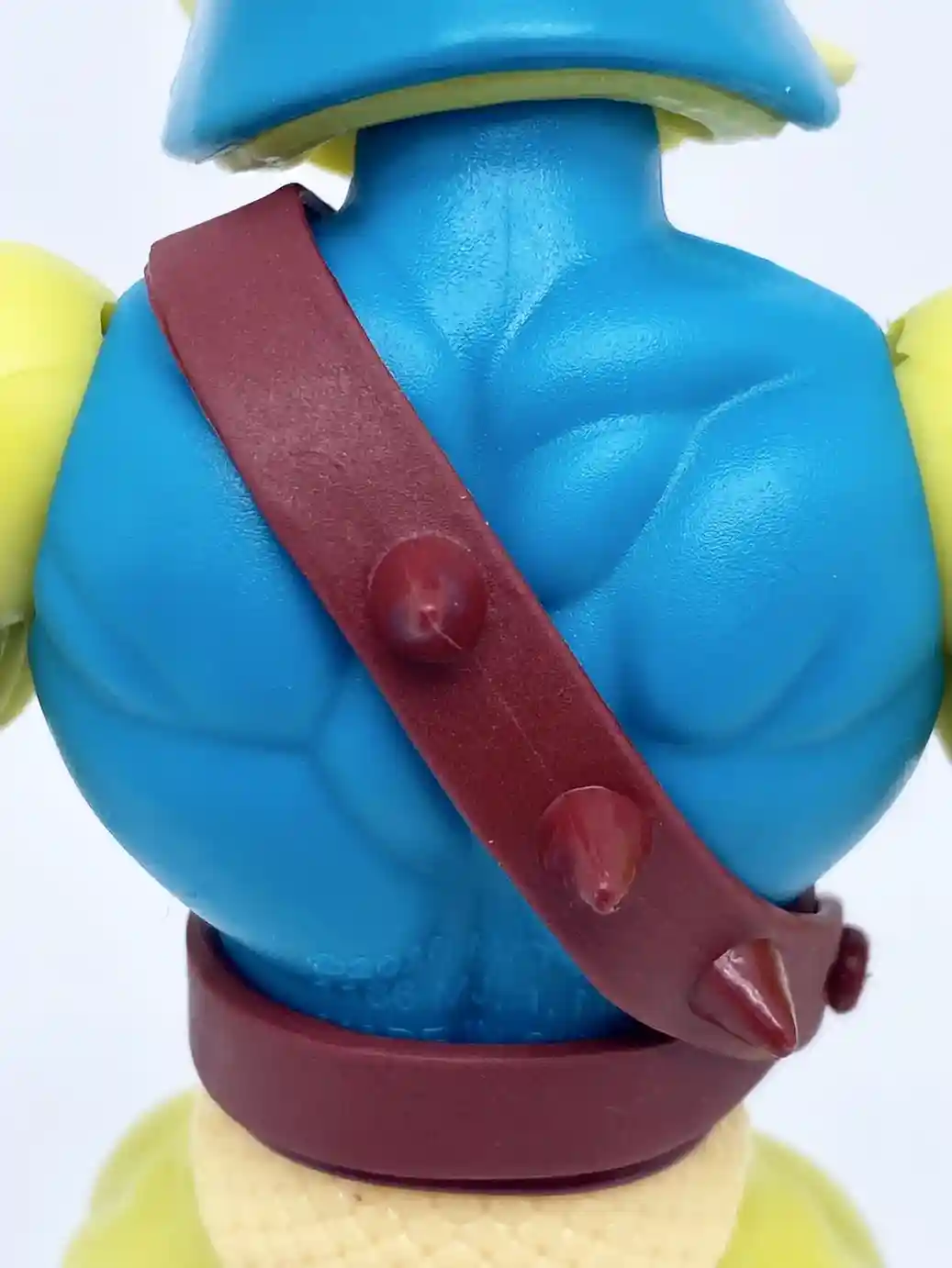 Pig-Head’s chest is made of the standard Origins buck in a teal-colored plastic. His chest and back design are the simple muscular torso that is common to most of the Origins figures. He is wearing a burgundy-colored spiked chest strap that clasps on the right side. The spikes wrap around the front and back and look just like the vintage Pig Head action figure.