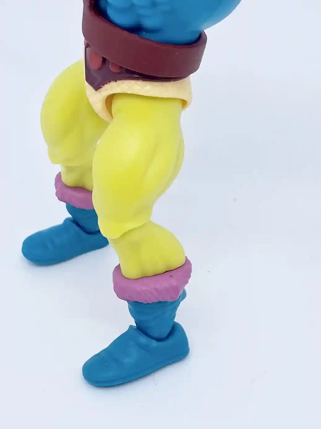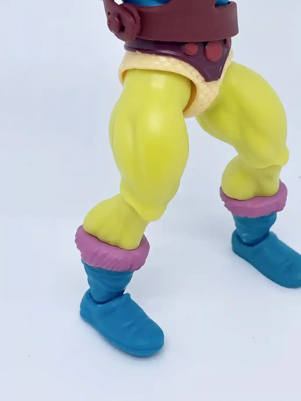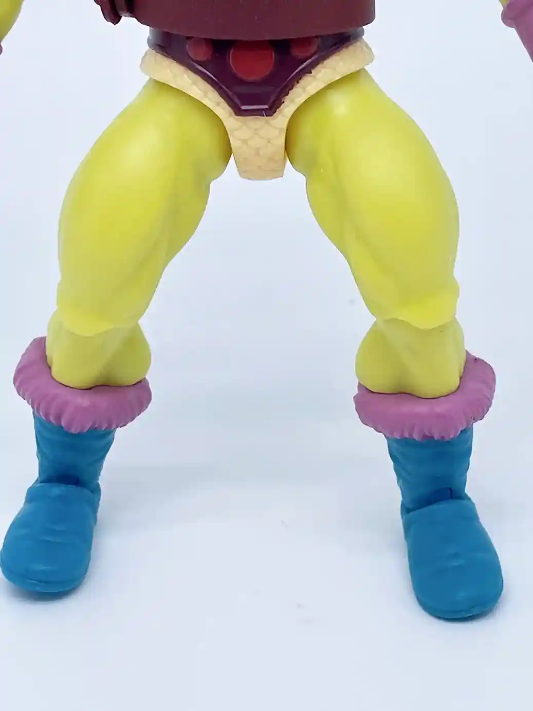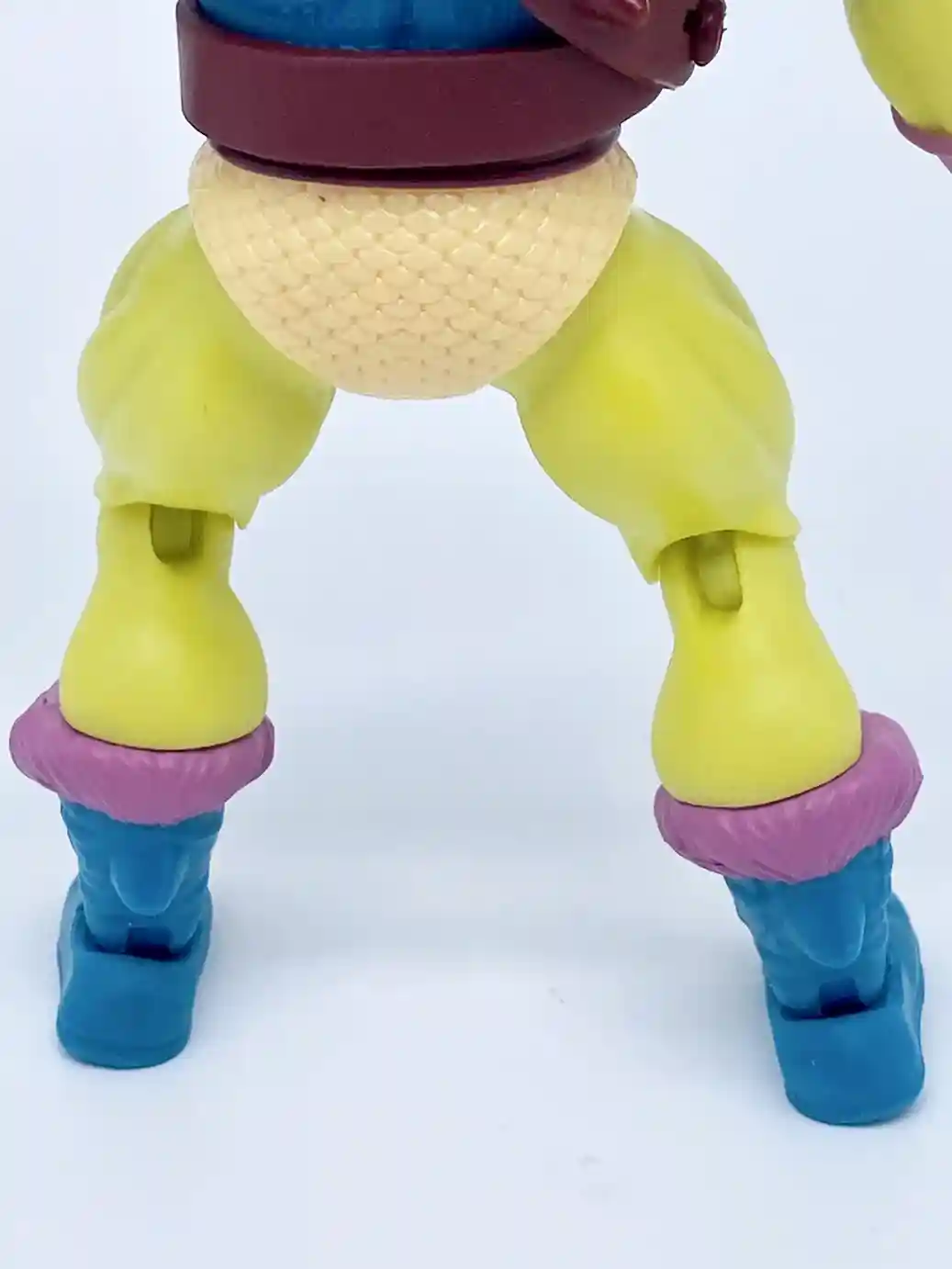 Pig Head’s legs and boots use the standard human buck leg and buck design just like He-Man. His legs too are of a bright lime color, and he is wearing teal-colored boots with a pink furry lining on top.