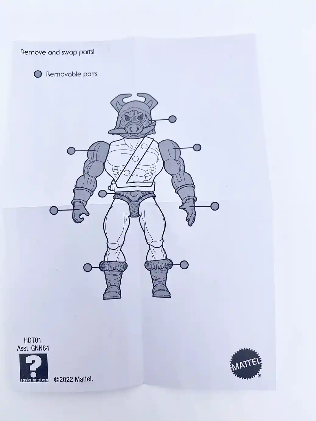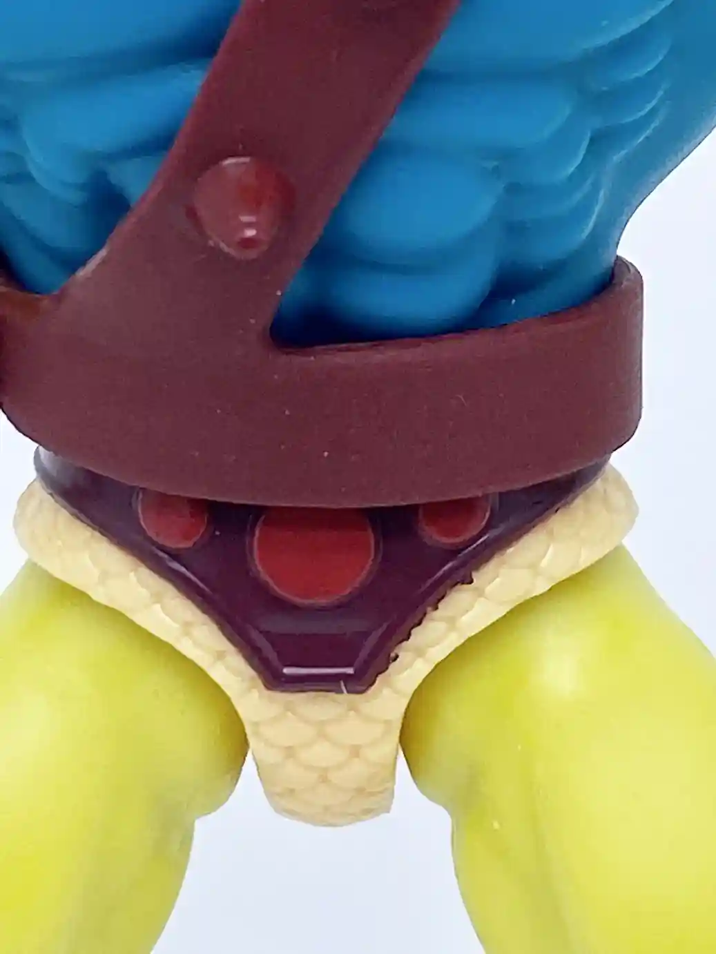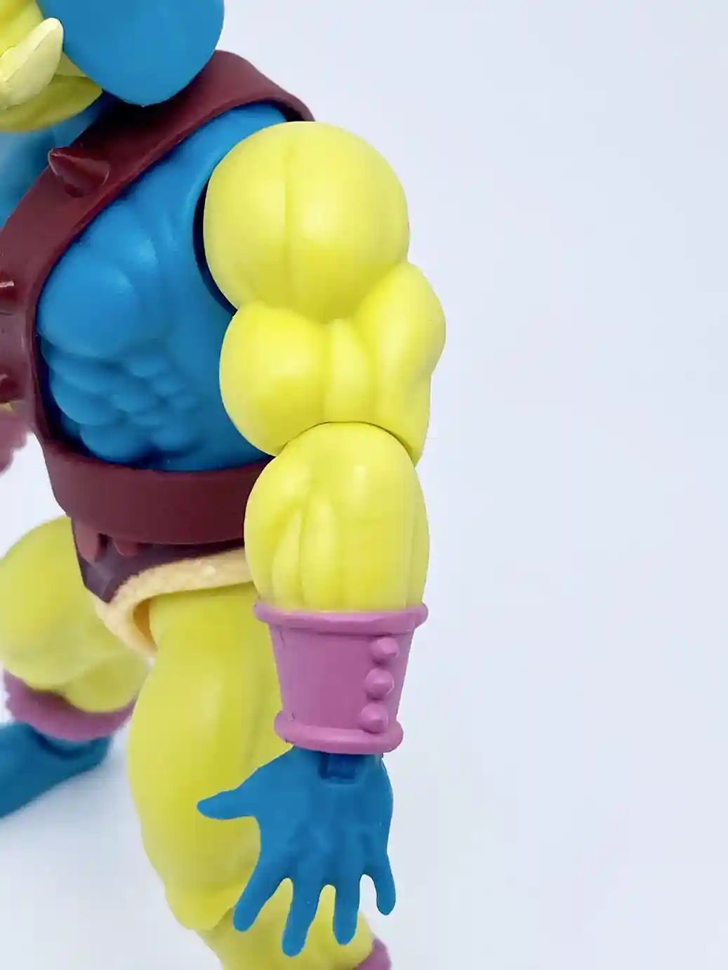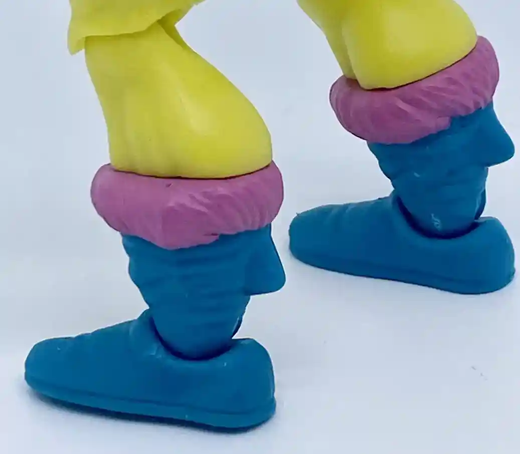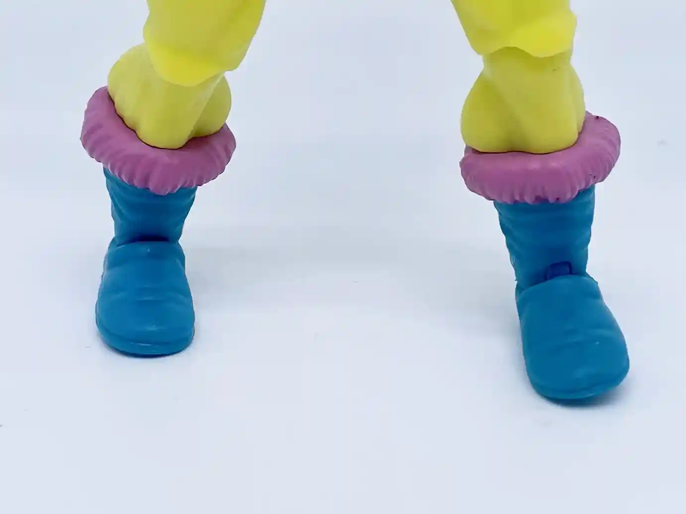 Pig Head’s legs and boots use the standard human buck leg and buck design just like He-Man. His legs too are of a bright lime color, and he is wearing teal-colored boots with a pink furry lining on top.