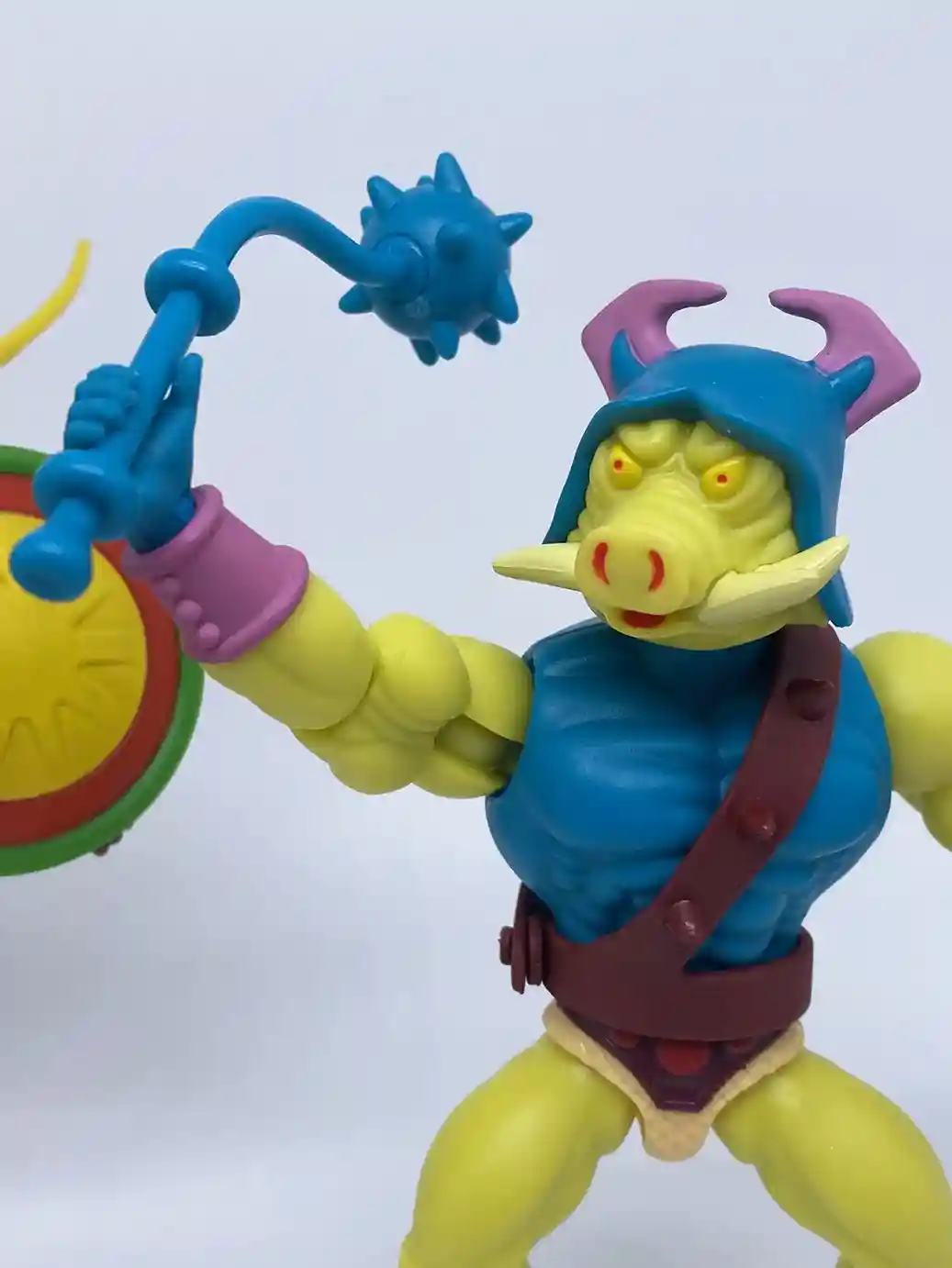 Pig Head comes with 2 accessories. His shield and his spiked mace. These looks just like the ones that were included with the vintage action figure. He looks super cute holding his weapons and the color choices really make them pop!