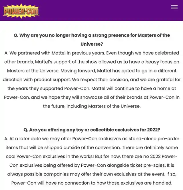 If you’ve been keeping track of historical announcements regarding Power-Con exclusives, they typically get announced in the February and March months (sometimes as far out as April) but those months have come and gone! Also, Power-Con has published an update on Mattel’s presence and the lack of exclusives on their FAQ section of their website. This begs the question, where are the Power-Con Masters of the Universe exclusives or any exclusives for that matter? Sadly, according to Power-Con’s FAQ section, Mattel is going a different direction this year and will not be creating exclusives for the 2022 Power-Con event.