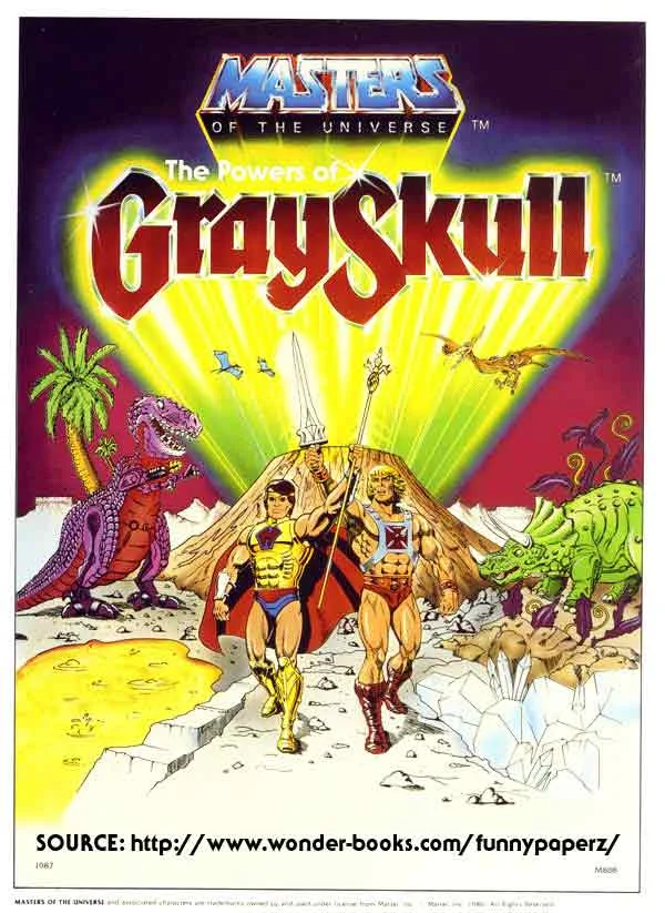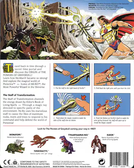 “Travel back in time through a secret time portal–and discover the ORIGIN of THE POWERS OF GRAYSKULL! Learn how He-Man became so strong! And explore the magical world of Preternia–home of HE-RO, the Most Powerful Wizard in the Universe! Monstrous dinosaurs and fierce giants–both good and evil–struggle for control of this strange & hostile land! The dinosaurs in the time of Grayskull–Tyrantisaurus Rex, Bionatops and Turbodactyl–each possess a fantastic mechanical power! Can HE-RO master all the good magic of the Ancient Wizards, and protect future Eternia from forever falling in the claws of evil? Look For HE-RO and The Powers of Grayskull coming your way in 1987!”