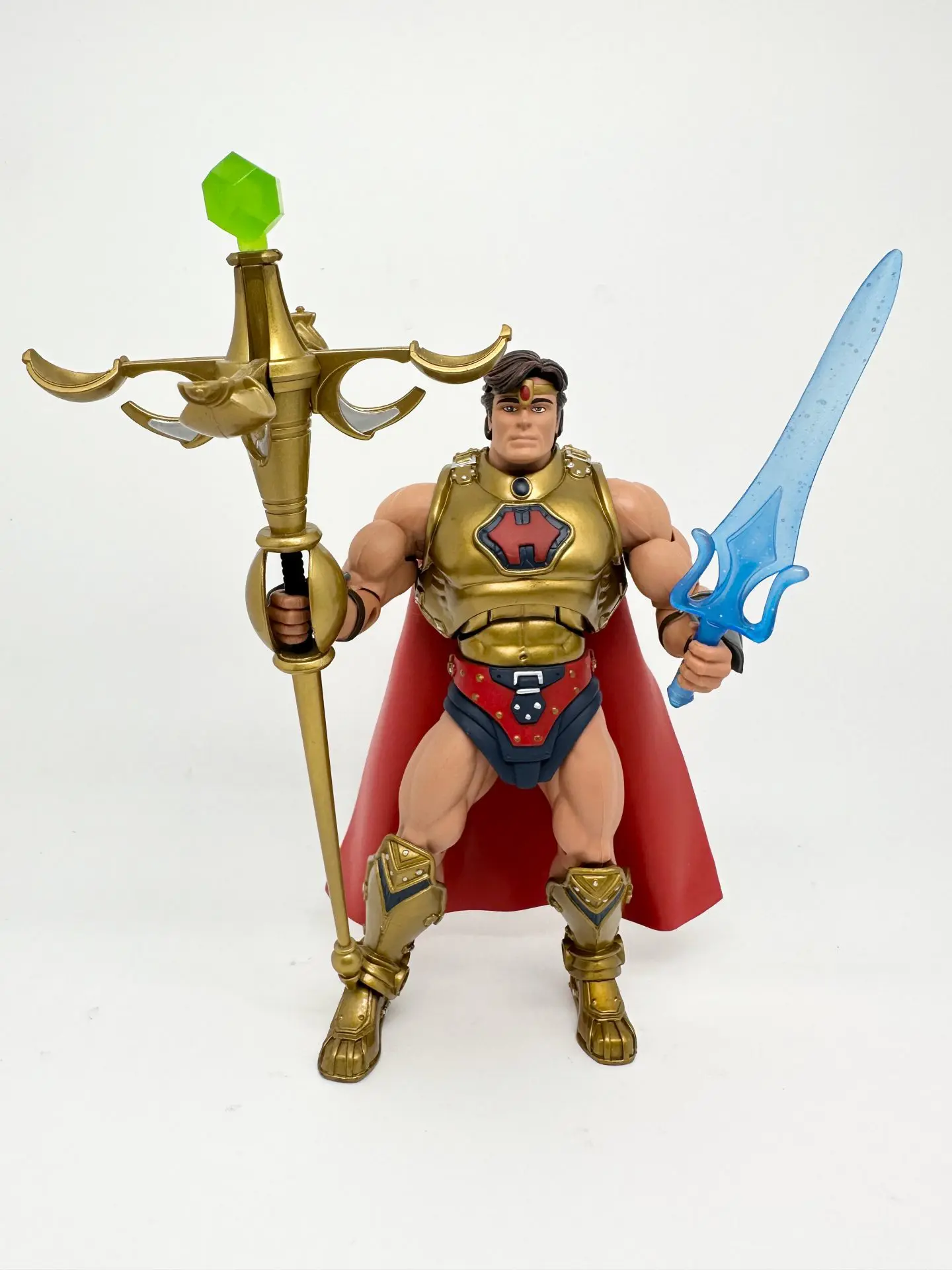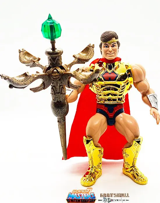 Fast forward the clock to 2018, and here comes Super7 with their awesome retro style 5.5″ Masters of the Universe figures. They did what Mattel was unable to do nearly 35 years earlier, they actually produced a stunning He-Ro action figure, shiny gold vac-metal armor and all! He included his staff of power. When you pressed down on the top of the staff, the staff opened up like a flower petal and revealed a beautiful translucent green gem inside!