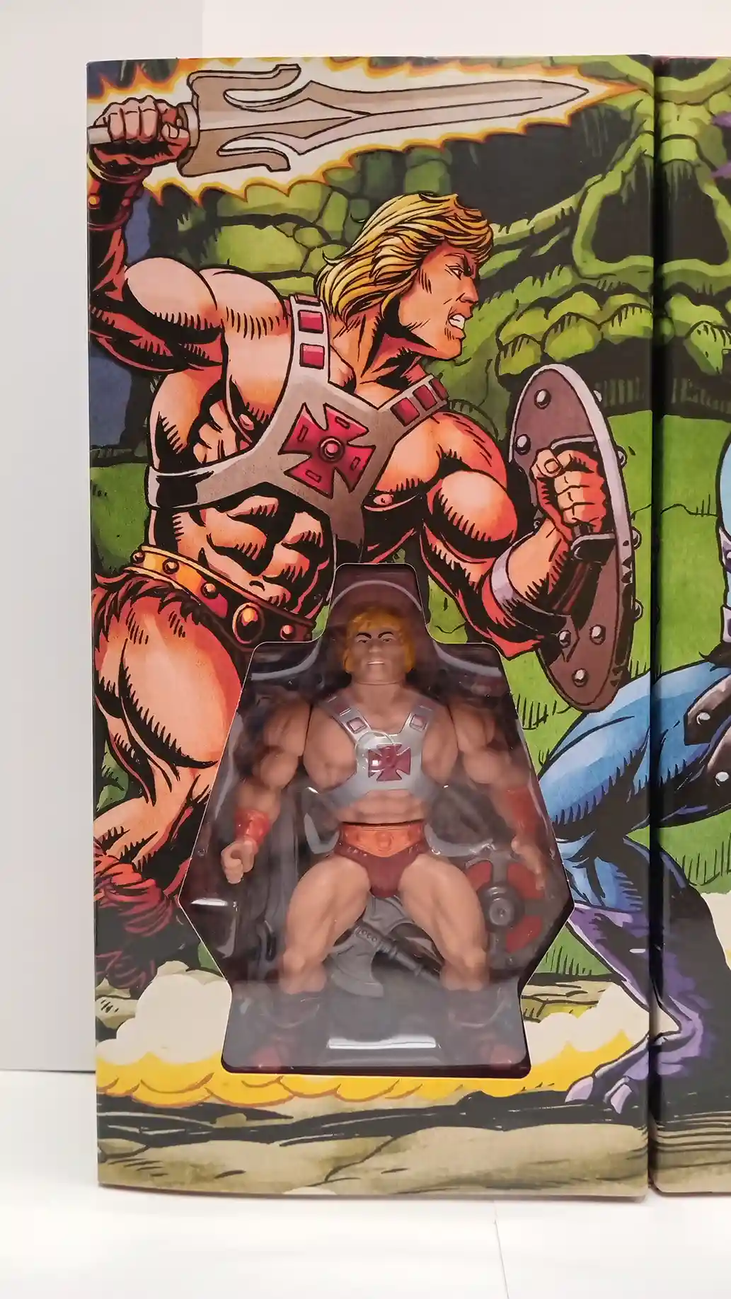 Both figures sit inside sharply cut window trays that echo the shape of the vintage blister bubbles, giving them that retro carded feel even within a boxed set. He-Man and Skeletor are centered neatly against the illustrated backdrop, with the angled plastic edges drawing attention to their torsos and faces just like the original packaging style did in the ’80s. This framing not only shows off the figures but also reinforces the nostalgic nod to their classic presentation.