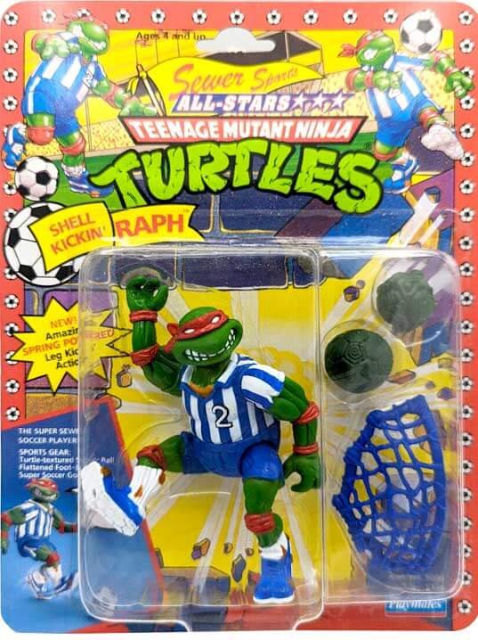 Ten times winner of the mutant world cup, Shell Kickin’ Raph’s got the moves of a real half-shell Champion! Figure is 4” high, designed to match his original release, and comes in retro packaging with soccer accessories.