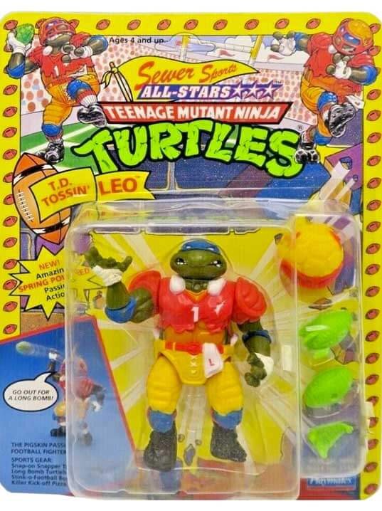 Known for his cool maneuvers on and off the playing field, TD Tossin’ Leo’s the golden arm of the Snapping Turtles. He once made 400 complete passes in a row—to himself! Known for passing, catching and tackling, TD’s a one-mutant Turtle team! His sewer strategy always shreds Shredder’s best Bebop defense. TD’s most notorious play is the long stinko bomb. When asked about his secret to success, TD said, “Lots of practice, lots of pizza.” Figure is 4” high, designed to match his original release, and comes in retro packaging with football accessories.