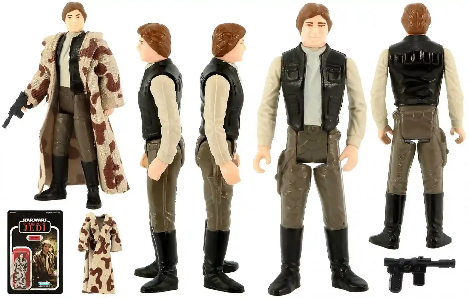 Here we can see what the 1983 Return of the Jedi Han Solo in Trench Coat Figure looked like. As you can see the new Retro Collection Version is a perfect Homage to this version. Thank you to the Return of the Jedi) Visual Guides (jeditemplearchives.com) for this great overview on this figure!