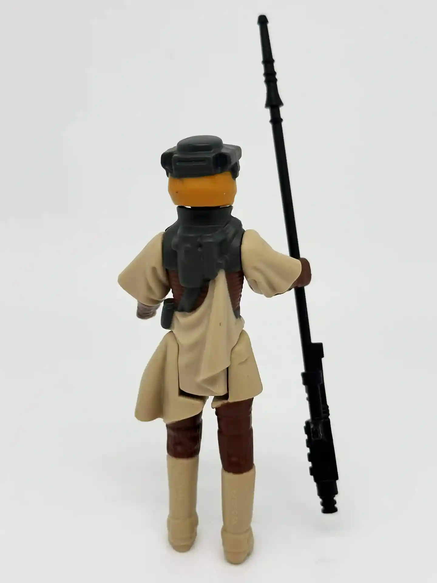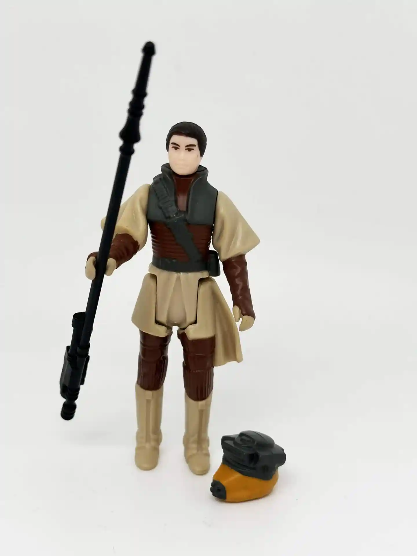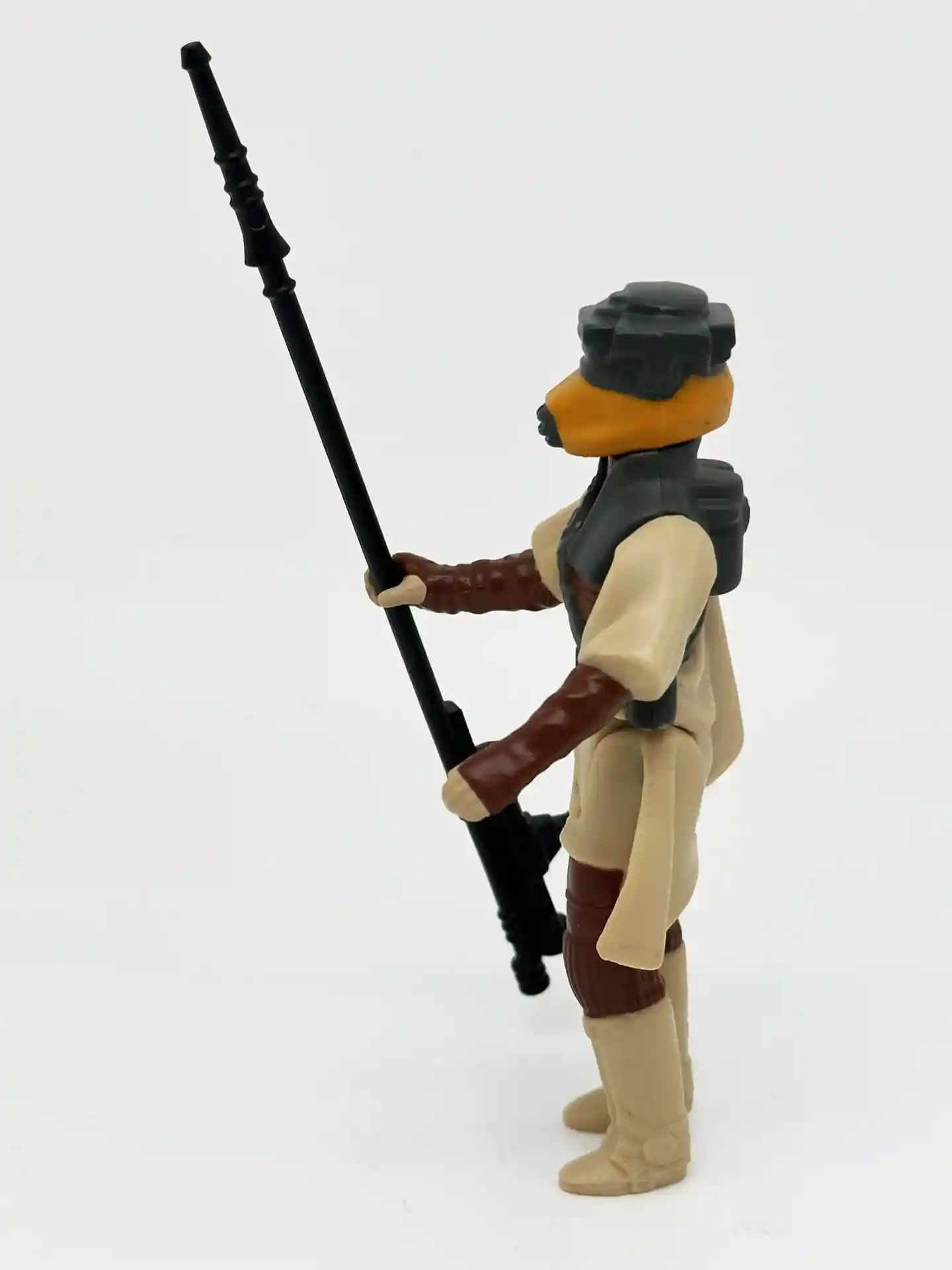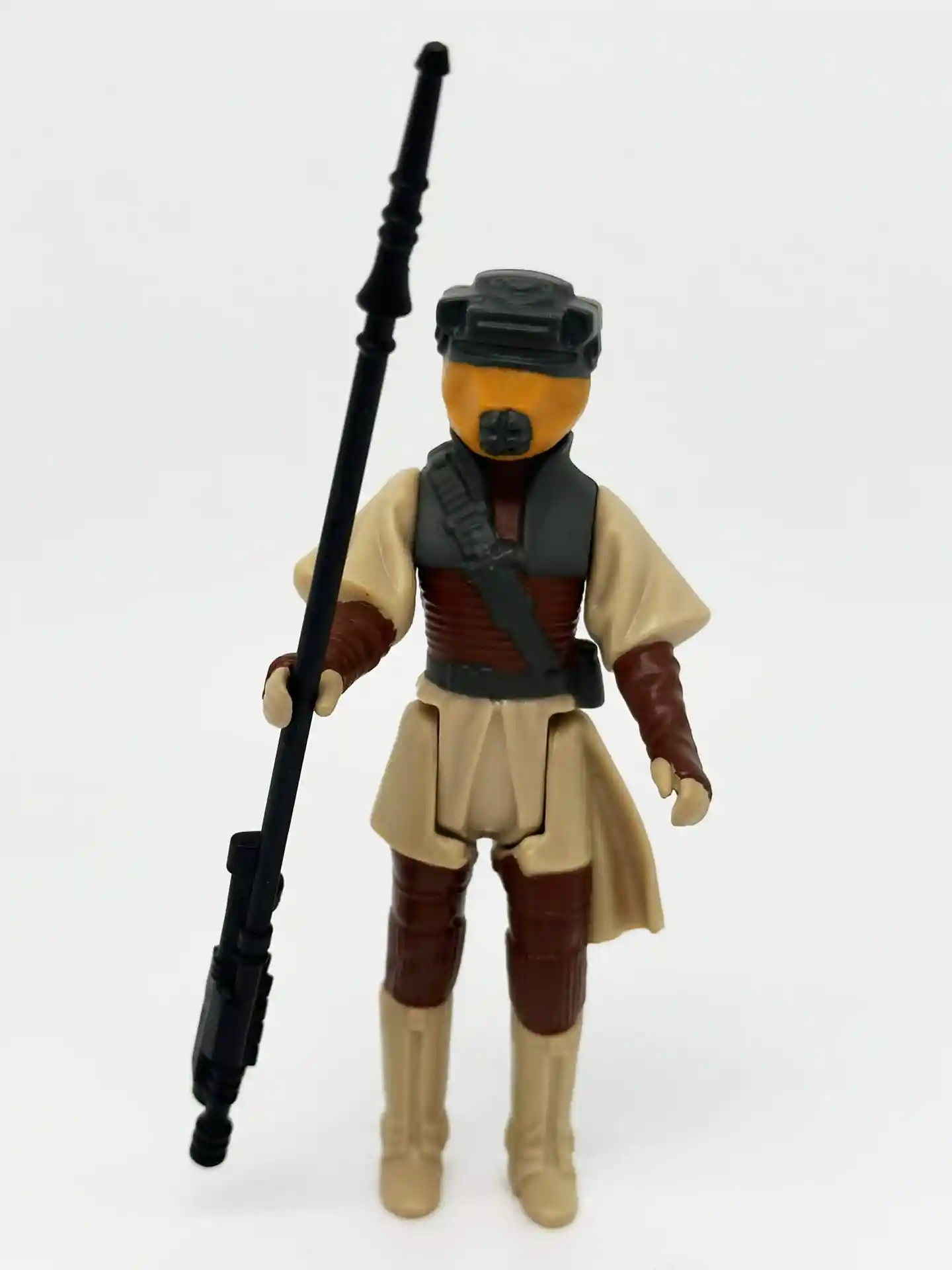 Lando Clarrisson the smooth talking space pirate, dawns a Skiff Guard outfit to go undercover to help rescue Han Solo. When his old friend Han Solo was held captive by Jabba the Hutt, Lando joined Princess Leia in a mission to rescue him from Jabba’s palace. Lando too was a very memorable figure and unique as since he also came with a separate helmet to complete his disguised look. Lando has a very kind looking face and bright white eyes that peek thru that Skiff helmet of his! We all remember the scene in Jabba’s Palace when Lando sneaks in and helps to free Han Solo! Now you can recreate that memorable scene! Lando comes complete in his Skiff Guard outfit with his staff and helmet.