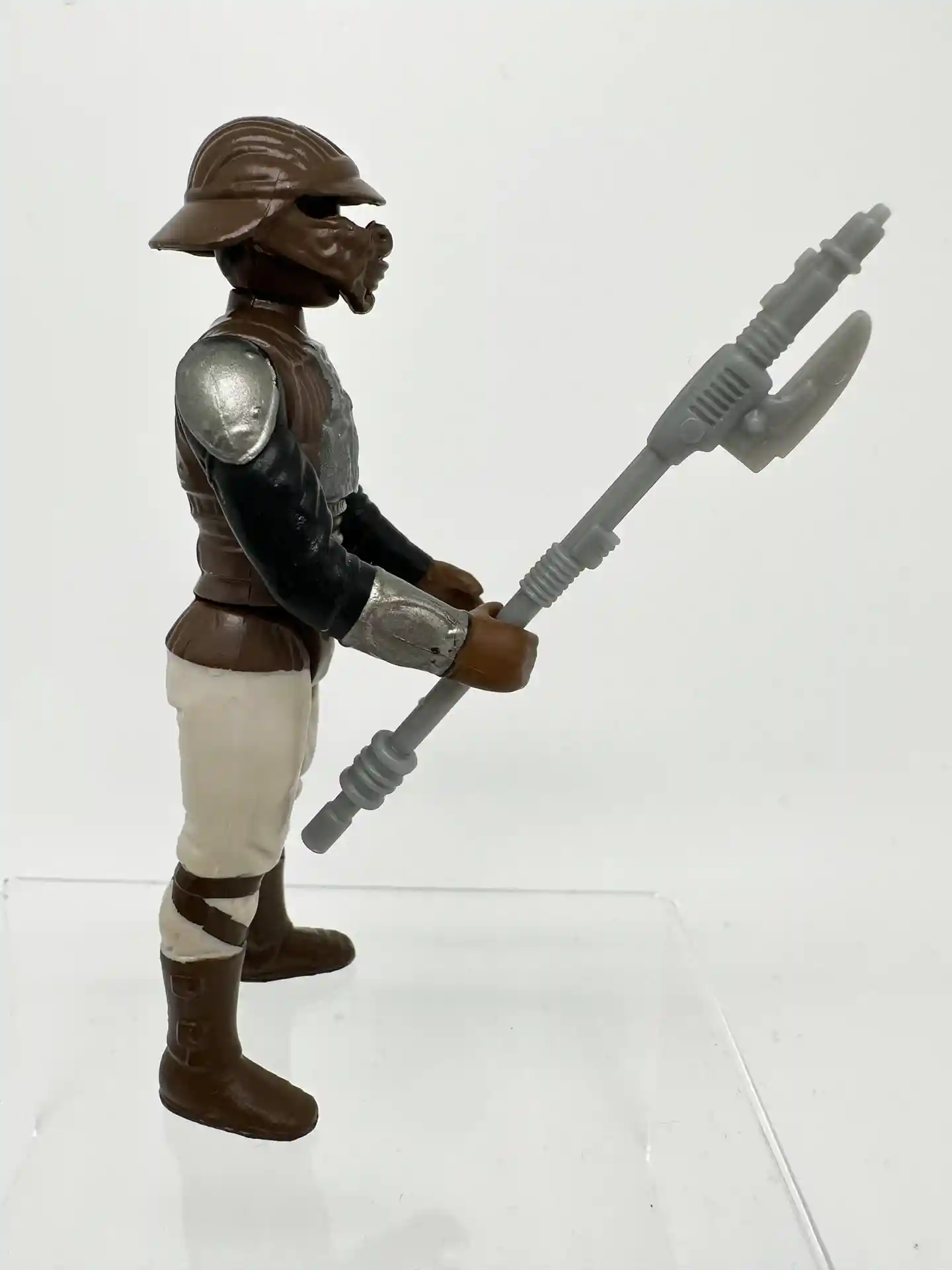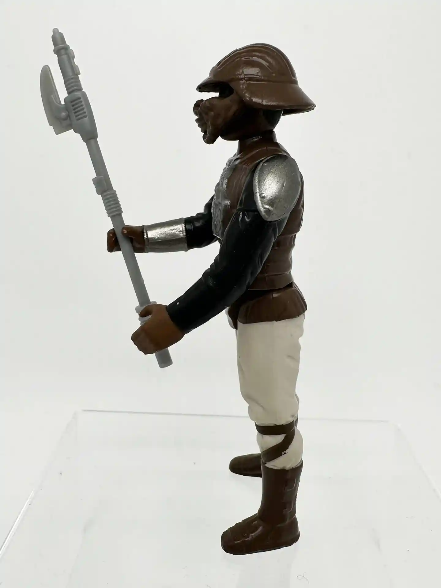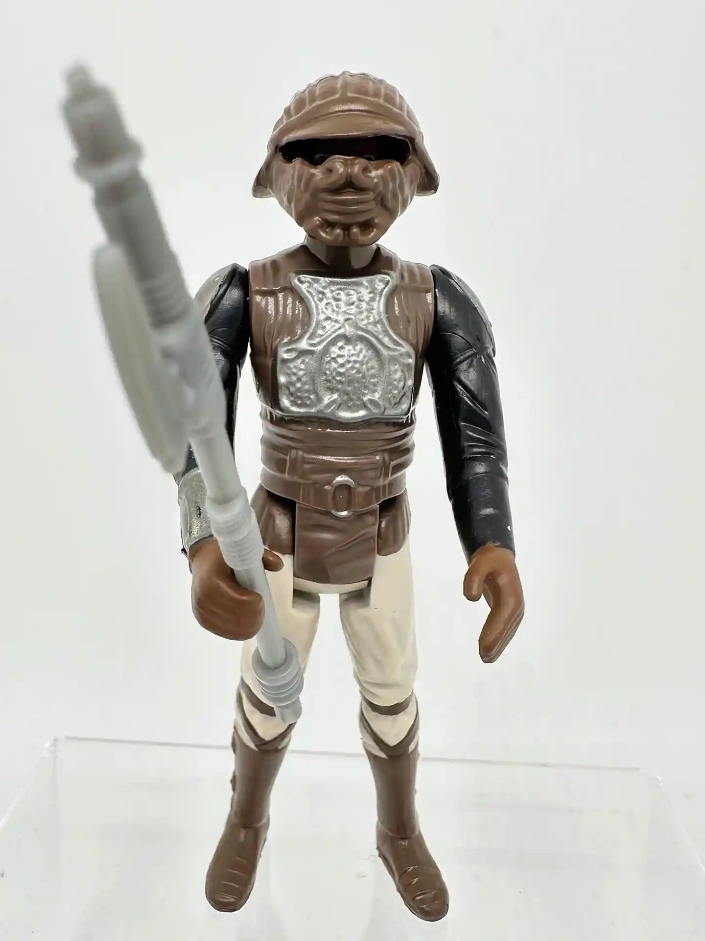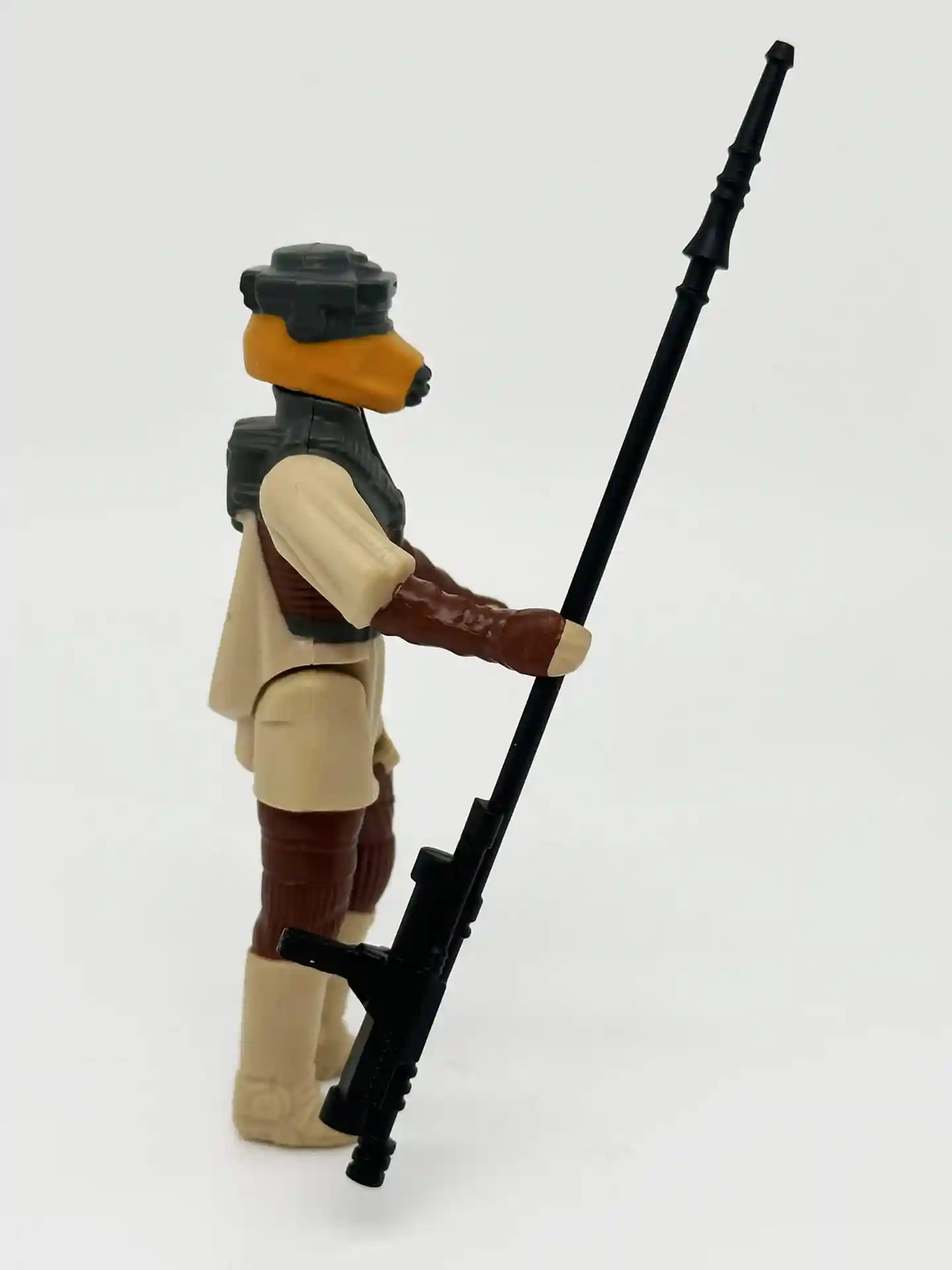 Lando Clarrisson the smooth talking space pirate, dawns a Skiff Guard outfit to go undercover to help rescue Han Solo. When his old friend Han Solo was held captive by Jabba the Hutt, Lando joined Princess Leia in a mission to rescue him from Jabba’s palace. Lando too was a very memorable figure and unique as since he also came with a separate helmet to complete his disguised look. Lando has a very kind looking face and bright white eyes that peek thru that Skiff helmet of his! We all remember the scene in Jabba’s Palace when Lando sneaks in and helps to free Han Solo! Now you can recreate that memorable scene! Lando comes complete in his Skiff Guard outfit with his staff and helmet.